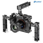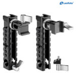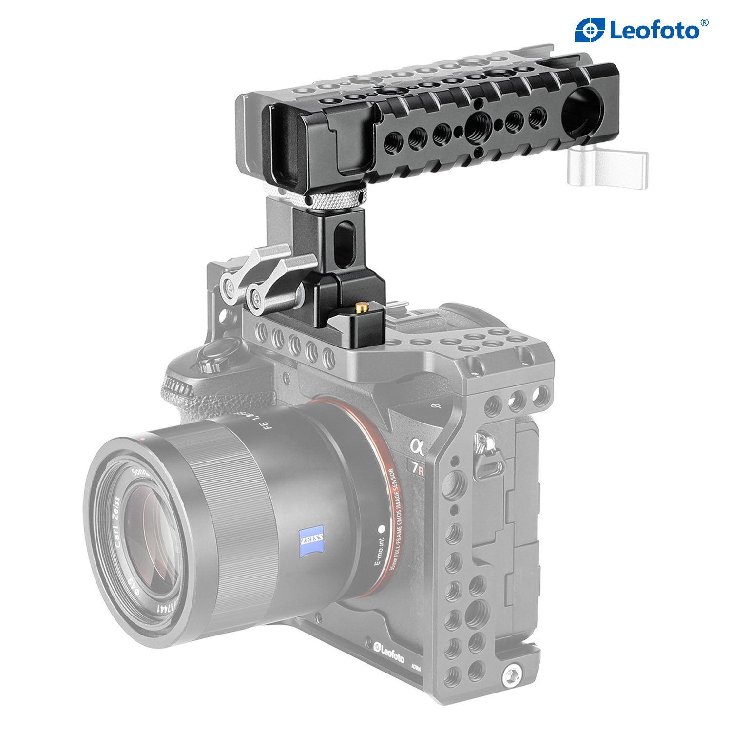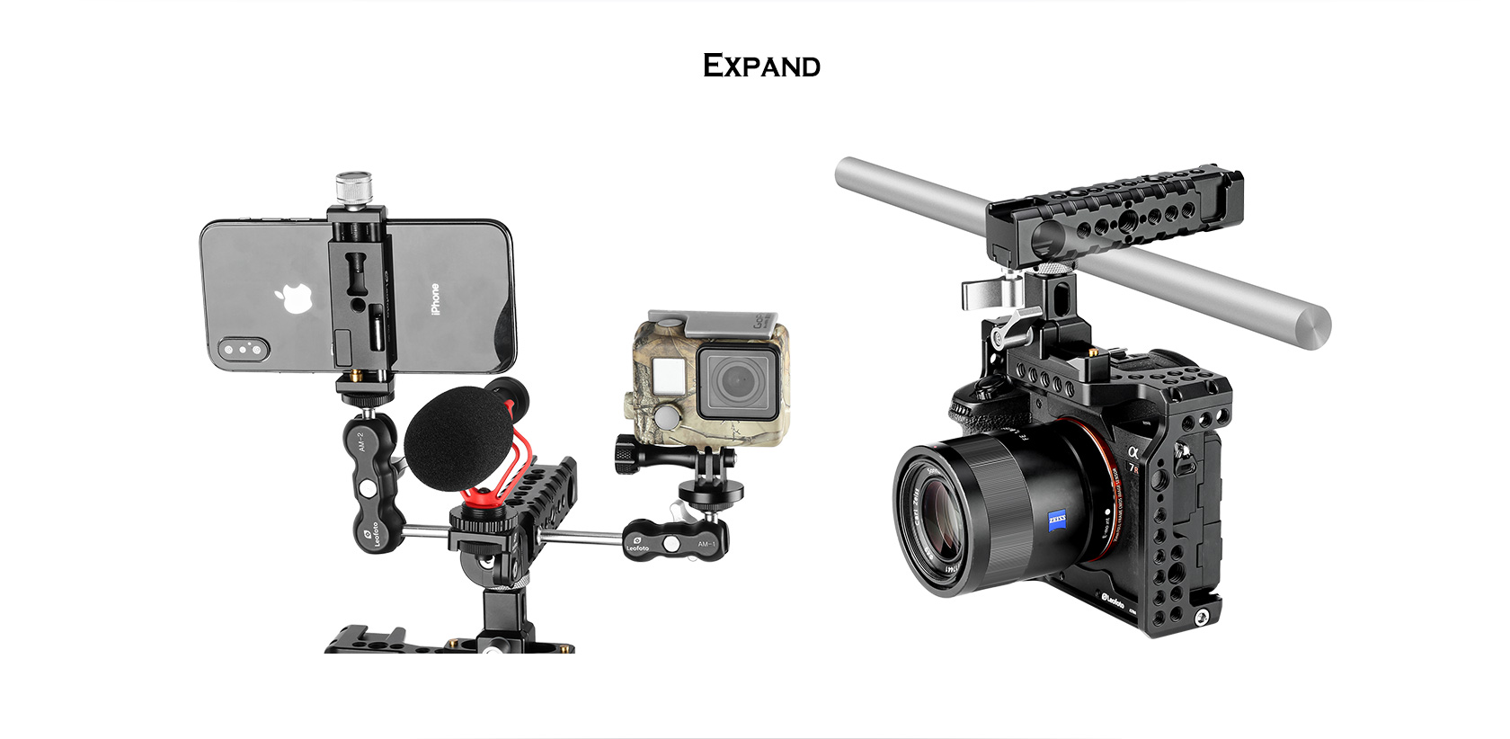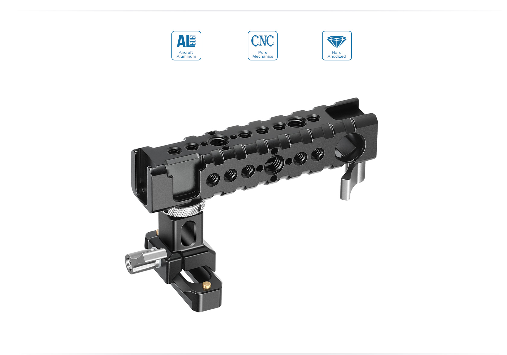The handle is CNC machined from 6061-T6 aluminum and hard anodized making it light weight and durable. It features various mounting sockets along the handle that allow simultaneously mounting microphone, LED light, monitor, and other accessories. Overall, the lightweight and practical handle can provide a wide range of mounting points and an excellent shooting experience.