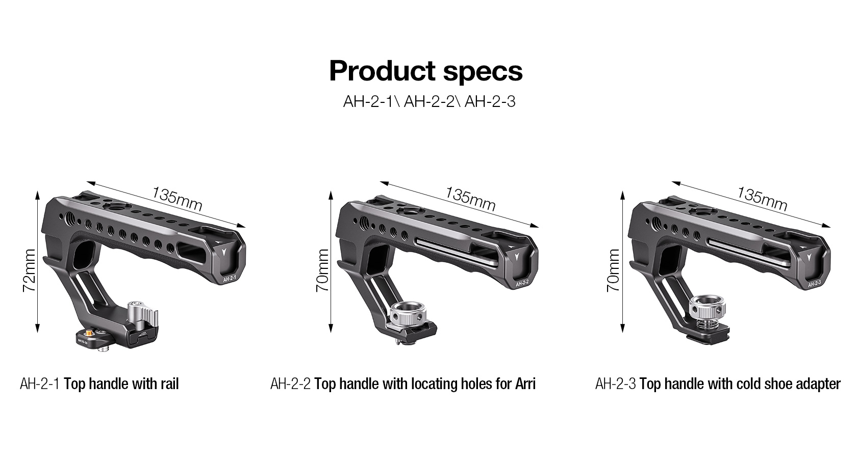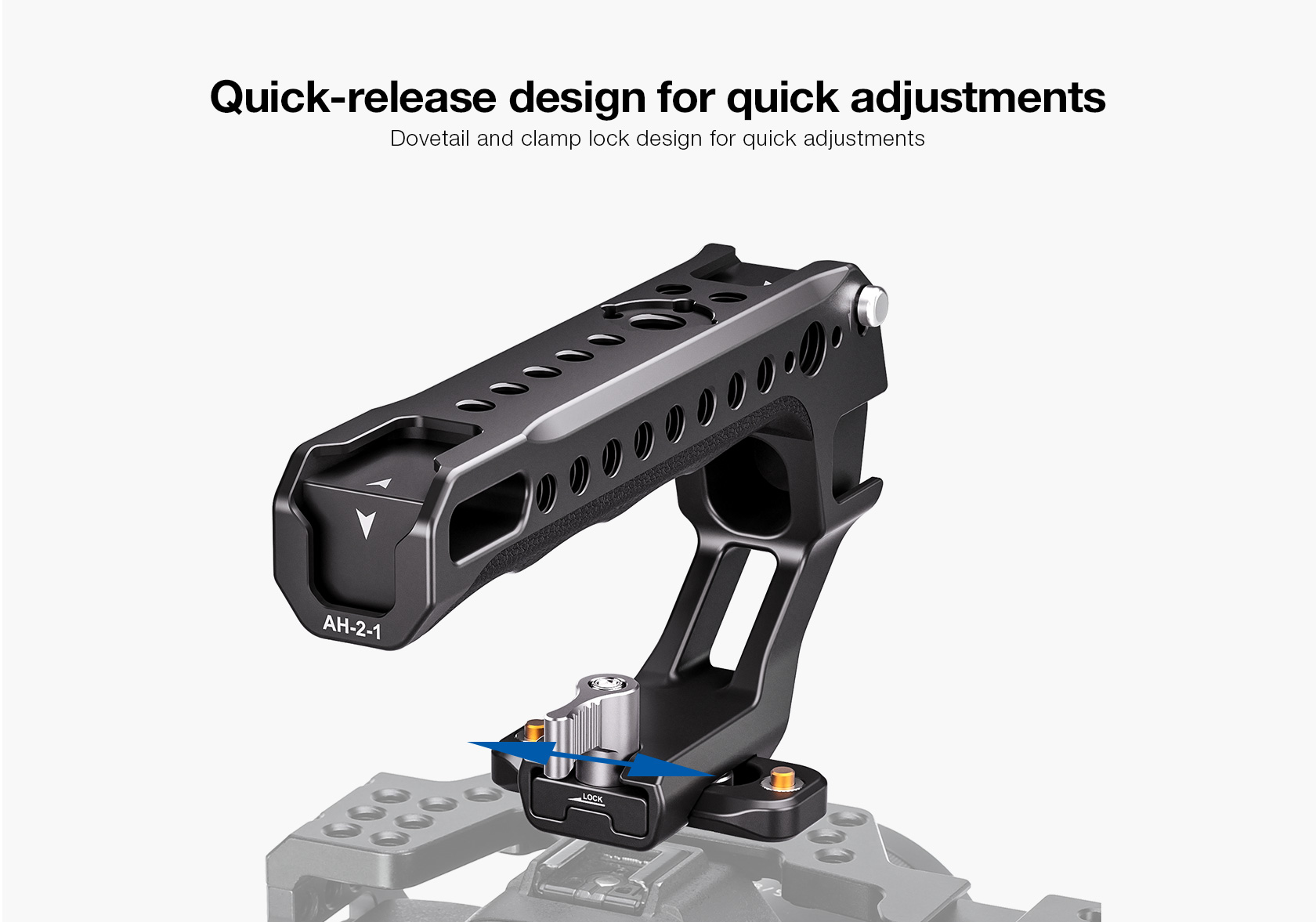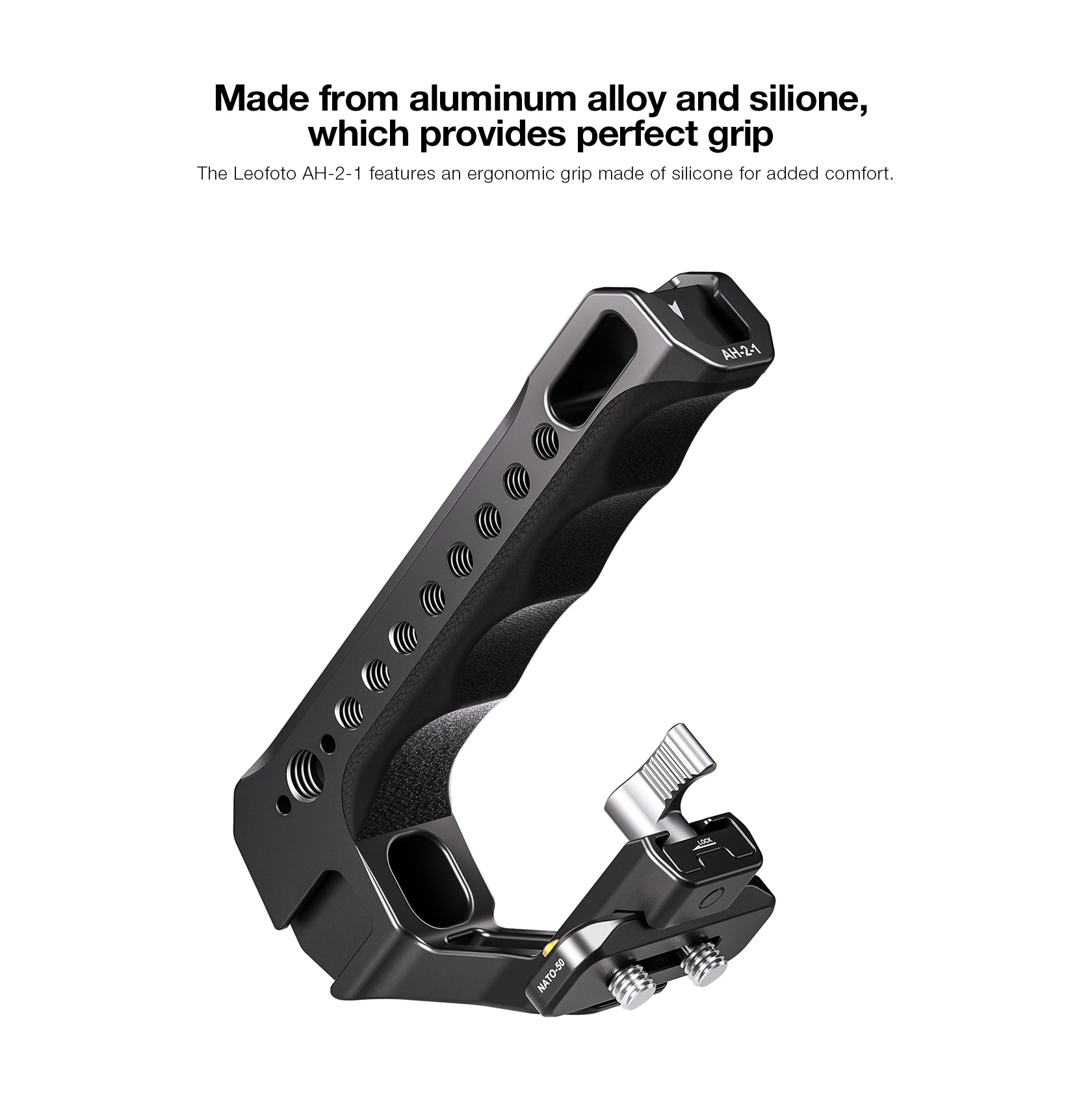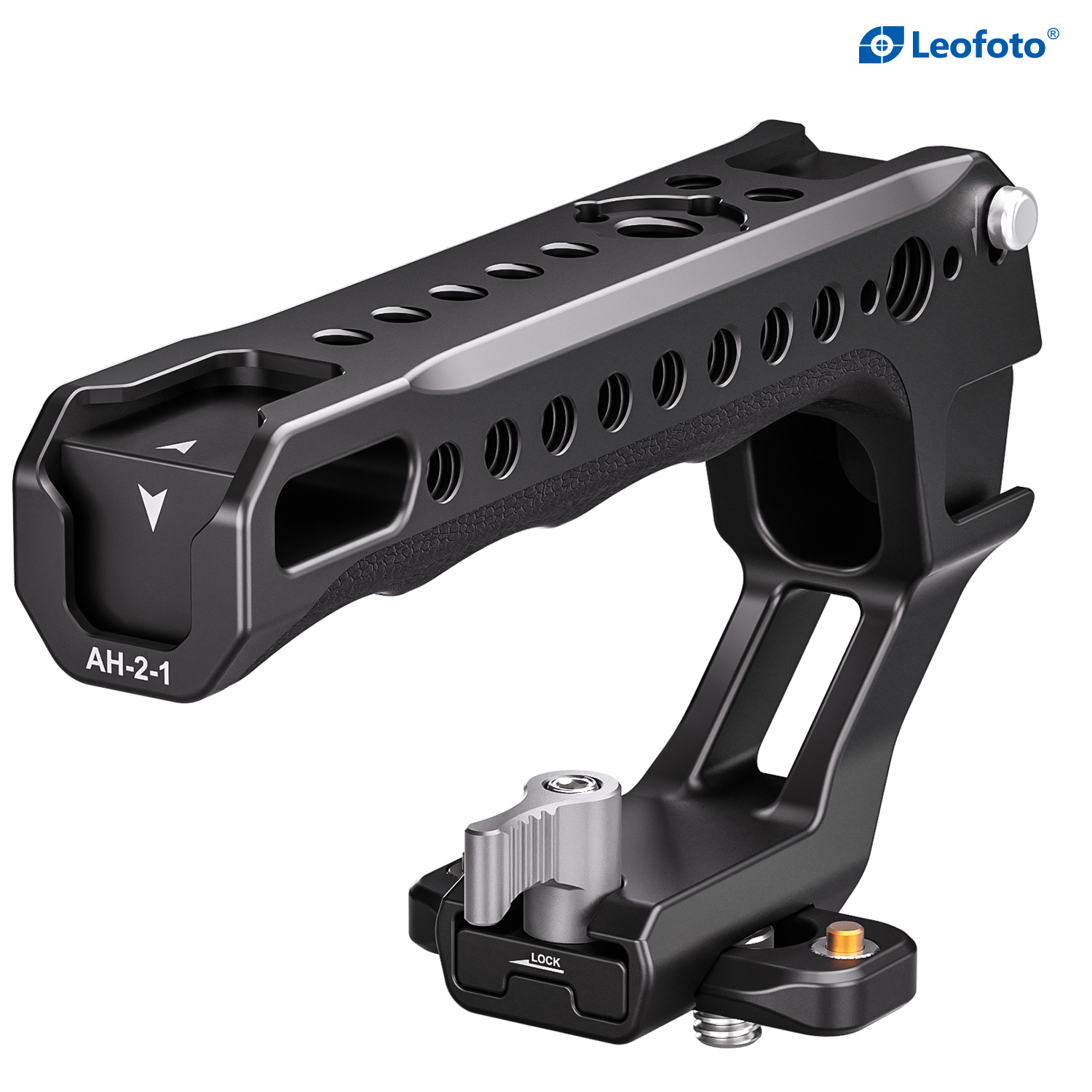 The Leofoto AH-2-1 Top Handle with NATO/Picatinny Rail is designed to facilitate low-angle shot and reduce burdens on arms. The handle is CNC machined from 6061-T6 aluminum and hard anodized making it light weight and durable and has an ergonomic silicone grip for added comfort. It features various mounting sockets along the handle that allow simultaneously mounting microphone, LED light, monitor, and other accessories. Overall, the lightweight and practical handle can provide a wide range of mounting points and an excellent shooting experience.