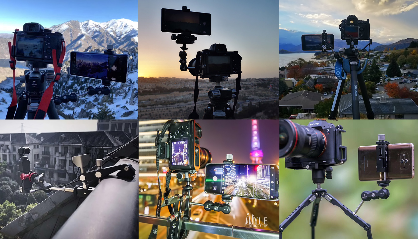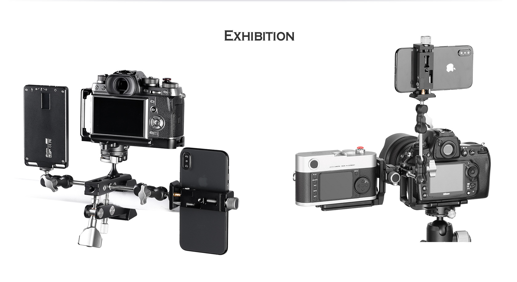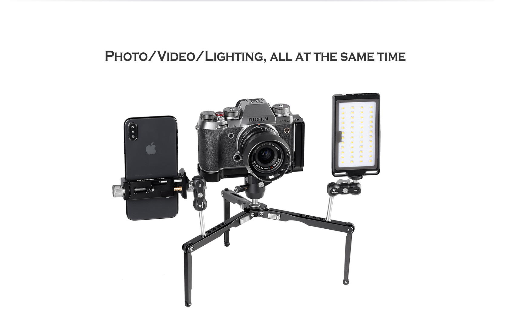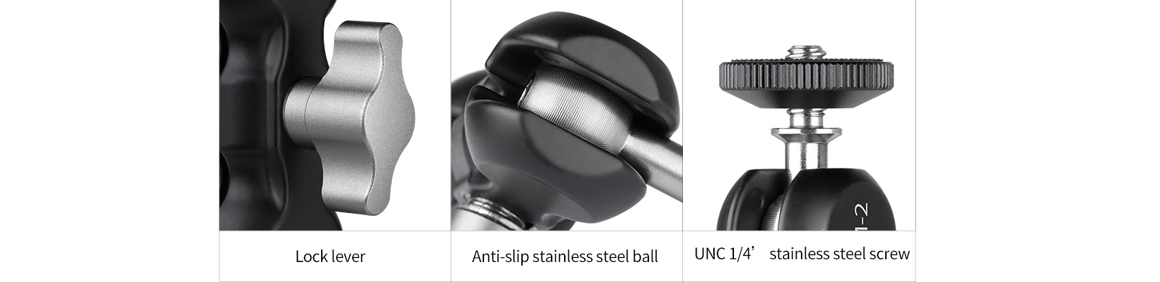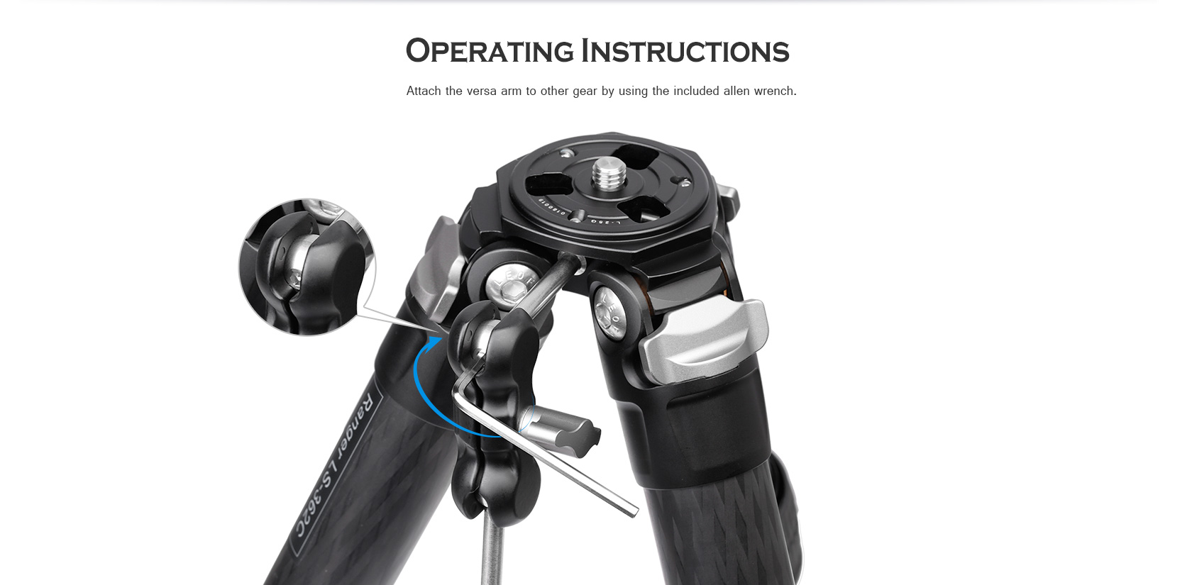 The Leofoto AM Series “Heavy-Duty” Versa Magic Arm is a multi-purpose tripod accessory that attaches to the leg of select Leofoto tripods, or other tripods and camera brackets with a 1/4″-20 accessory slot. Each end of the magic arm features a ball-and-socket joint that rotates 360°, and the center elbow joint locks in any position.