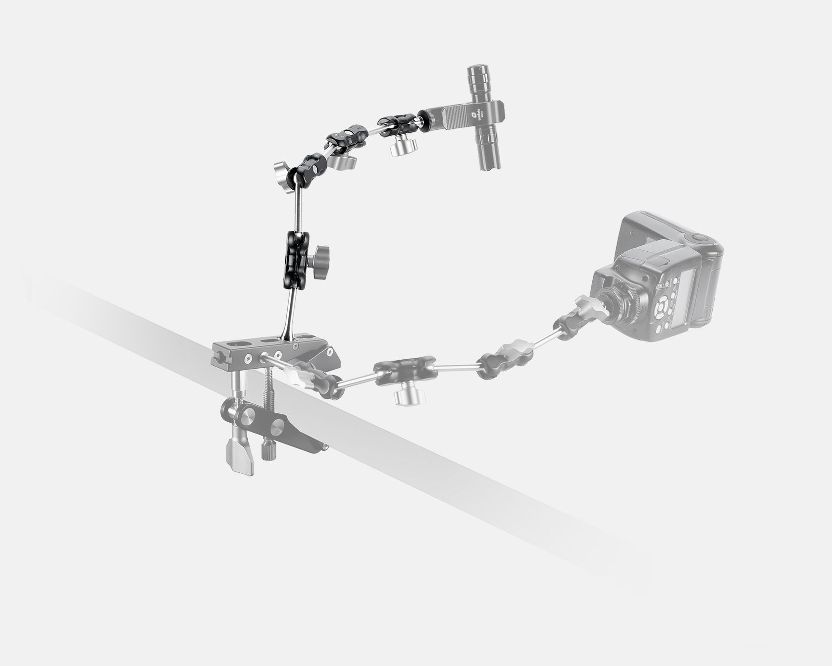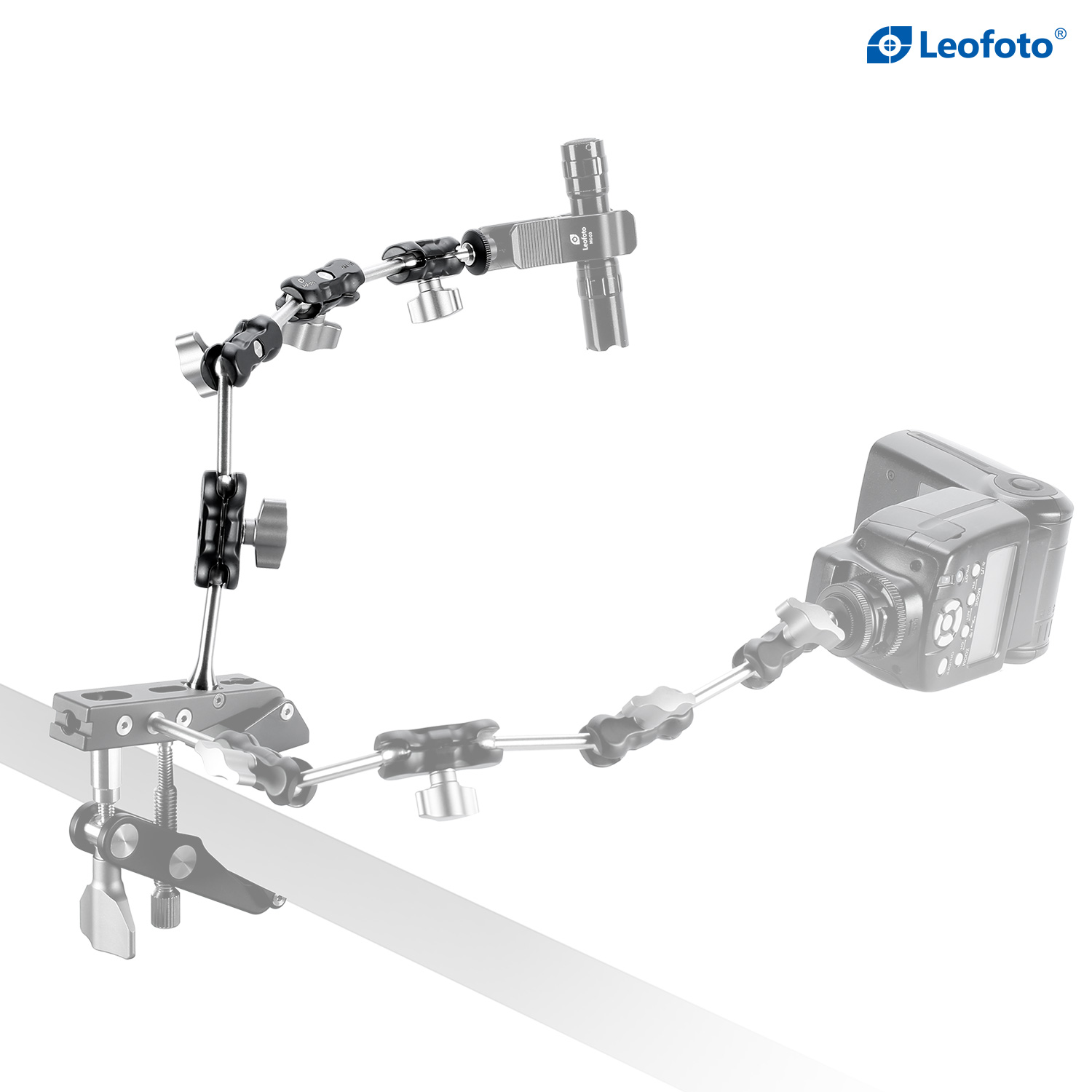 The Leofoto AM Series “Heavy-Duty” Versa Magic Arm is a multi-purpose tripod accessory that attaches to the leg of select Leofoto tripods, or other tripods and camera brackets with a 1/4″-20 accessory slot. Each end of the magic arm features a ball-and-socket joint that rotates 360°, and the center elbow joint locks in any position.