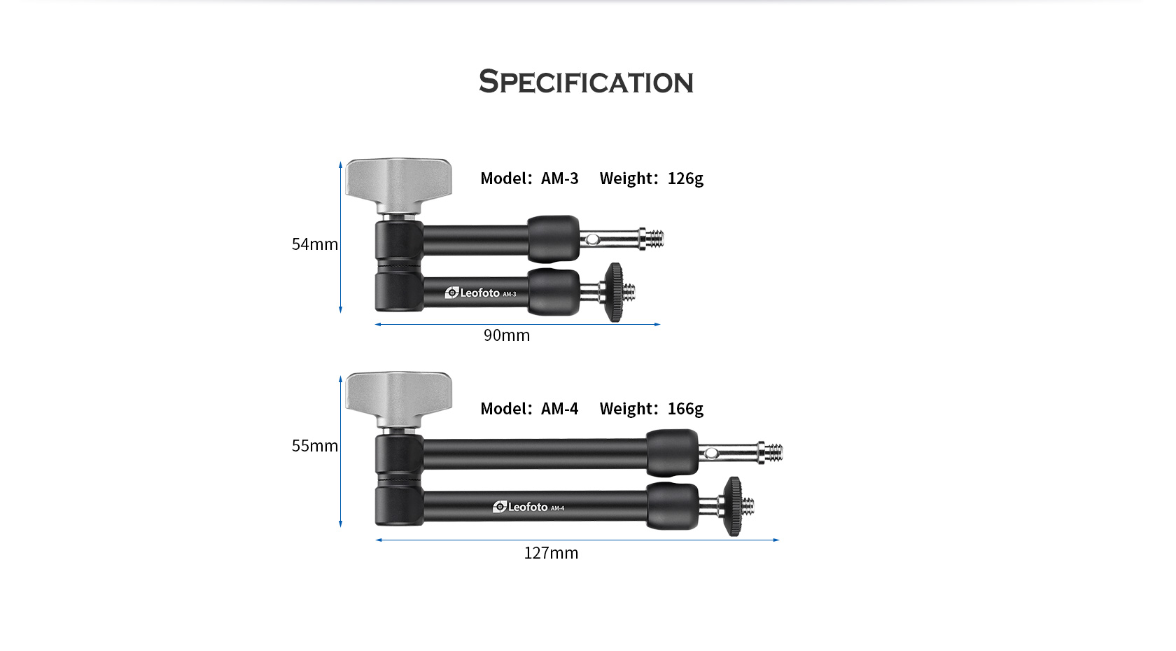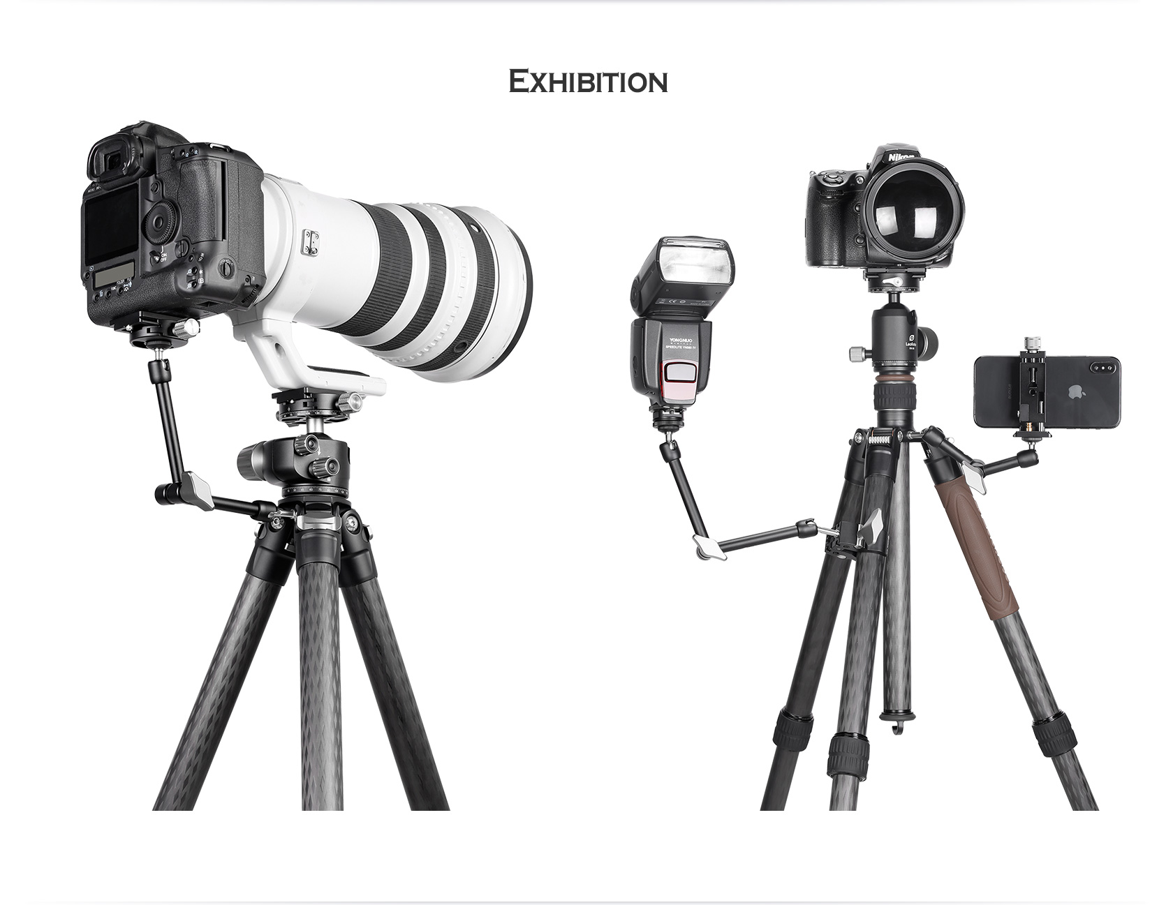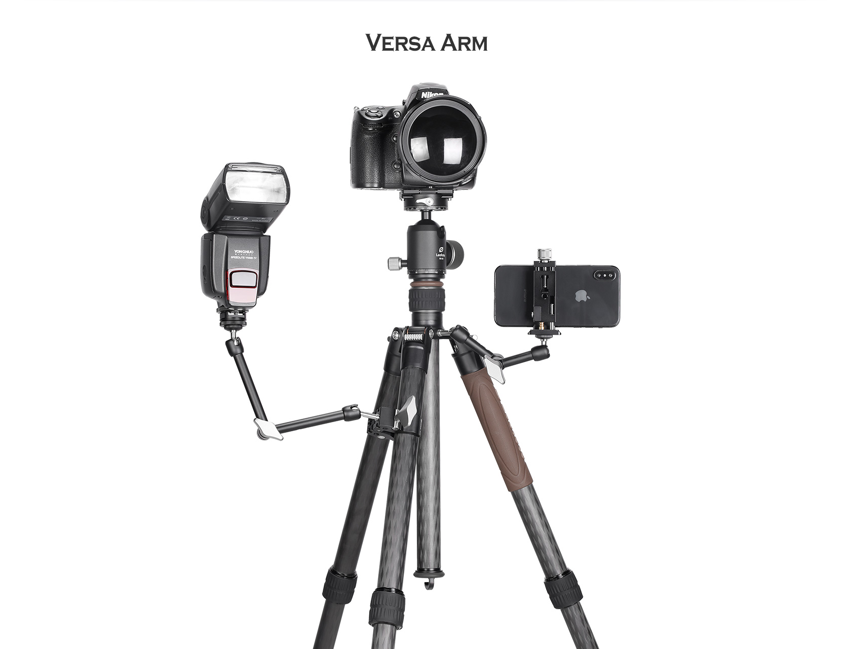 The Leofoto AM Series Versa Magic Arm is a multi-purpose tripod accessory that attaches to the leg of select Leofoto tripods, or other tripods and camera brackets with a 1/4″-20 accessory slot. The magic-arm allows a light, microphone, monitor, smartphone, tablet, or even an additional camera to be affixed to a camera rig without the added bulk of a clamp. Each end of the magic arm features a ball-and-socket joint that rotates 360°, and the center elbow joint locks in any position. The large, easy-to-grip center knob locks all three movements simultaneously for quick and easy setup and repositioning.