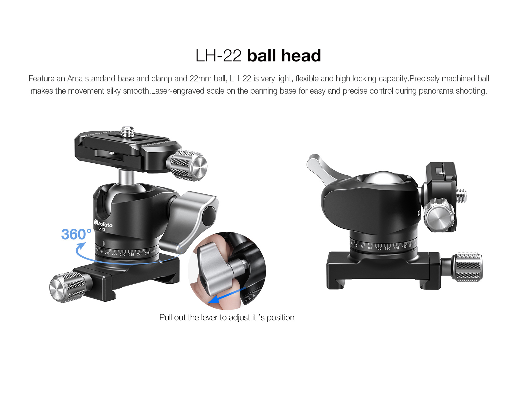The LH-22 Ball Head with Arca Clamp is a versatile and adjustable accessory that is designed to securely hold your spotting scope or camera. With its ability to independently maneuver one of the installed items, it is perfect for tracking moving targets. Please note that this is not a standard LH-22, as it is permanently attached to an Arca clamp, which allows for easy attachment to the rail.