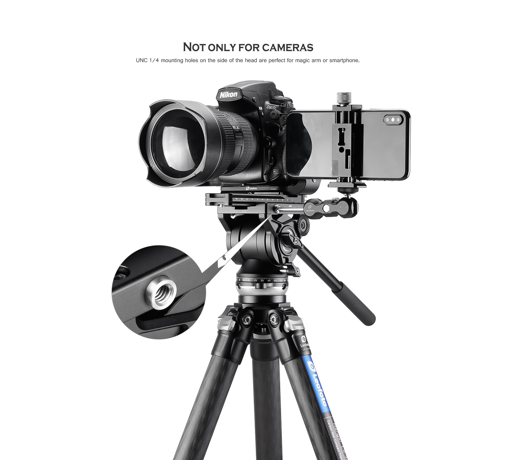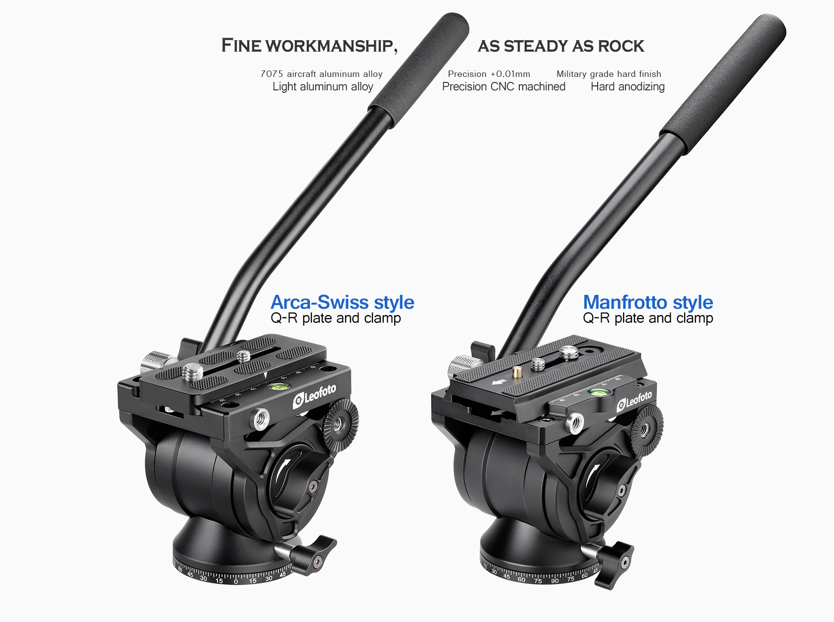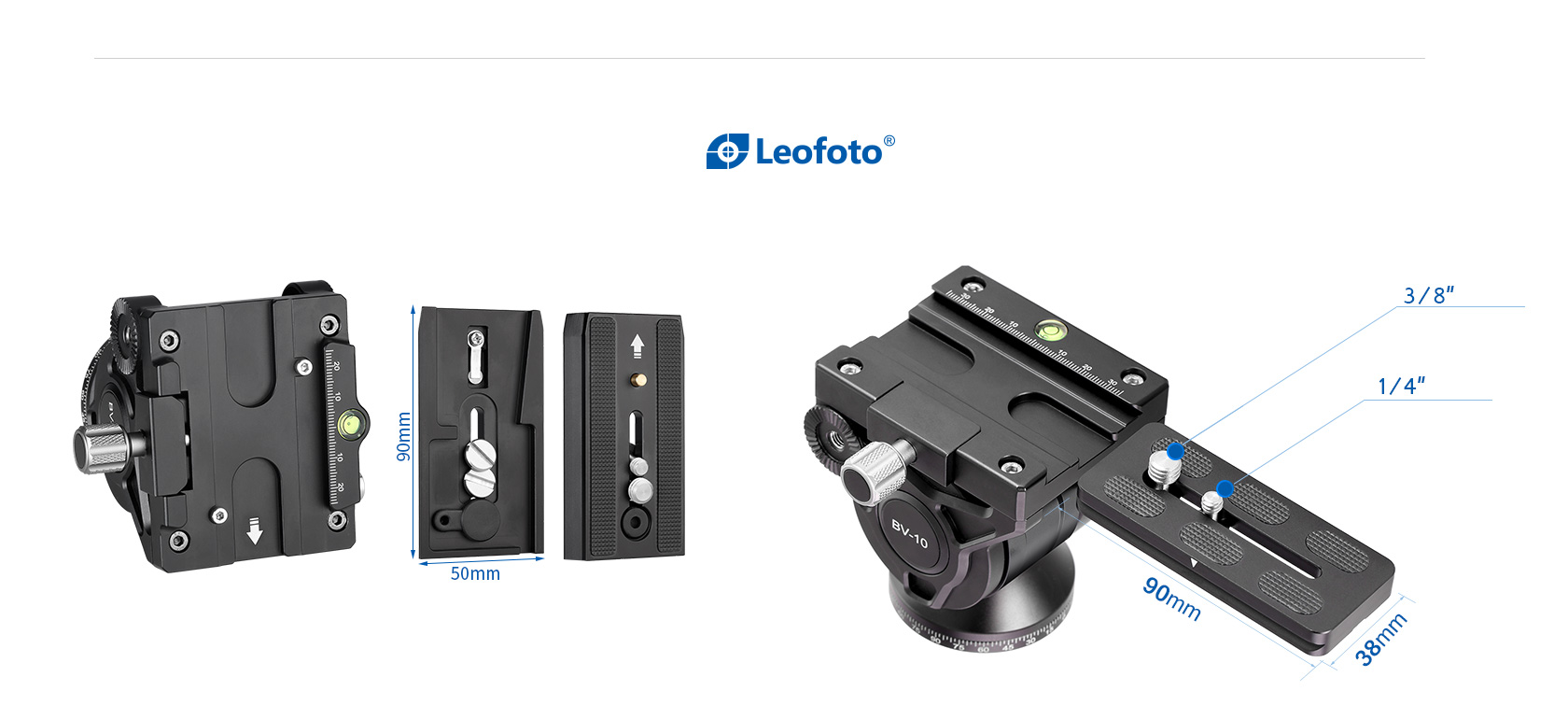Lightweight and compact, this Leofoto BV-10(Arca)/BV-10M (Manfrotto) Fluid Video Head is suitable for DSLRs, mirrorless cameras, and compact camcorders weighing up to 11 lb. Featuring both a 1/4″-20 and 38″-16 mounting screw, the head accepts a wide variety of cameras. The head features a 60mm flat base that can mount on compatible tripod legs, a slider carriage, or other platforms with a 3/8″-16 mounting screw.