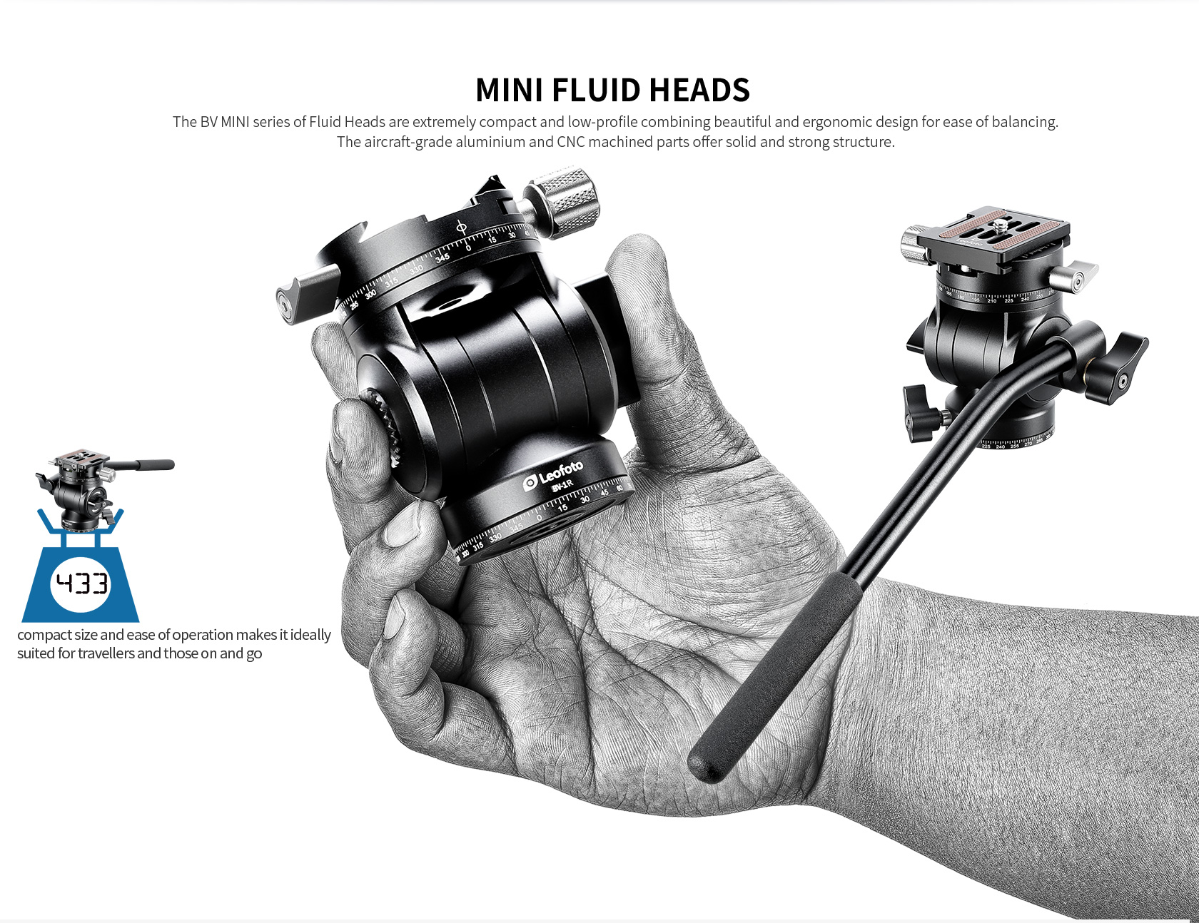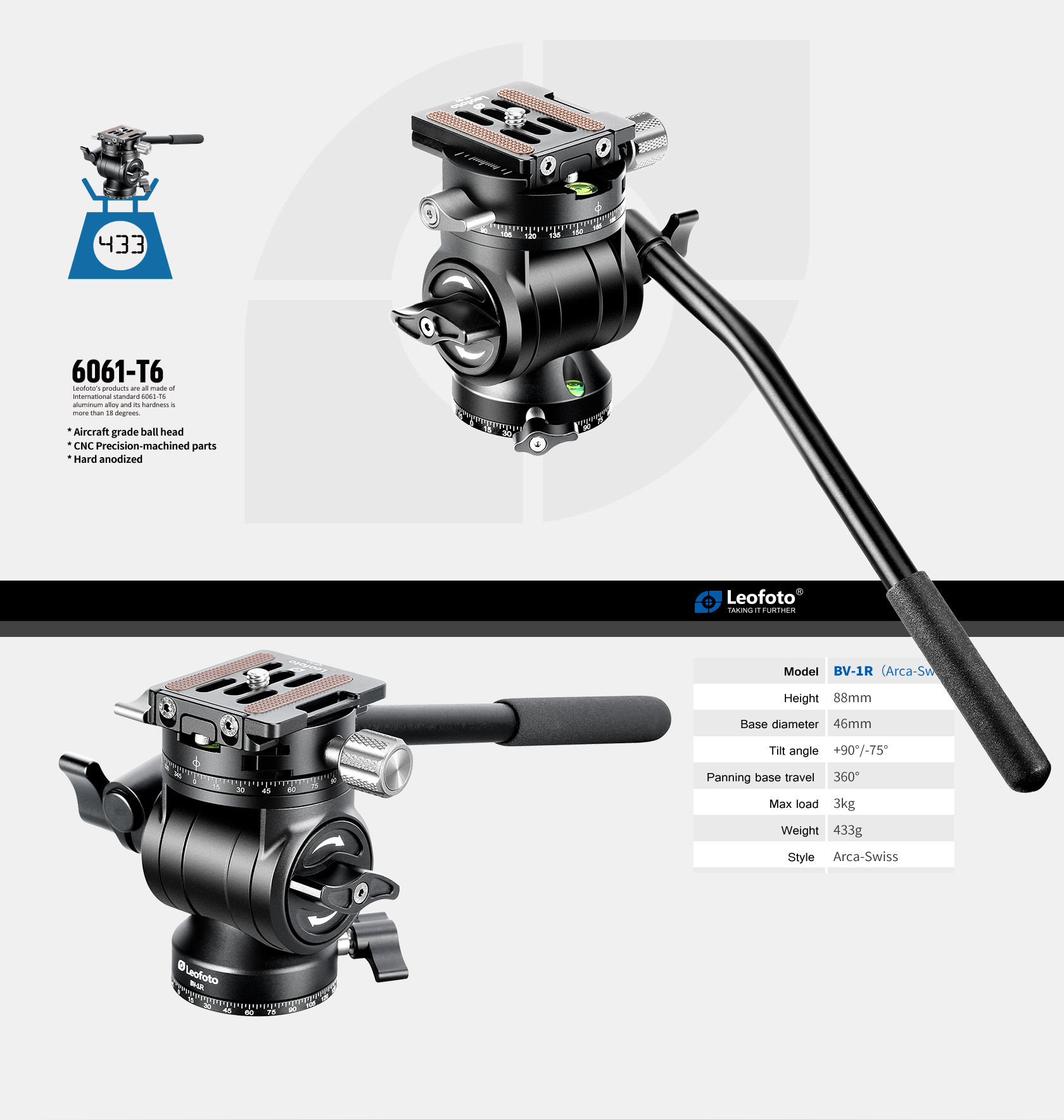 The Leofoto BV-1R Fluid Video Head is a compact fluid video head with a flat base. Constructed of durable lightweight 6061-T6 aluminum, the head weighs just under 1 lb but can support a payload of up to 6.6 lb. The BV-1 uses an Arca-type quick release plate and features measurement markings on its base. The tilt and pan lock design allows locking one axis while adjusting the other, and the 360° panning and -75 to 90° tilting flexibility provide a wide range of movement to get the perfect shot. Supports Ccopes, Binoculars, and Cameras that weigh up to 7 lbs.