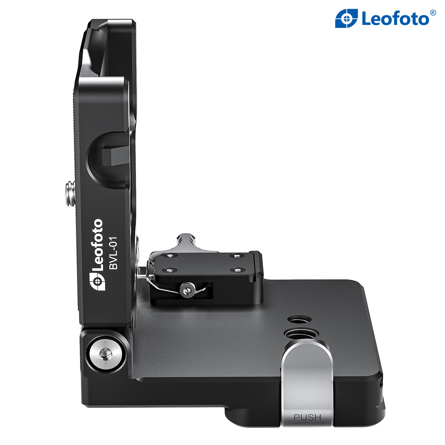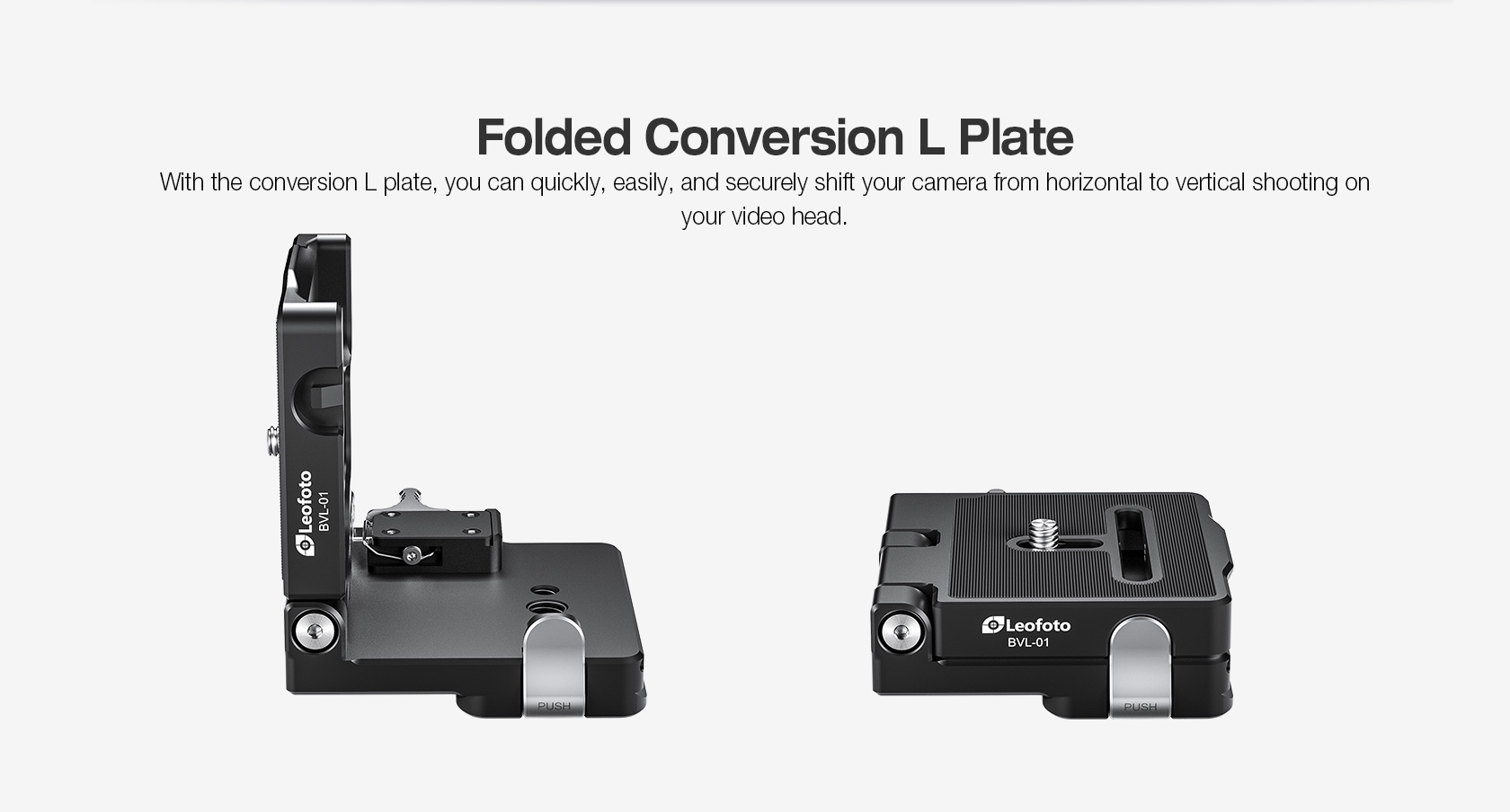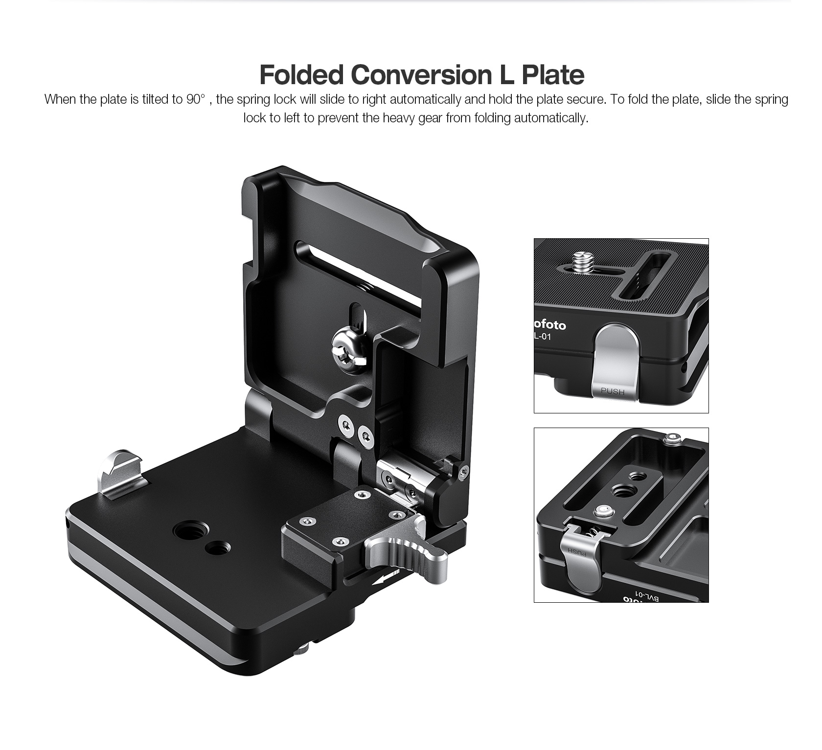 When the plate is tilted 90 degrees, a spring-loaded locking mechanism will lock the plate automatically and securely. An additional safety mechanism is used to prevent heavier equipment from causing the plate to fold up unintentionally. The bottom of the BVL-01 is equipped with threaded holes in 3/8 and 1/4″. The fixing screw on the top is 1/4″ thread.