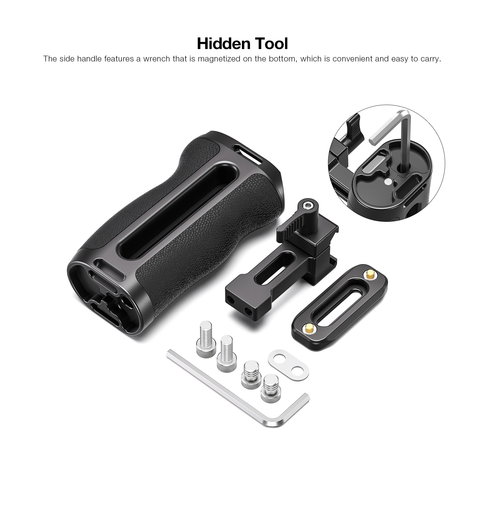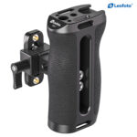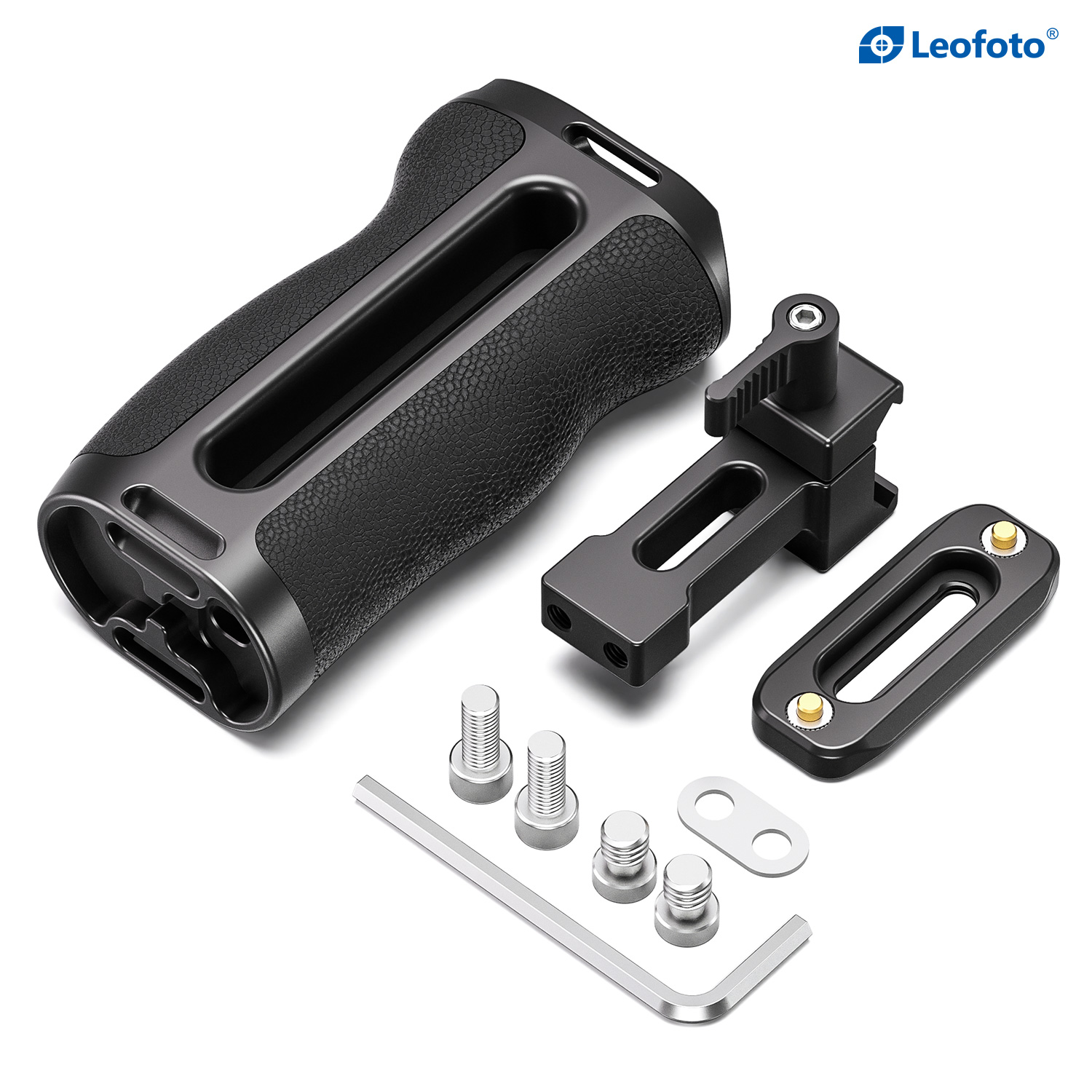 The Leofoto CH-7-1 Side Handle with NATO/Picatinny Rail is designed for mirrorless, digital, and other small cameras to provide a comfortable grip for increased stability with access to accessory mounts for cameramen. It is attached via a NATO/Picatinny clamp to the side of the camera cage. The CH-7-1 features 3/8”-16, 1/4“-20 and cold shoe accessory mounts on top to add a mounting arm, light, mic, strap or other accessories. This side handle is adjustable to fit different cage heights and can quickly switch between left-handed or right-handed orientation with the built-in allen wrench. Made of hard anodized aluminum, this handle features an ergonomic silicone grip to provide filmmakers with a smooth and comfortable shooting experience.