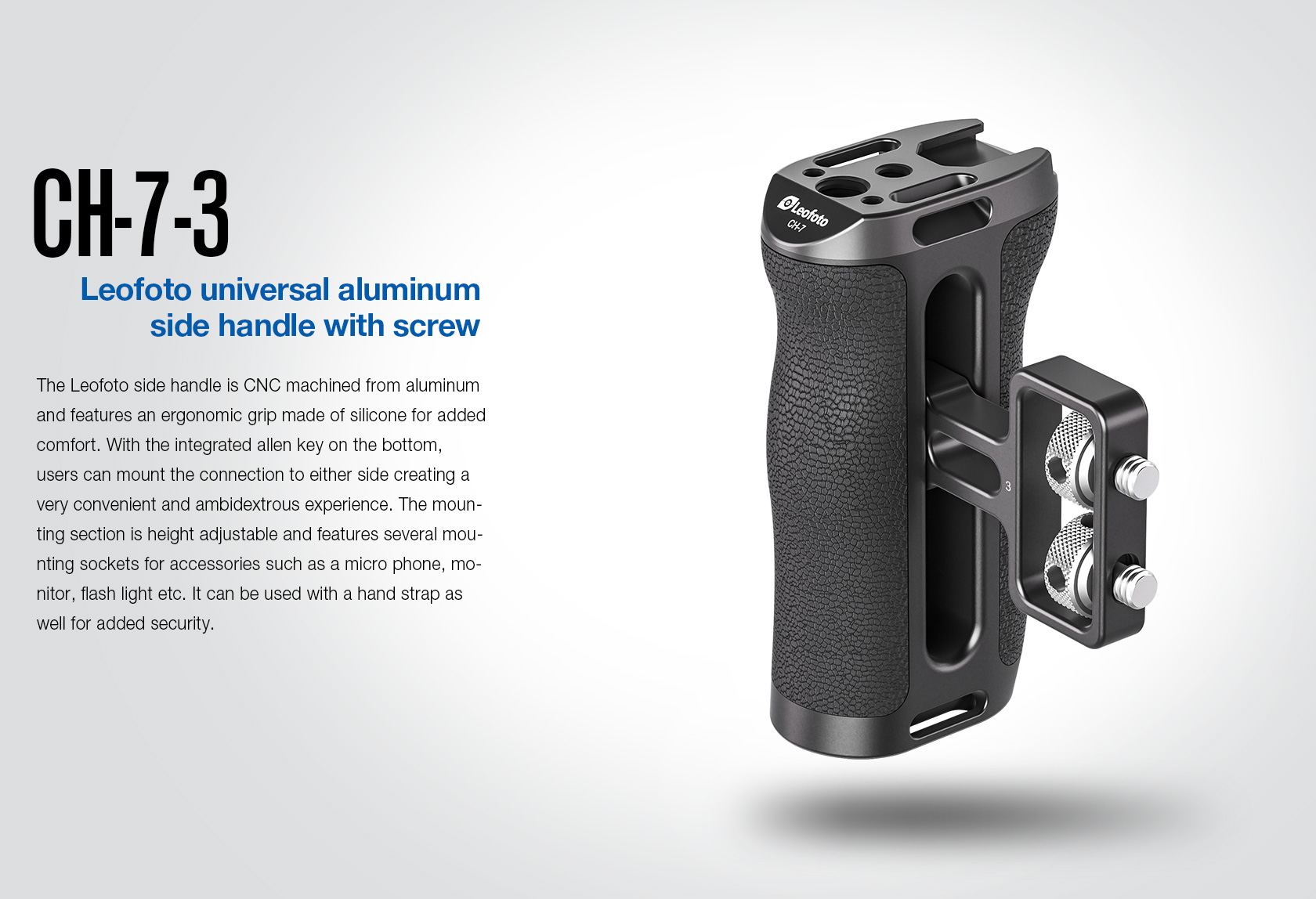 The Leofoto CH-7-3 Universal Side Handle is designed to provide a comfortable grip for increased stability with access to accessory mounts for cameramen. The handle attaches to almost any cage or camera rig featuring two 1/4”-20 threaded holes. The CH-7-3 features 3/8”-16, 1/4“-20 and cold shoe accessory mounts on top to add a mounting arm, light, mic, or other accessories. This side handle is adjustable to fit different cage heights and can quickly switch between left-handed or right-handed orientation with the built-in allen wrench. Made of hard anodized aluminum, this handle features an ergonomic silicone grip to provide filmmakers with a smooth and comfortable shooting experience.
