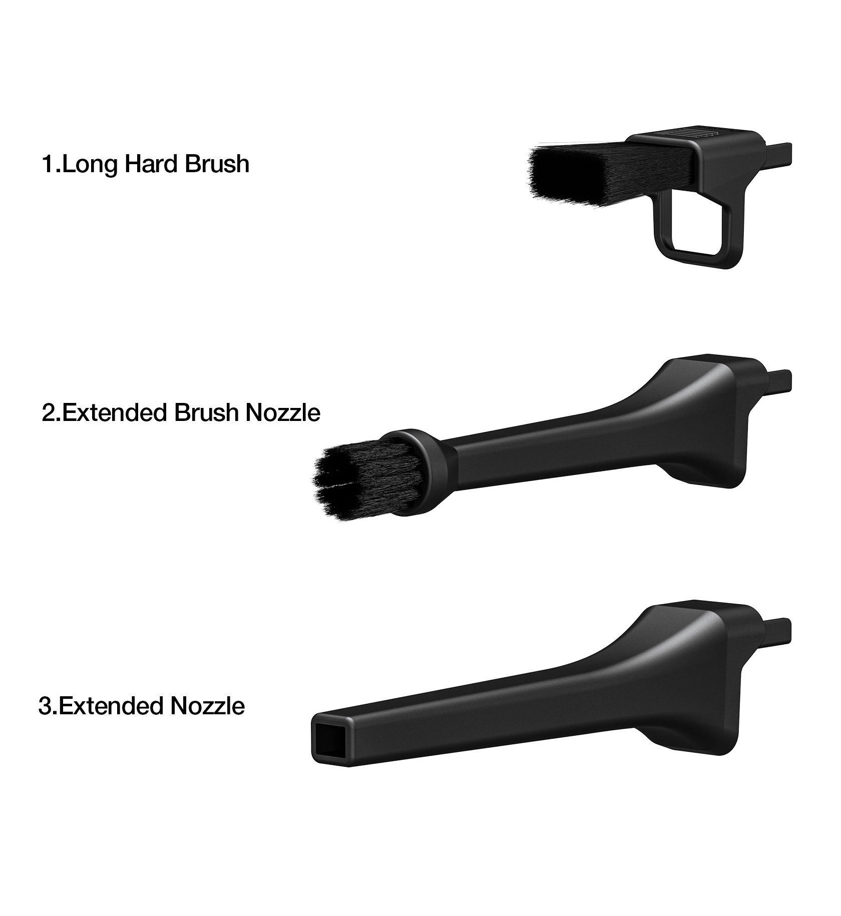 2. Extended brush nozzle for gentle dusting in tight spots.