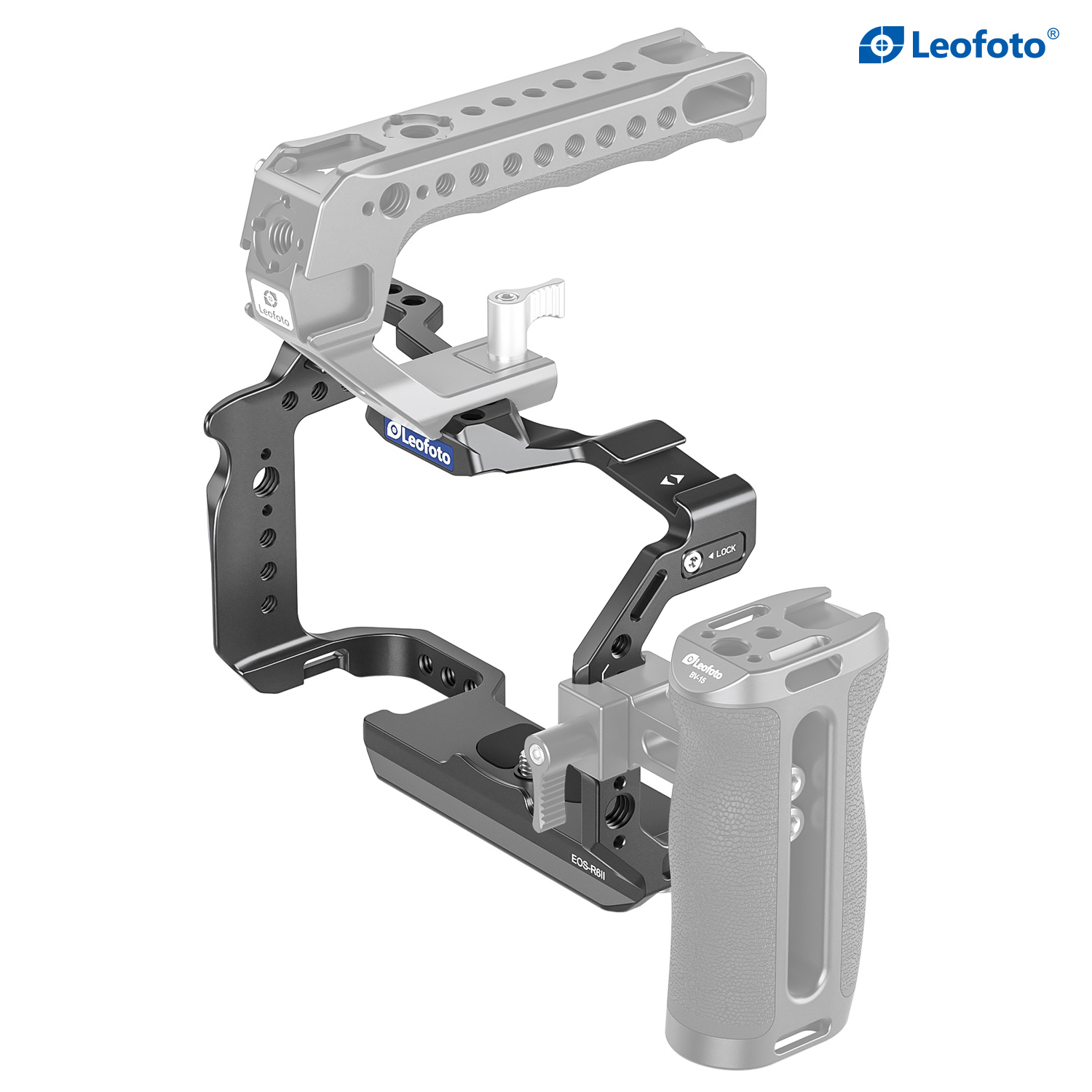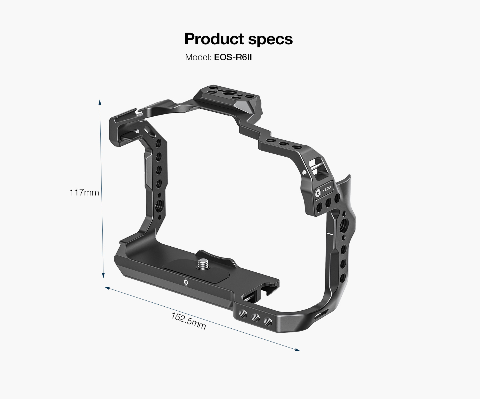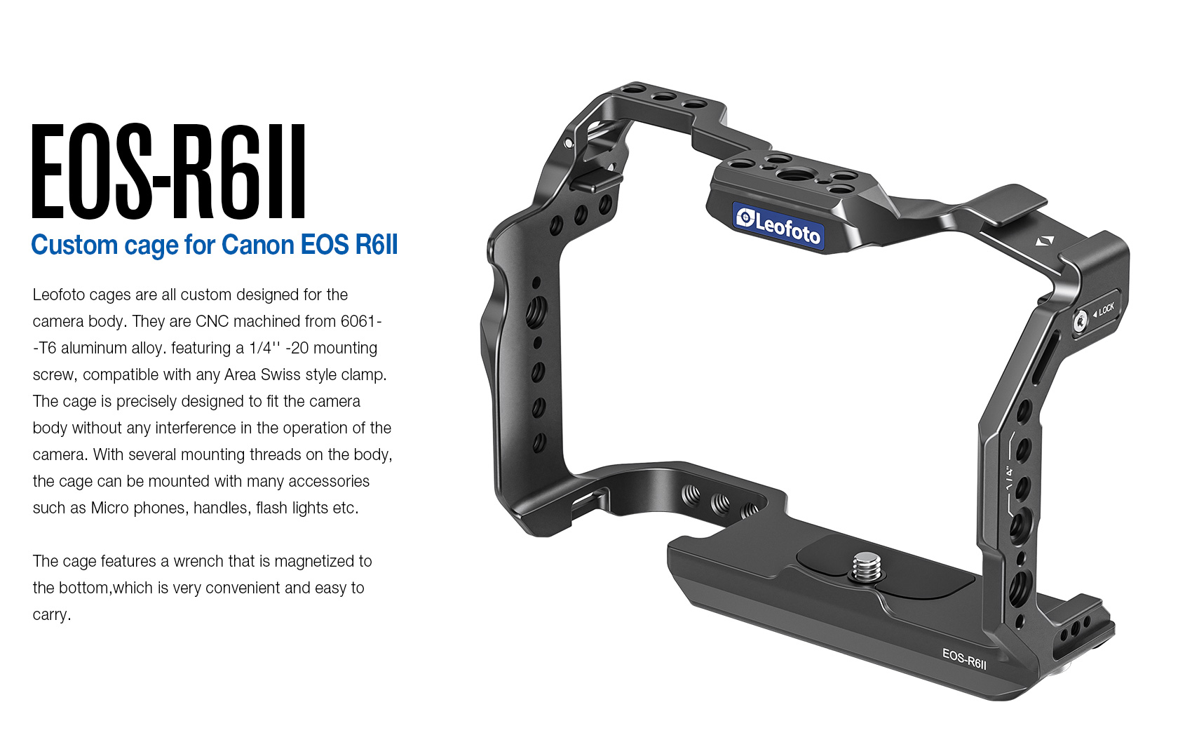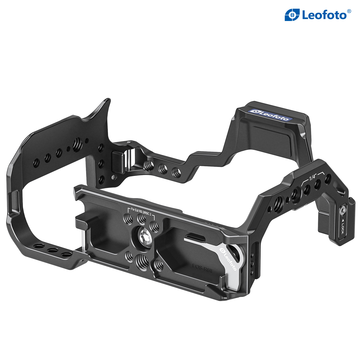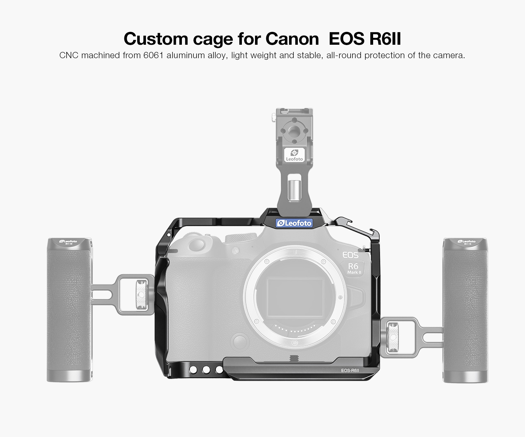 Protect your Canon EOS R6 Mark II / R6 Mark III from the rigors of the production day while also providing multiple accessory mounting points that won’t stress your camera’s body with this form-fitting Leofoto EOS-R6II Custom Cage for Canon EOS R6 Mark II / R6 Mark III Camera. The cage features one cold shoe mount on top of the cage and one on the side, as well as multiple 1/4″-20 and 3/8″-16 threaded accessory-mounting holes. The 3/8″-16 threaded holes feature anti-twist divots.