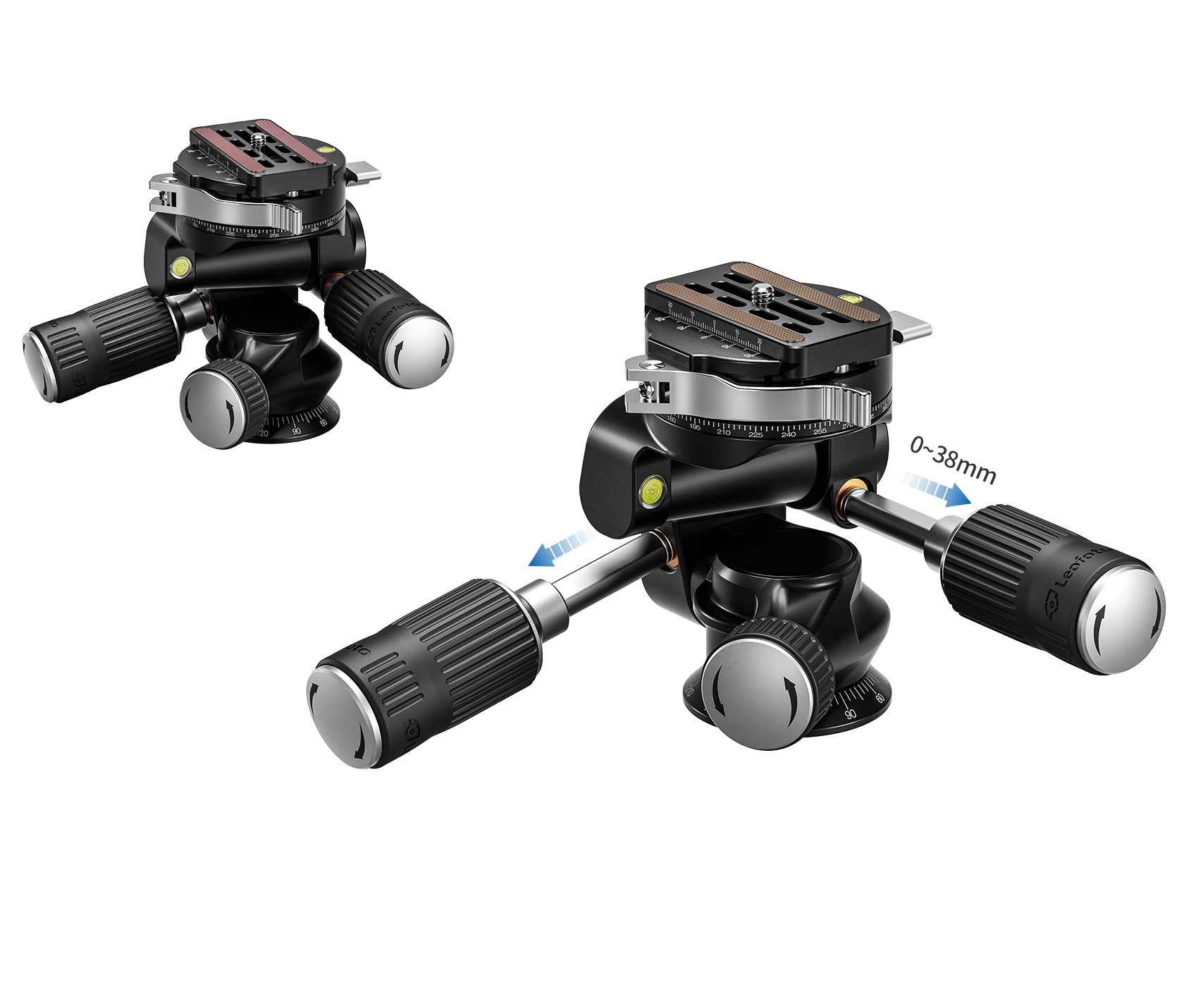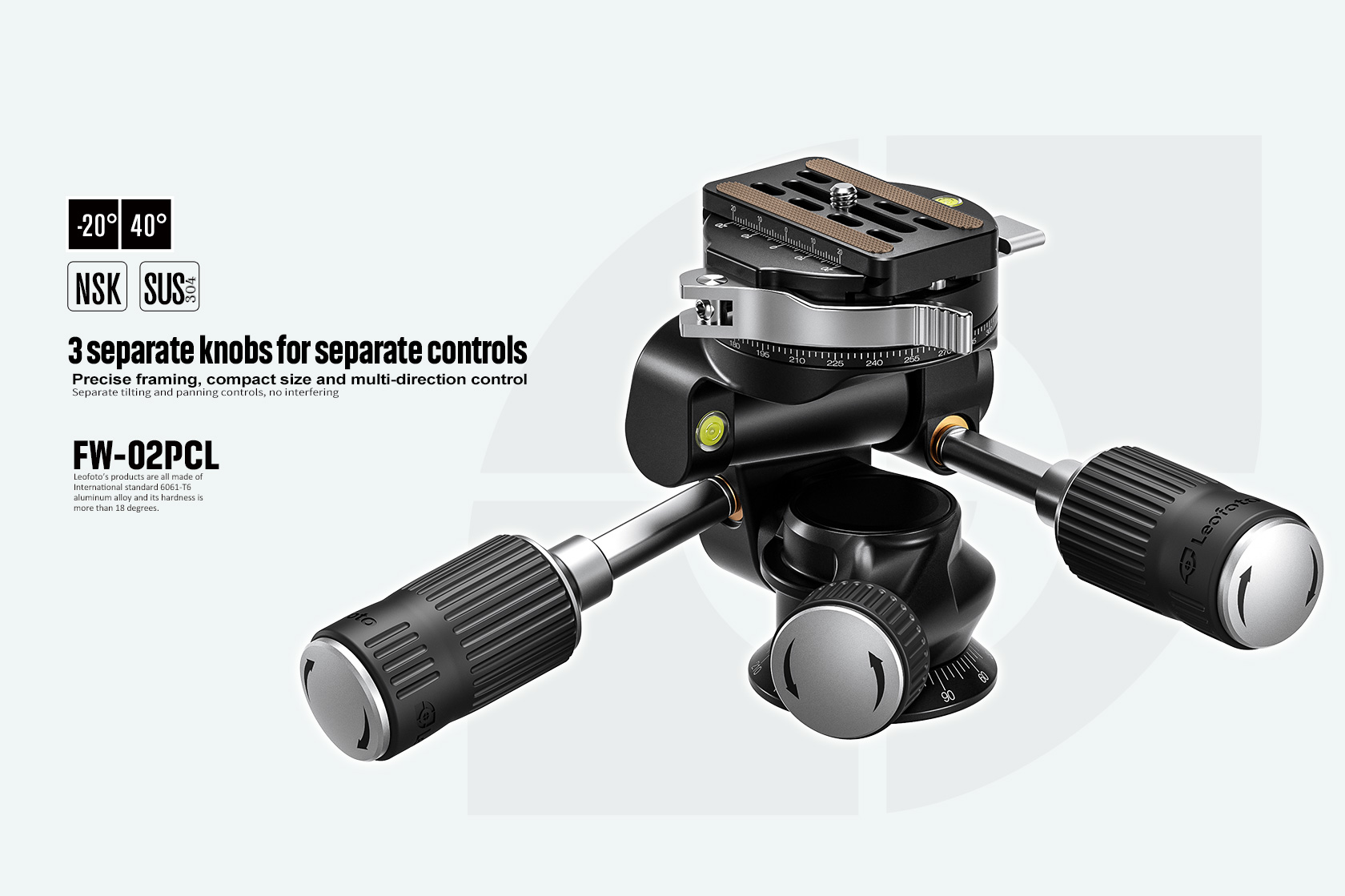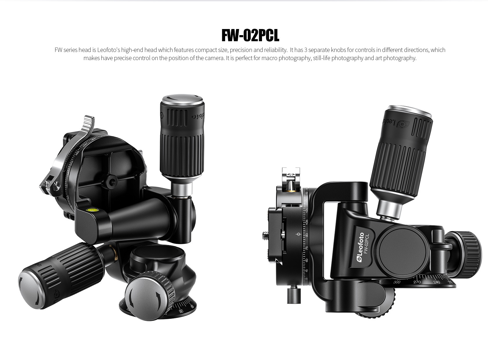 The Leofoto FW-02PCL Professional Pan-and-Tilt 3-Way Head is the perfect premium head for macro photography, still-life photography and art photography. The FW-02PCL features separate control knobs and levers for precise framing, compact size and multi-direction control. The two foldable levers can be rotated to lock the movement in place while the dials on the sides can be turned to adjust the tension for precise movements. The smallest knob is the panning lock.