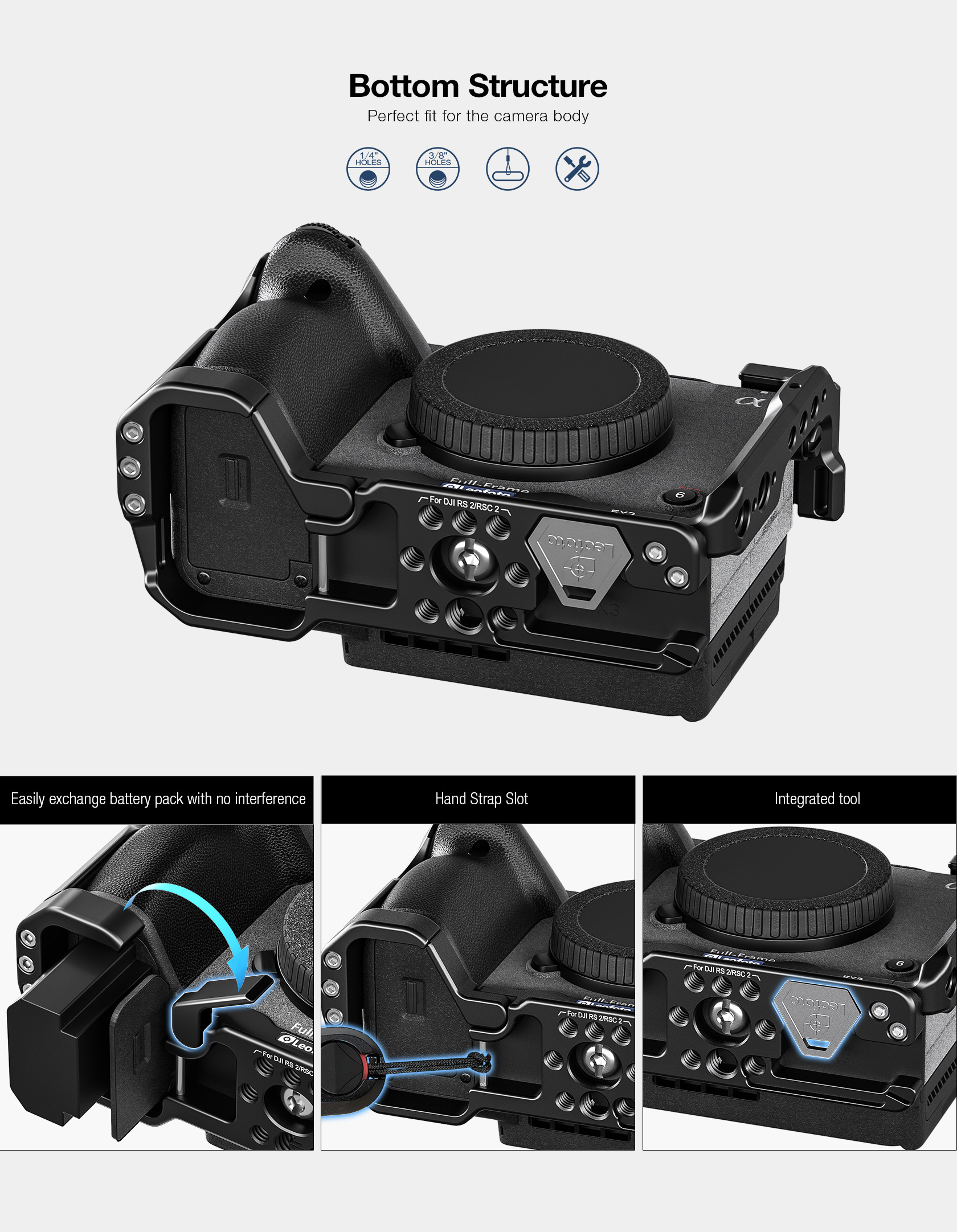In addition to one shoe mount and multiple 1/4″-20 and 3/8″-16 accessory threads, the durable aluminum cage features several ARRI-style accessory threads for preventing accessories from twisting when mounted on the cage. A magnetically mounted Allen wrench is stored in the bottom of the cage for tightening the camera screw.