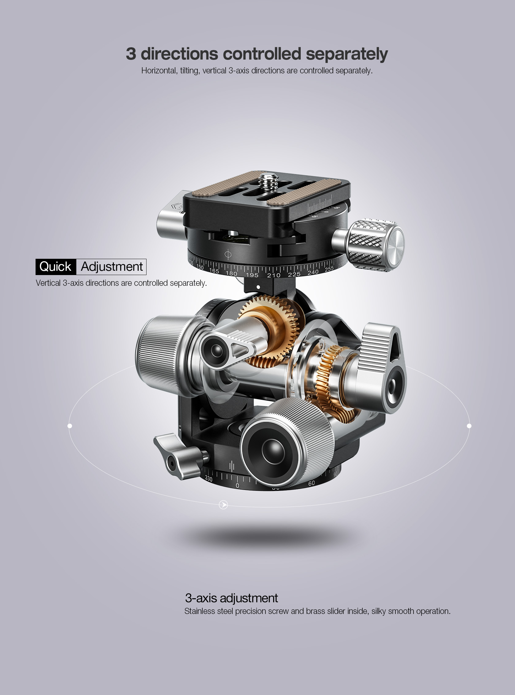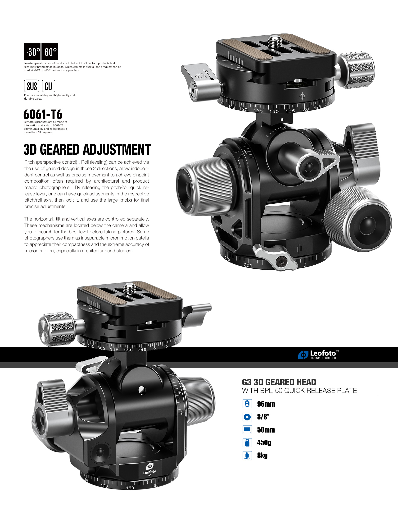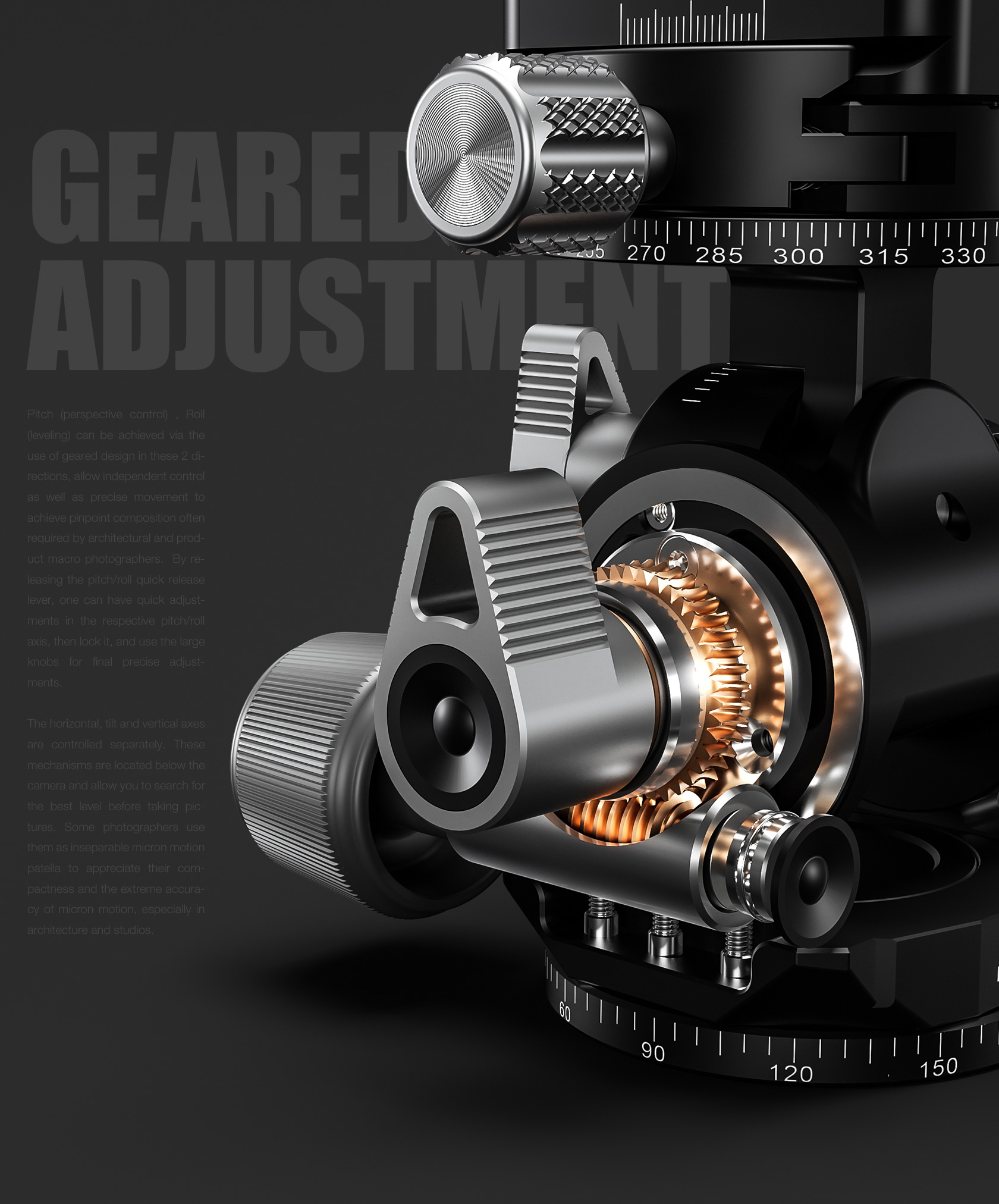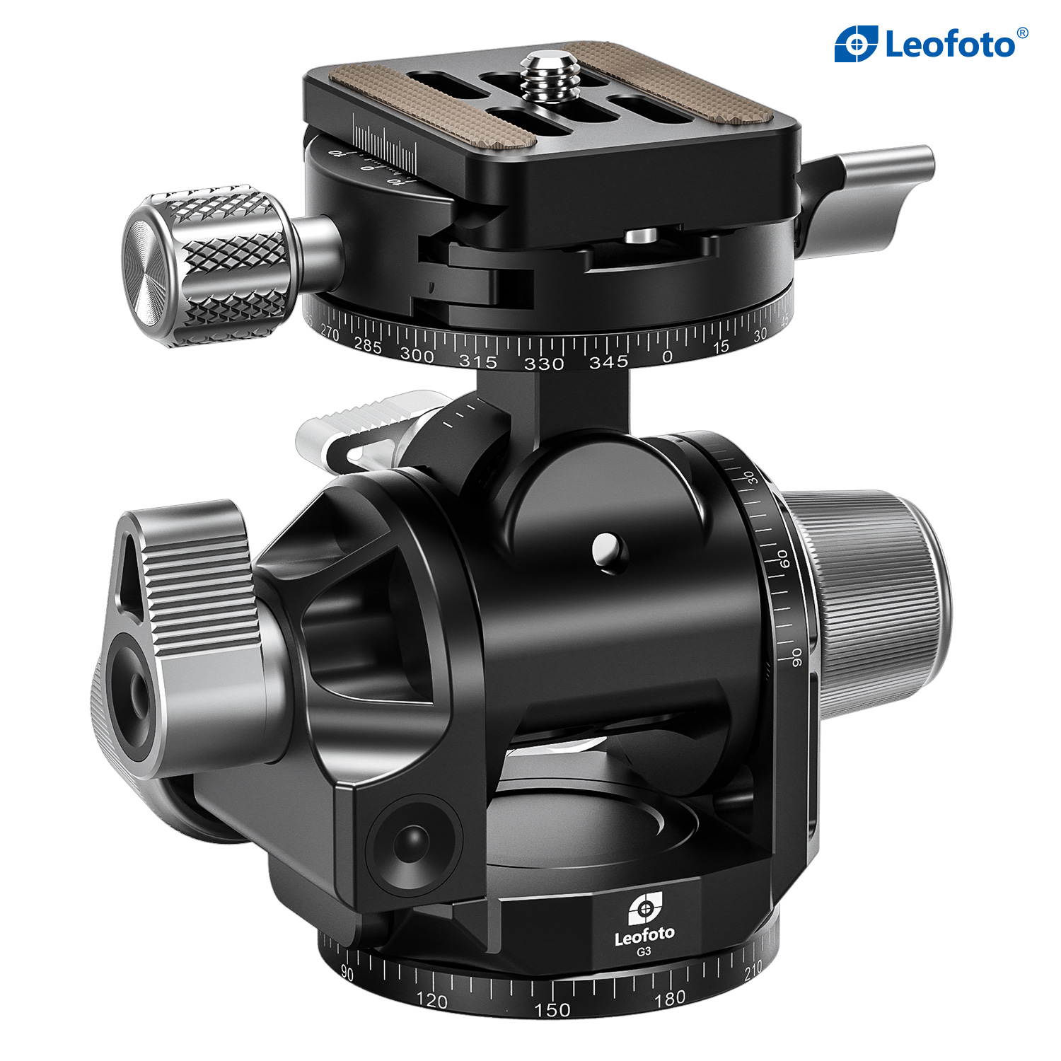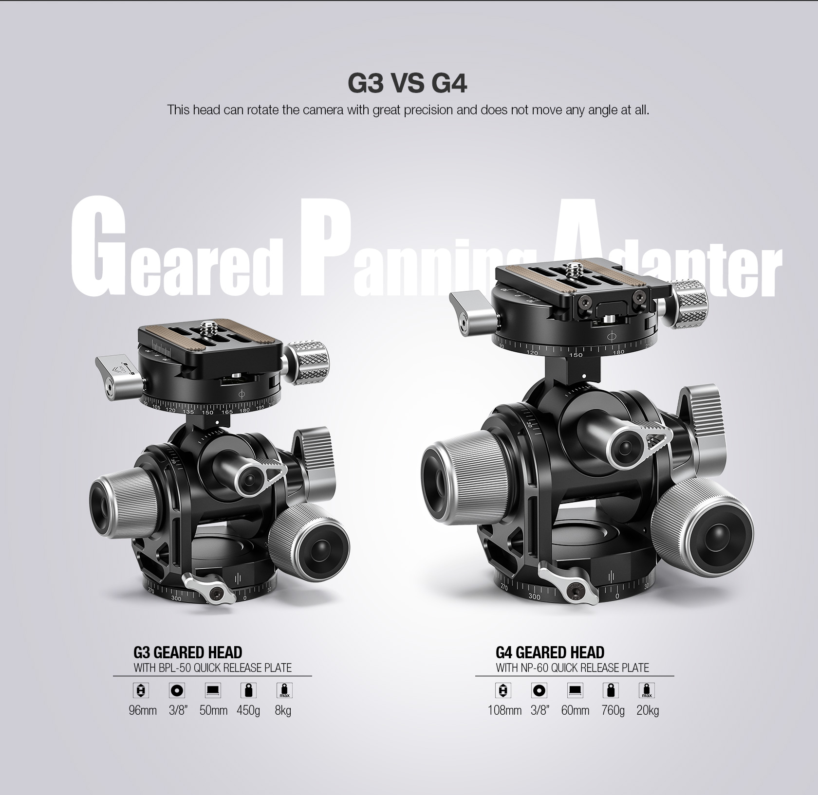 The design of this head puts the center of rotation of X and Y- tilts in the same place, making the pivoting radius of these movements very small, thus allowing users to maintain perspectives during readjustment. The self-locking shock absorption feature for the swivel function allows for near total compensation of the camera’s weight. In addition to manual operation, the G3 also offers the precision of separate gear-driven vertical/horizontal movements when the locking levers are fixed, with quick release clutches for fast, large adjustments.