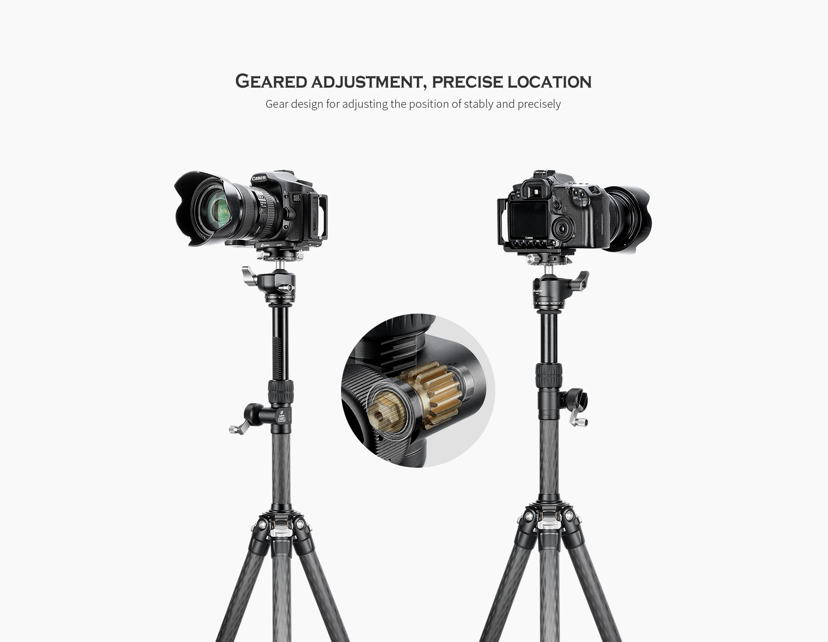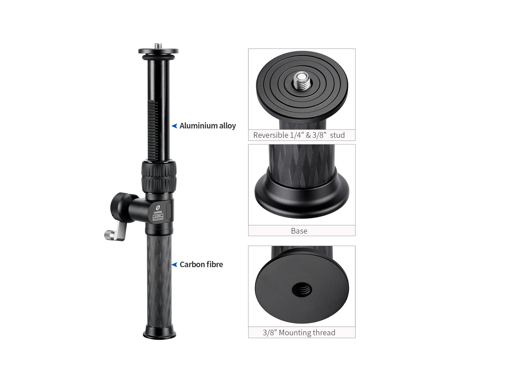 The Leofoto GC-282C Geared Add-On Center Column is an adjustable, two-section center column extension for tripods and monopods. Made up of two lightweight yet durable 10-layer carbon fiber tubes, the GC Center Column adds height to the setup featuring the same high quality rubber grip twist leg lock and anodized aluminum hardware that come standard on Leofoto tripods. This center column add-on features a geared extension crank handle for precise vertical movement. The column base has a 3/8″-16 threaded mounting socket while the top features a spring-loaded, convertible 3/8″-16 threaded mounting stud that can be slid down to reveal a 1/4″-20 threaded mounting stud, making it compatible with virtually any head.