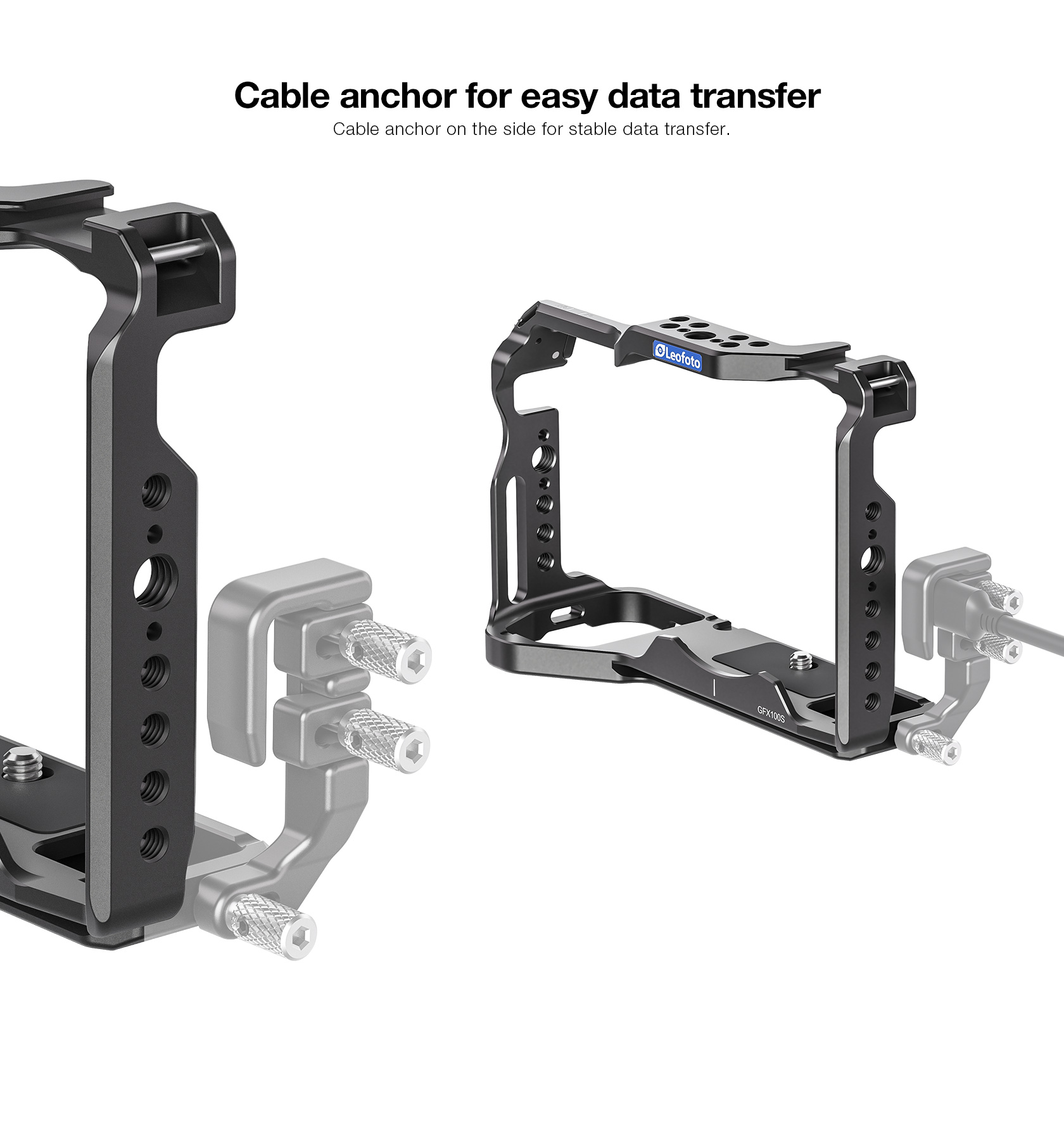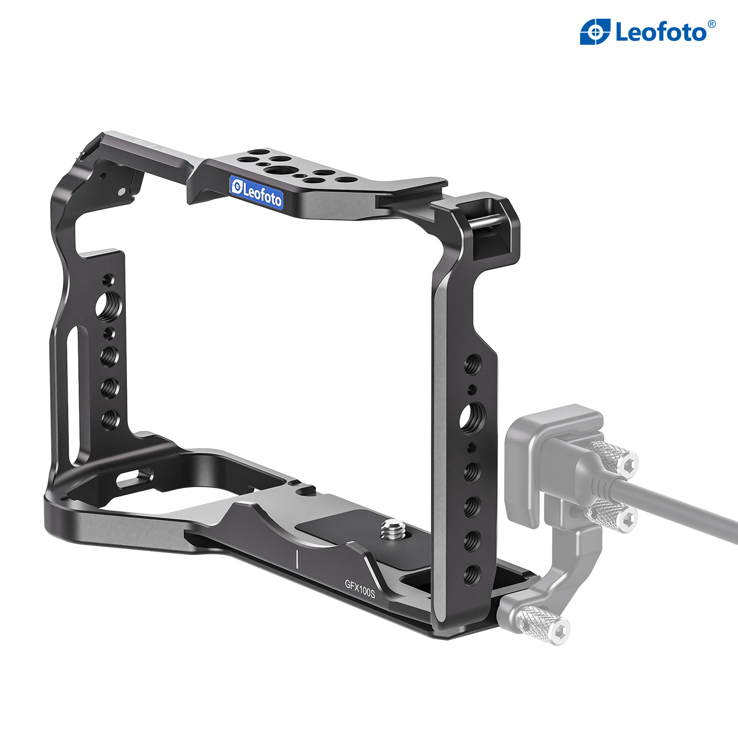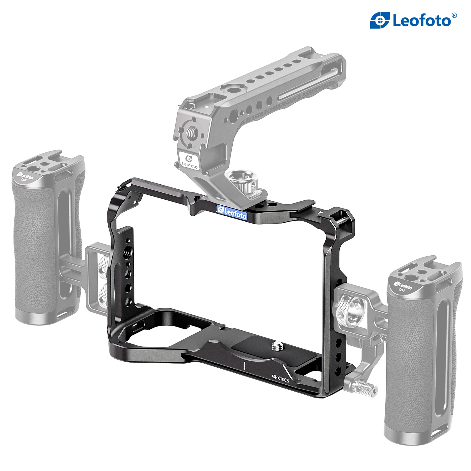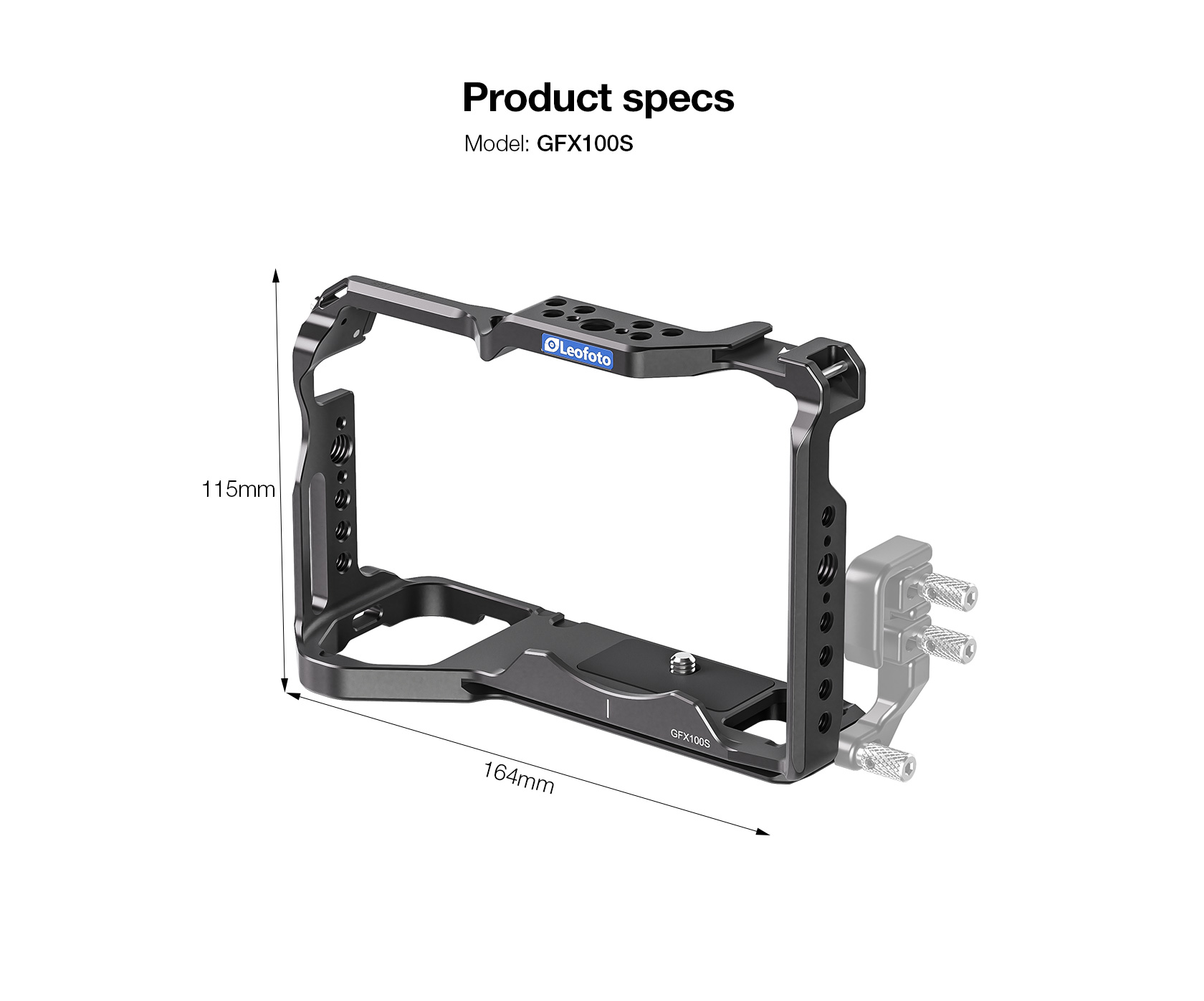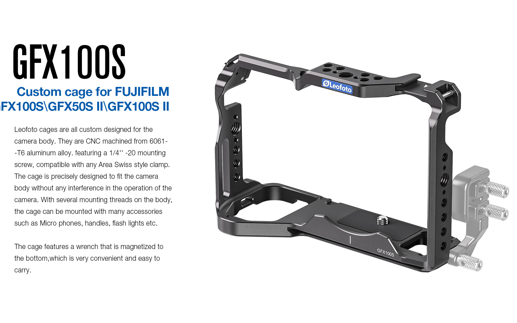 The Leofoto GFX100S Custom Cage for FUJIFILM GFX100S/GFX50S II is precision machined from solid blocks of 6061-T6 aluminum. This cage features a 1/4”-20 mounting screw, compatible with any Arca-style clamp. The cage is precisely designed to fit the camera body without interference in the operation of the camera. There are multiple mounting threads on the cage to attach accessories such as microphones, handles, flashlights etc. There is also a magnetized allenkey on the bottom which is very convenient.
