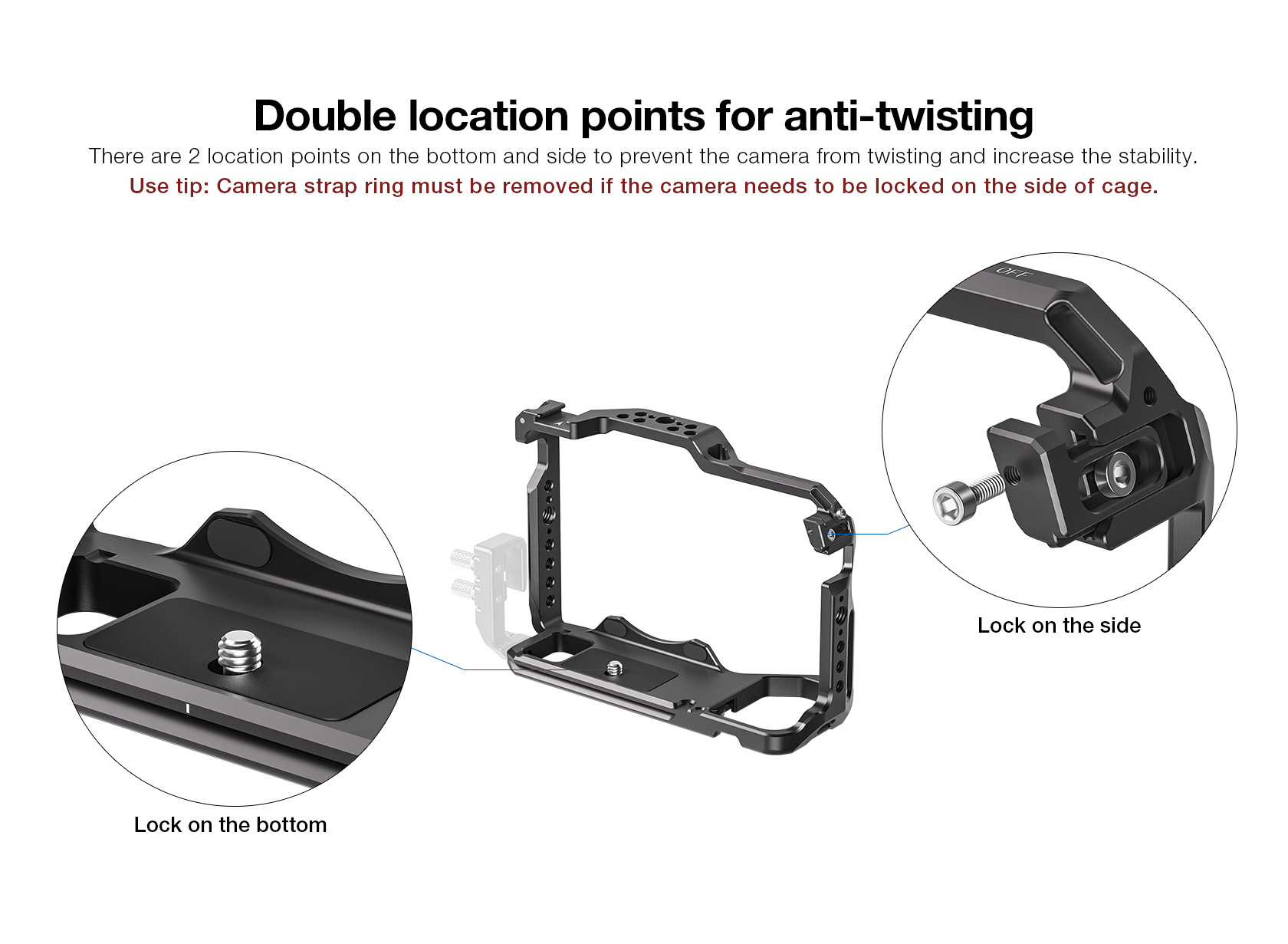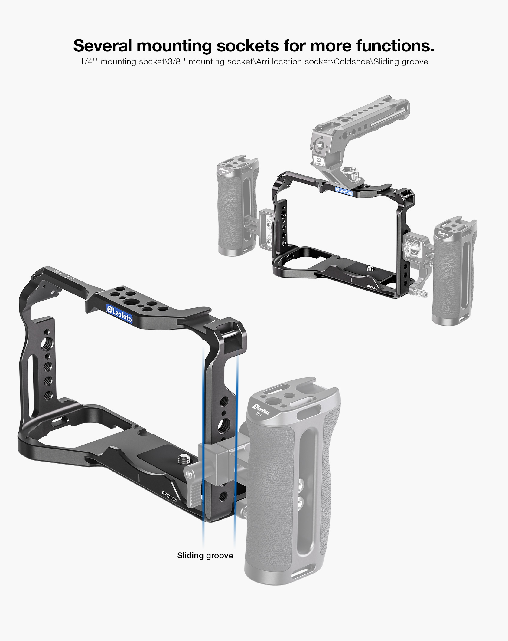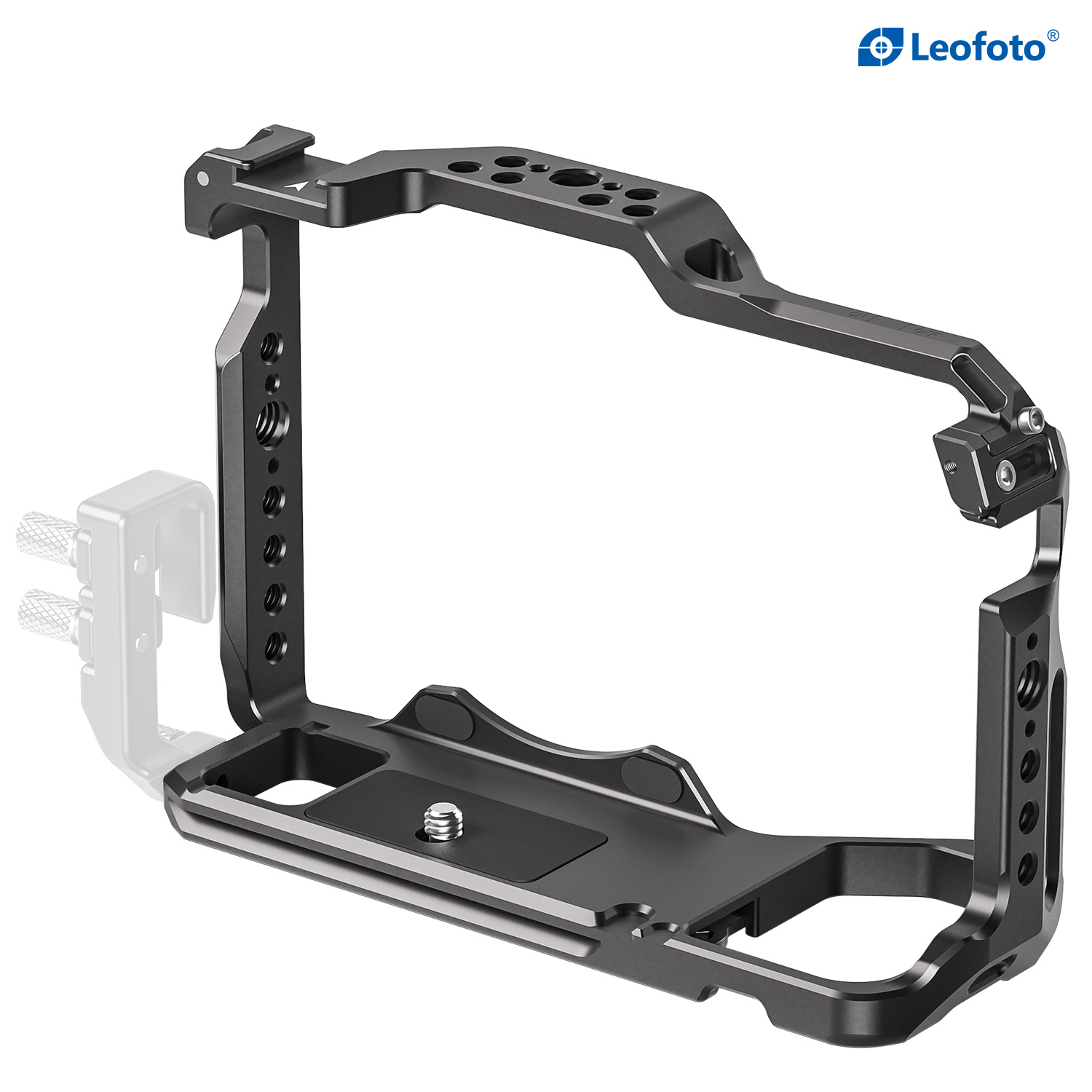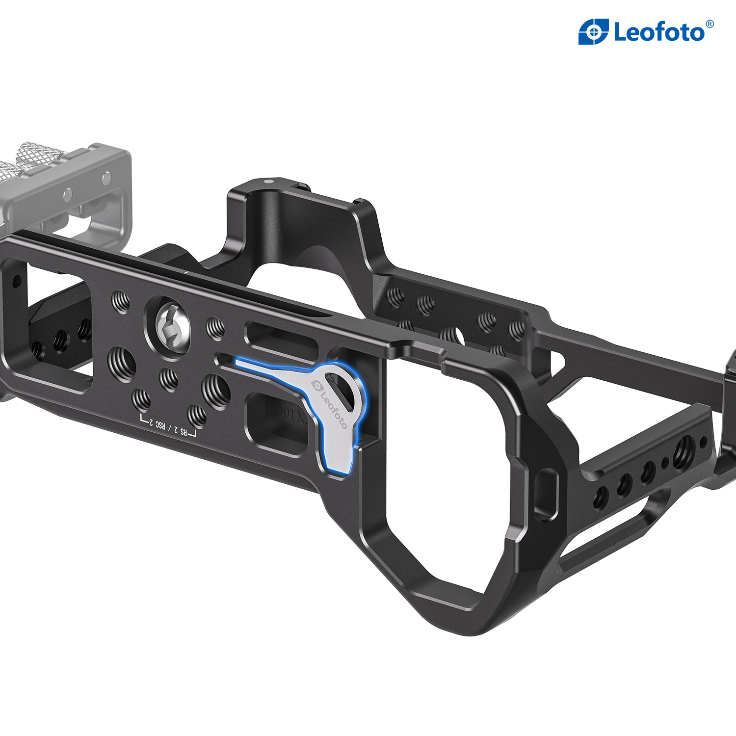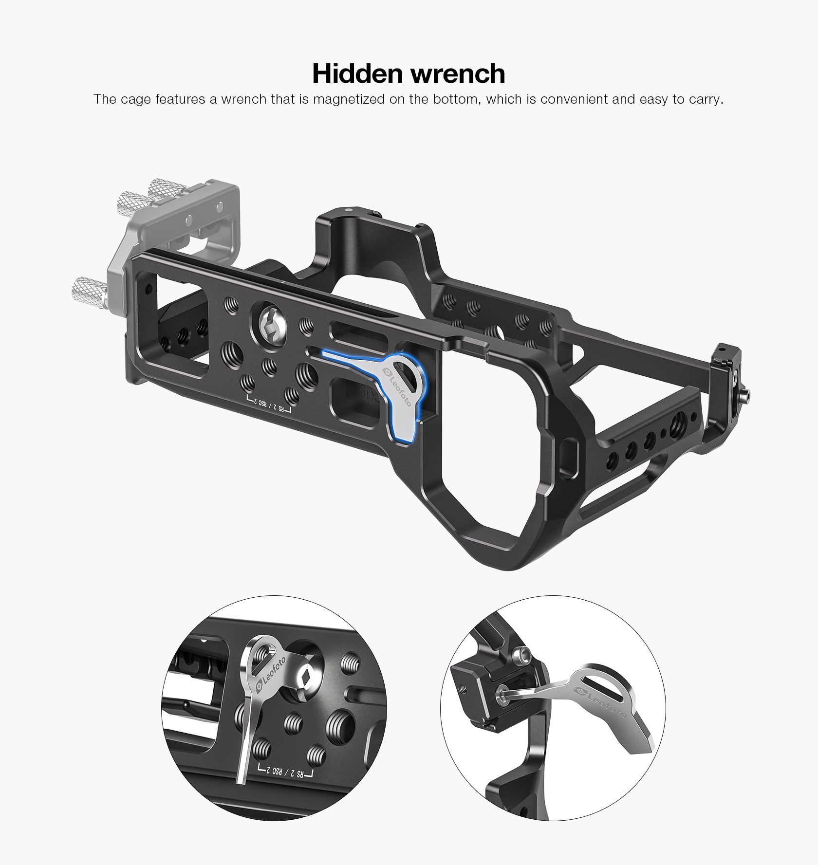 The Leofoto GFX100S Custom Cage for FUJIFILM GFX100S/GFX50S II is precision machined from solid blocks of 6061-T6 aluminum. This cage features a 1/4”-20 mounting screw, compatible with any Arca-style clamp. The cage is precisely designed to fit the camera body without interference in the operation of the camera. There are multiple mounting threads on the cage to attach accessories such as microphones, handles, flashlights etc. There is also a magnetized allenkey on the bottom which is very convenient.