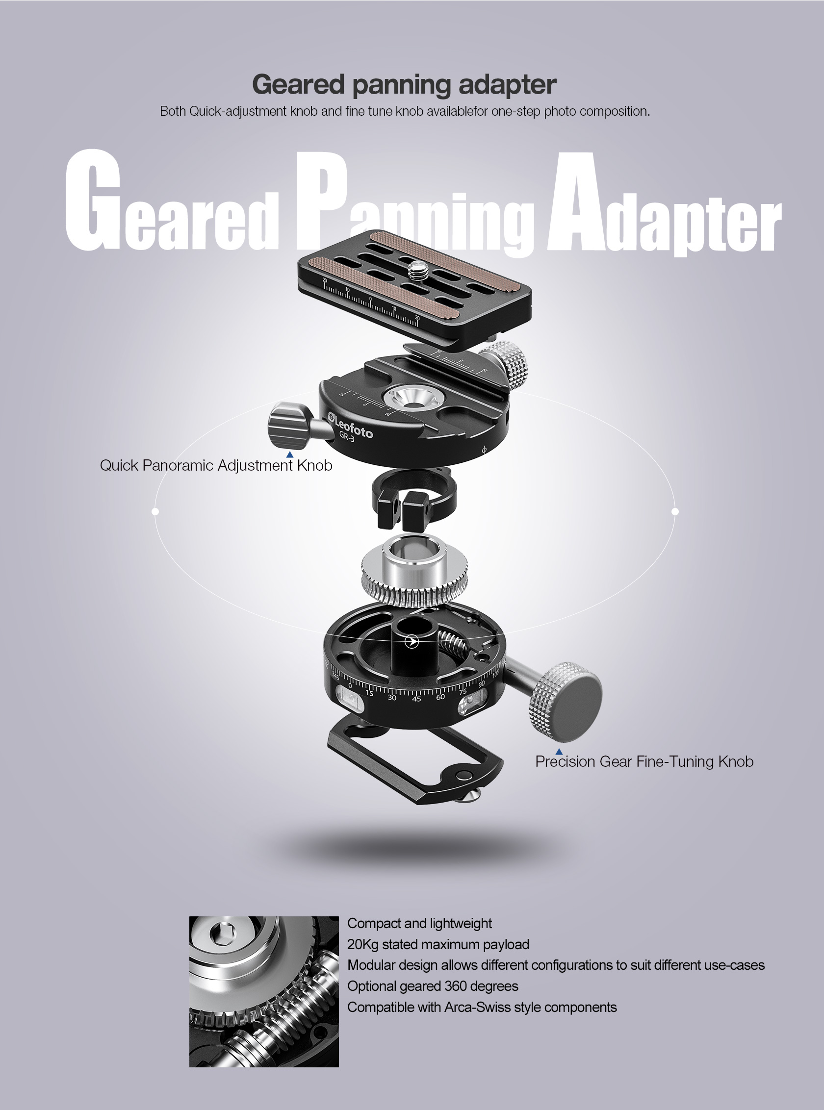 The Leofoto GR-3 Geared Panning Adapter is perfect for tasks that demand precise micro-adjustments. Building on the GR-2, the GR-3 features an extended, enlarged precision gear fine-tuning knob for easier handling and more controlled adjustments. Its improved design ensures it won’t interfere with other components when mounted on a tripod or used alongside other heads, providing enhanced compatibility and ease of use for professional photographers.