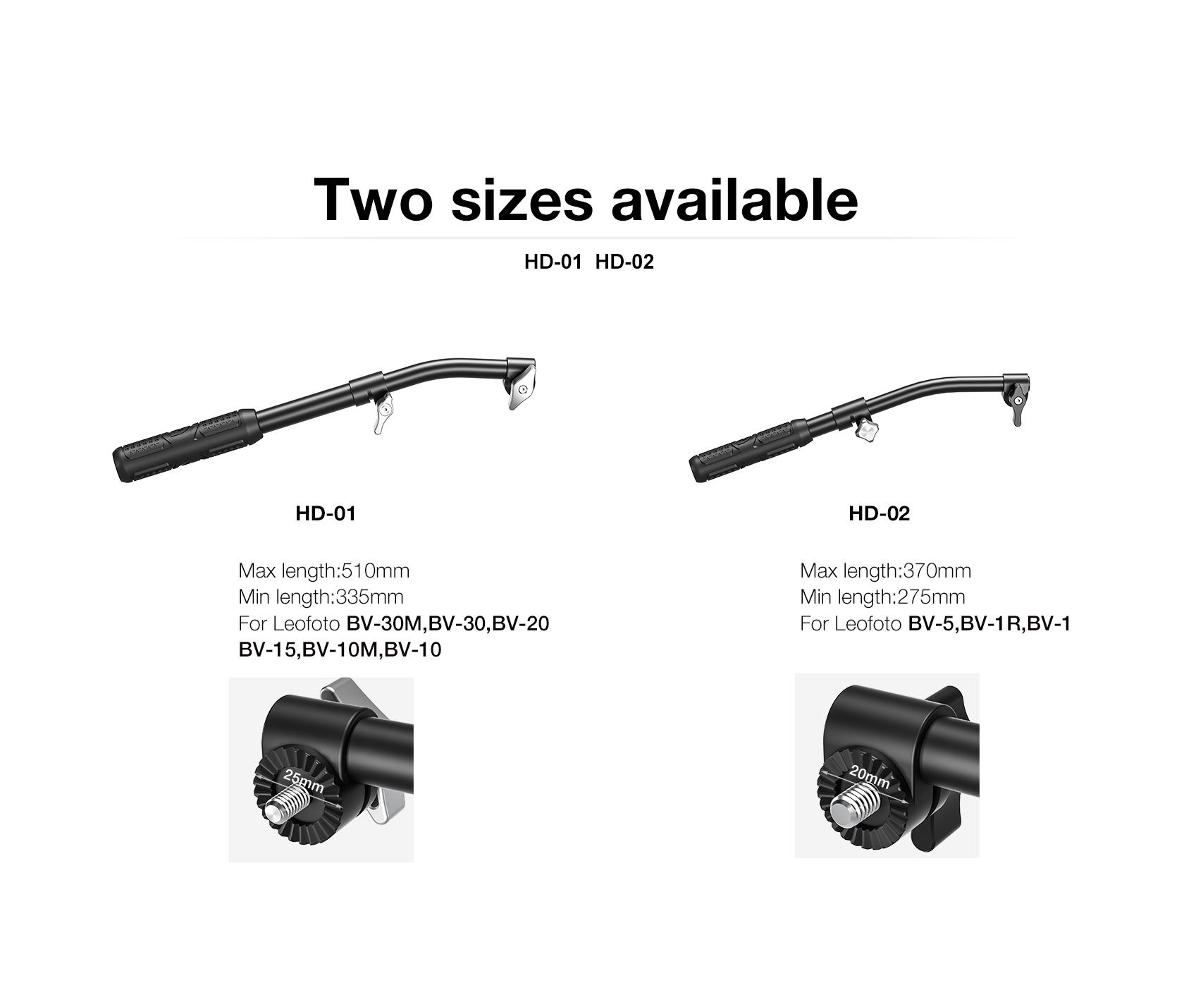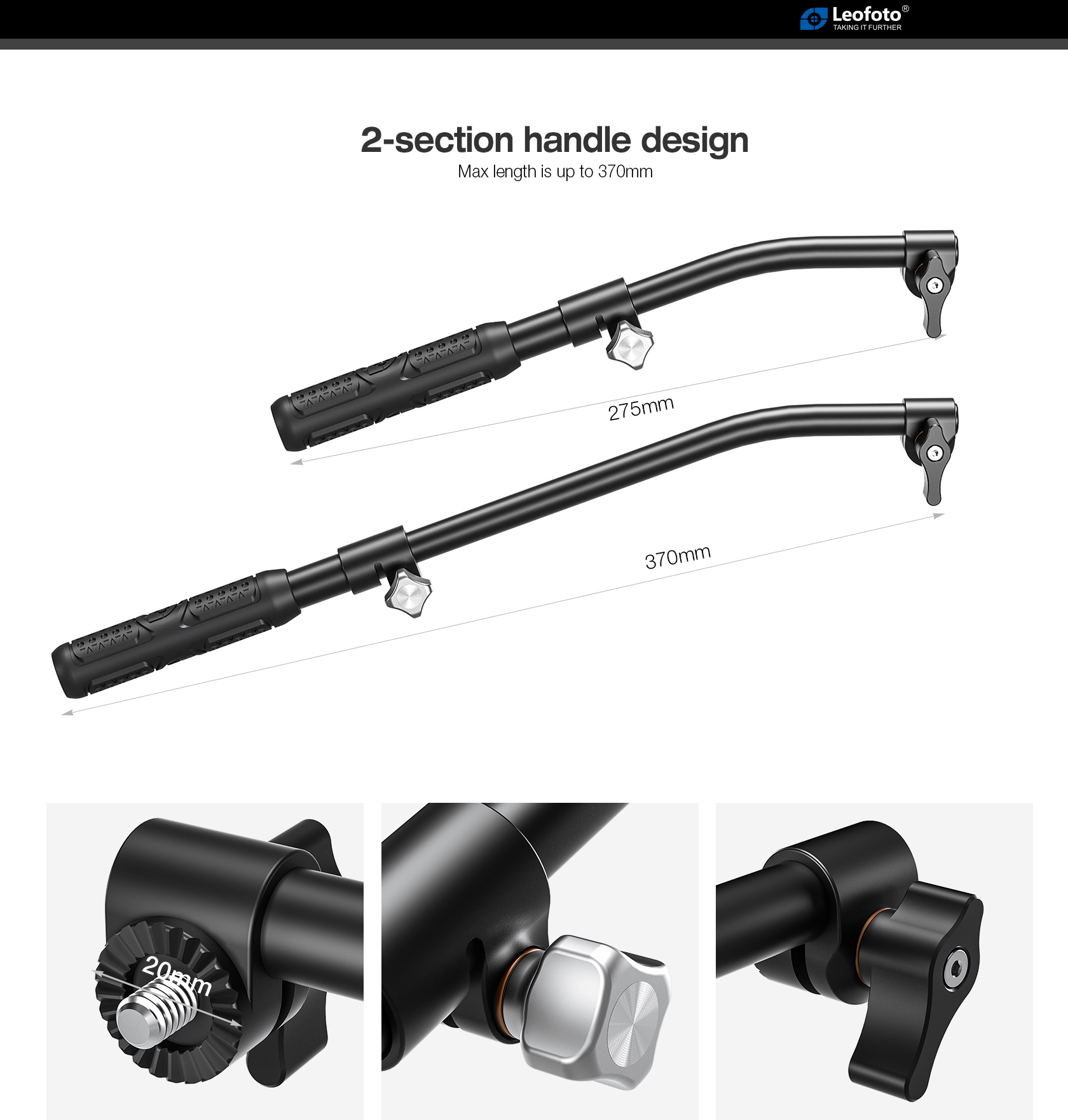 The Leofoto HD-02 is a 2-section handle for Leofoto BV-1/1R, BV-5 Fluid Heads. This handle features a silicone handle for added comfort. It can be extended from 275mm to 370mm.