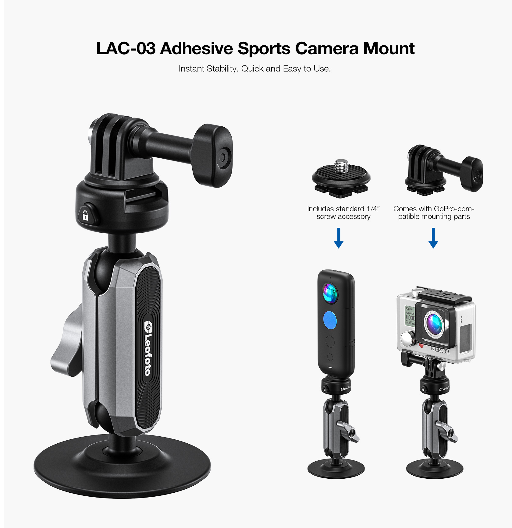 The Leofoto LAC-03 is a versatile adhesive mount designed for action and sports cameras. Its flexible base securely sticks to a wide range of surfaces, while the bendable edges allow it to conform to both flat and slightly curved surfaces. Ideal for helmets, boards, and other gear, it provides a reliable mounting solution for dynamic shooting environments.
