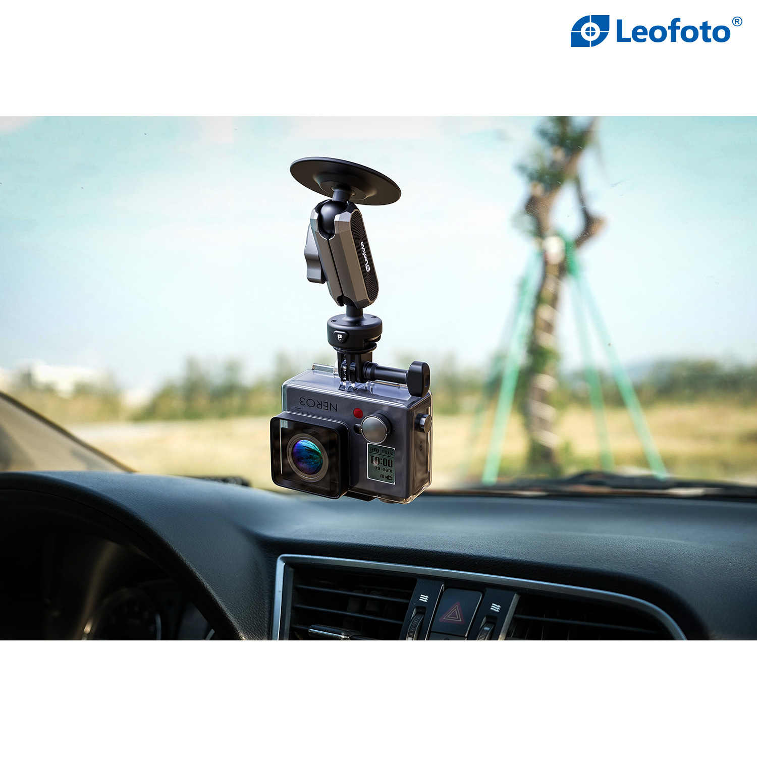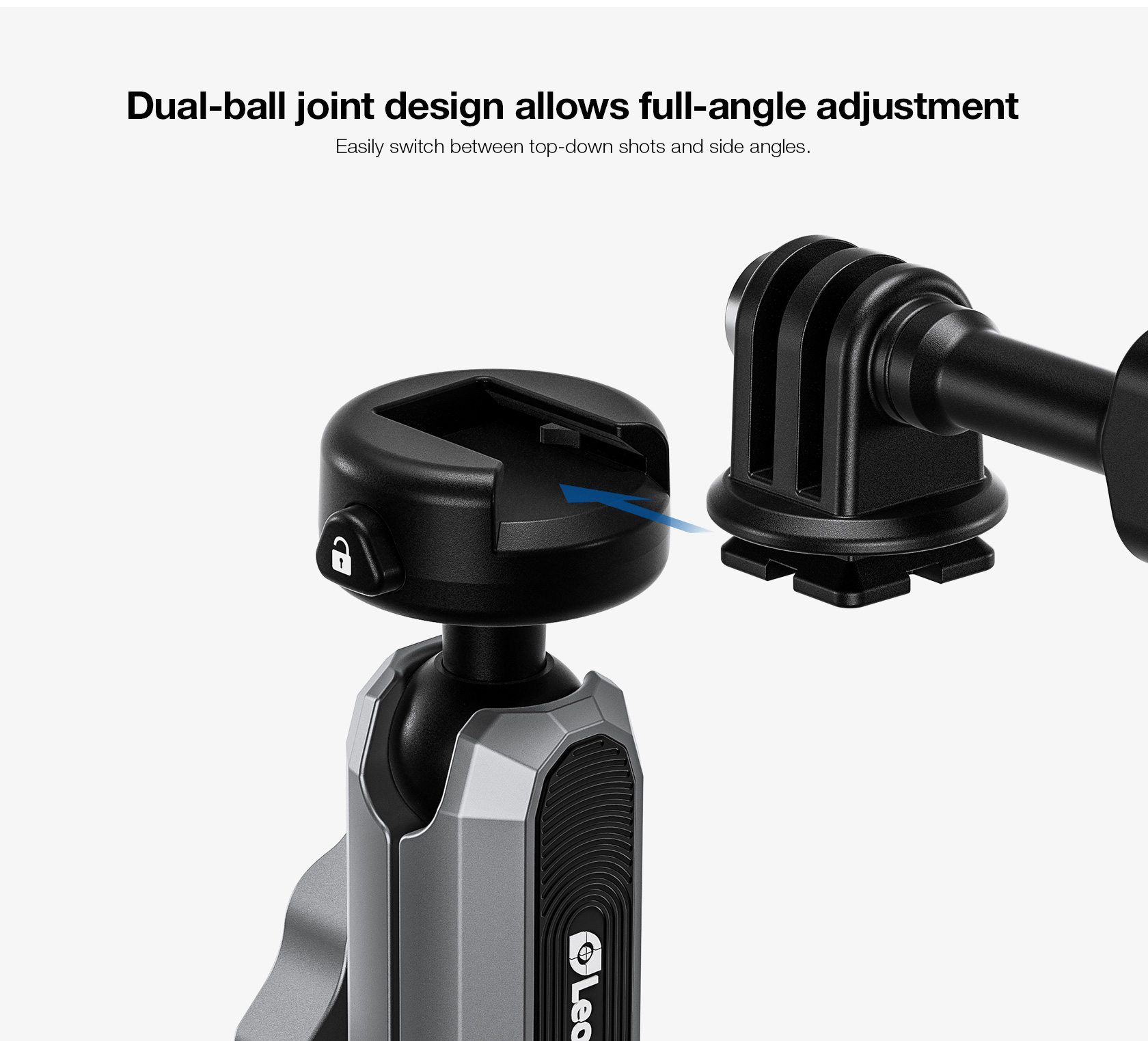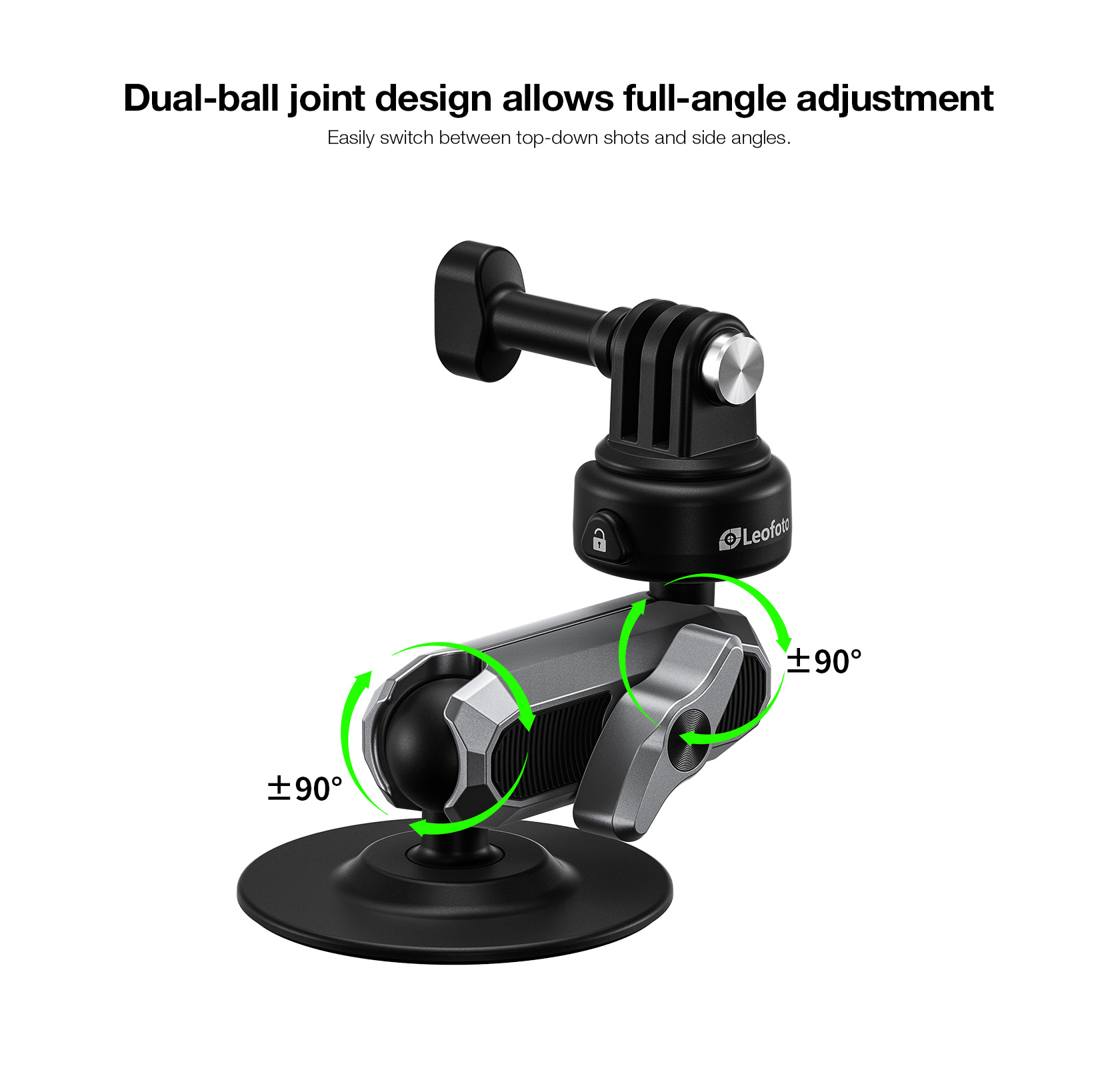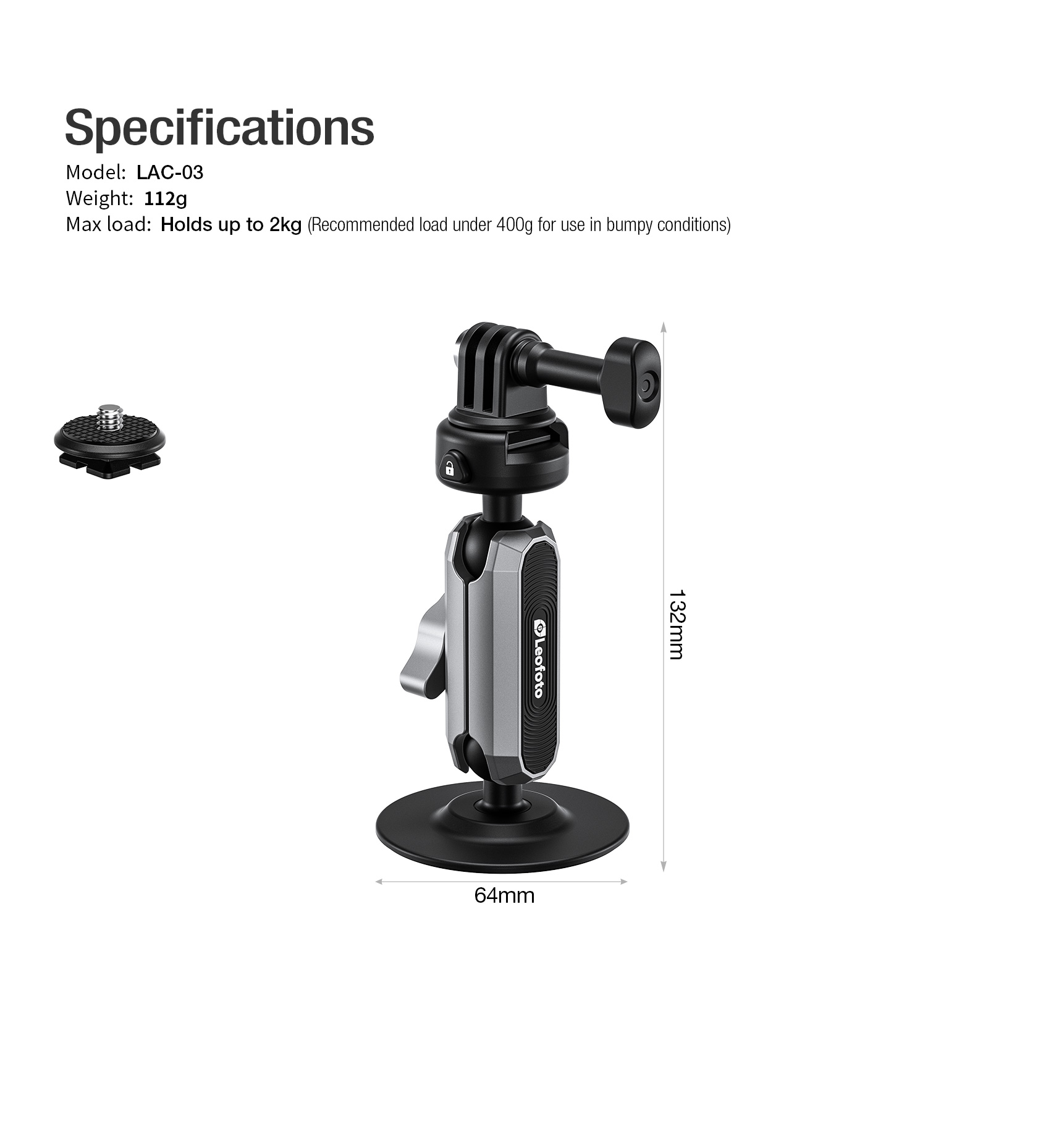 The mount features a built-in 20mm (0.79 in) ball head for flexible camera positioning and can securely hold cameras weighing up to 2 kg (4.4 lbs), with a recommended load under 400 g (0.88 lbs) for bumpy conditions.