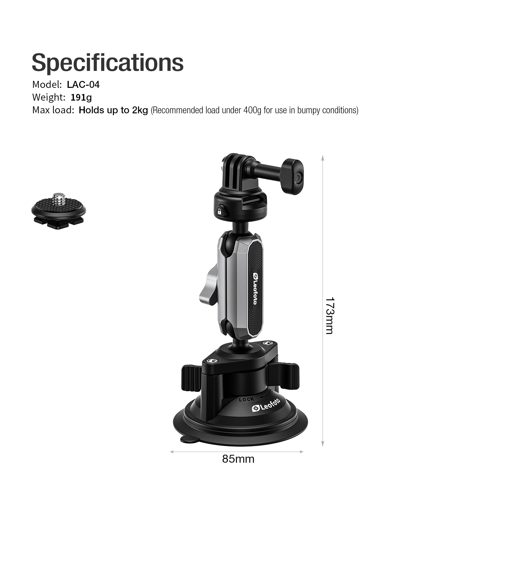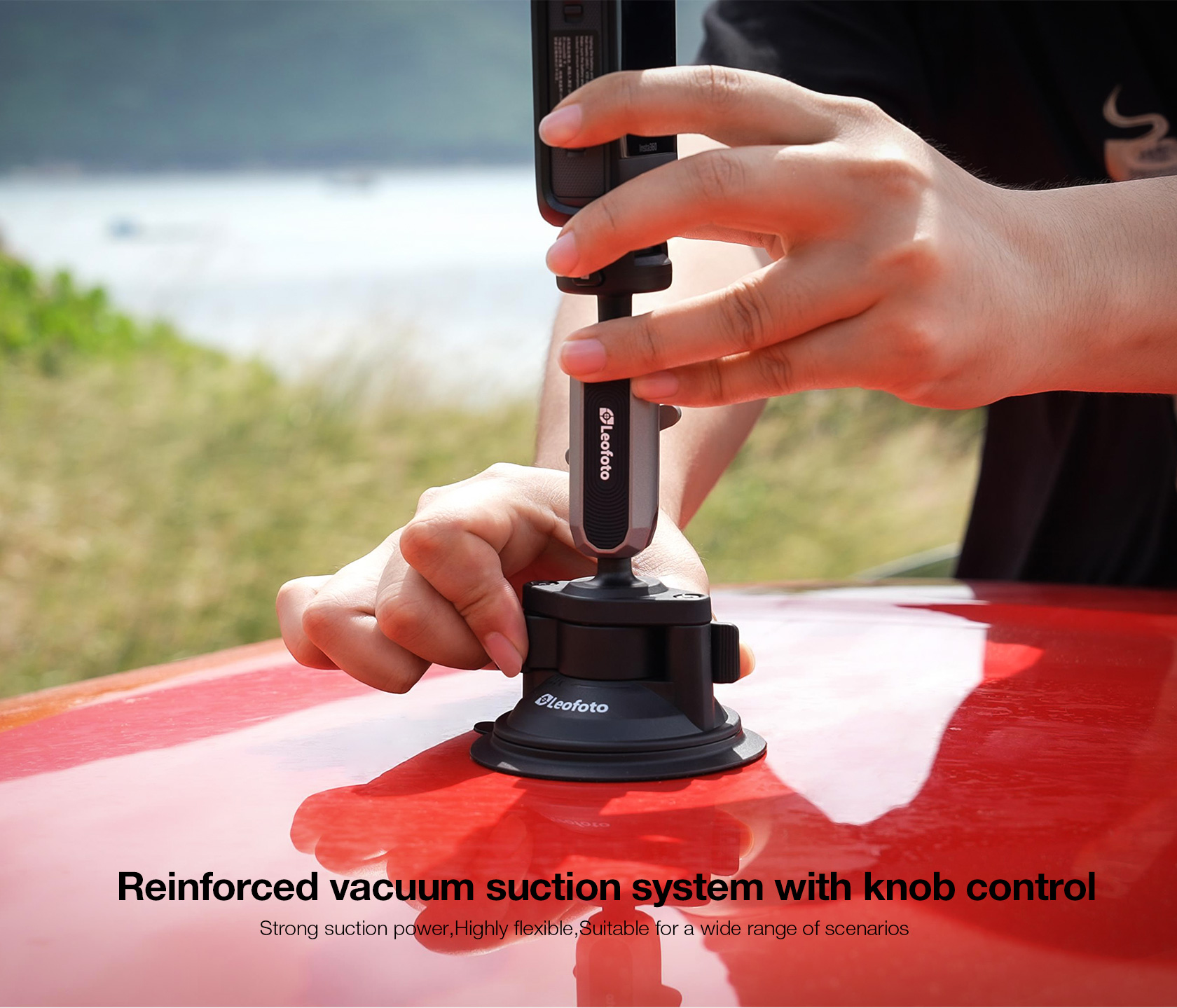 The Leofoto LAC-04 Suction Cup Sports Camera Mount features a reinforced vacuum suction system with knob control, providing strong and reliable suction on a wide range of smooth surfaces. Its highly flexible design makes it suitable for various scenarios, from cars and boats to other flat surfaces.