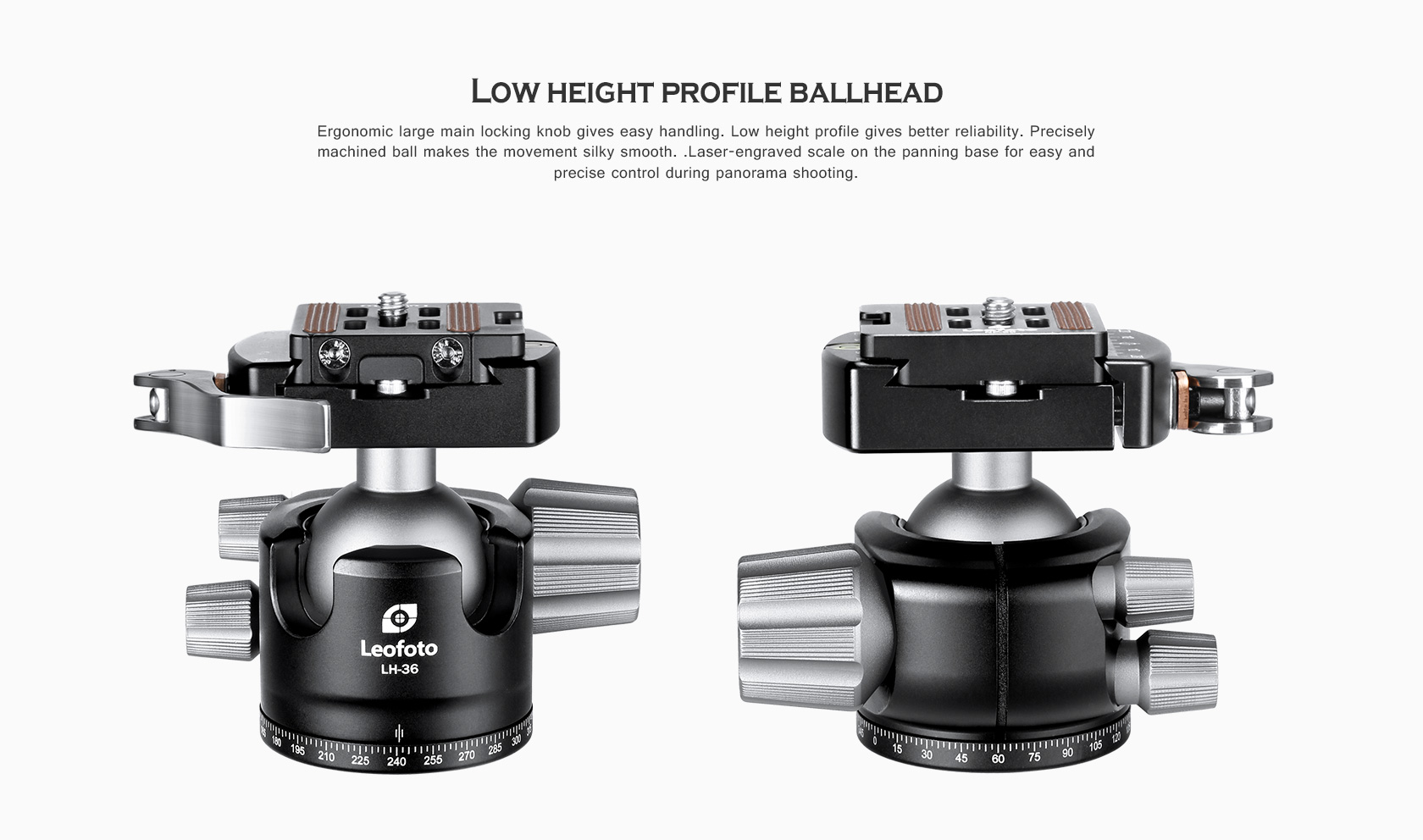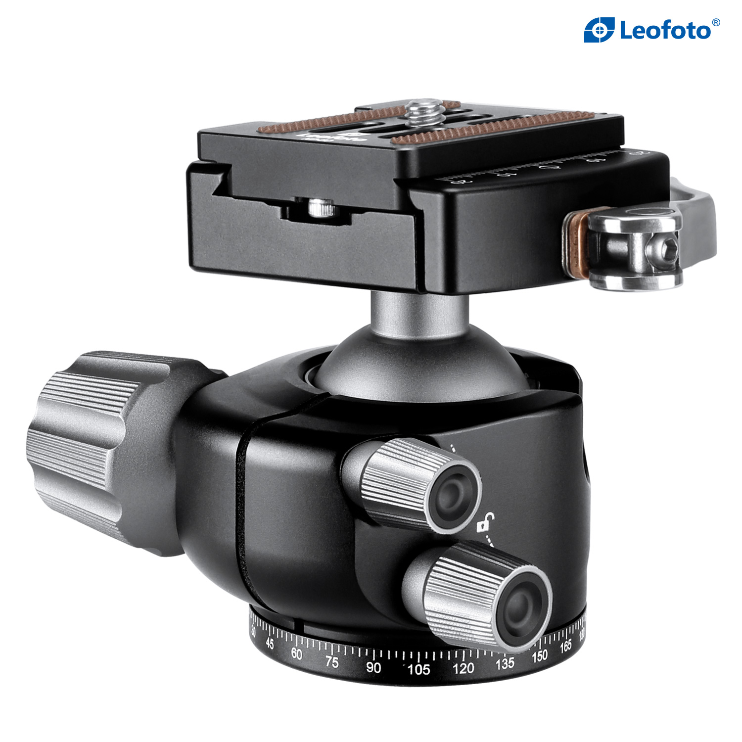 The Leofoto LH Series Ball Head is a great support solution in a small form factor for all general photography, and will give you fast and accurate control and solid support of your camera or lens. Aiming and horizon leveling can be accomplished as one instinctive motion, and rigid lockup takes just a quick twist of one control. Since the ball head profile is smaller and lacks the protruding handles, they are also much easier to carry and pack. These are no-nonsense heads with robust capacity, offering minimal weight and elegant simplicity. They excel as ground-level macro tools, but also as super light heads for backpacking, travel, and table top use. The head features a single ball locking knob while the panning base has a separate lock and is laser-engraved in 2.5-degree increments from 0-360 degrees for accurate repeatability.