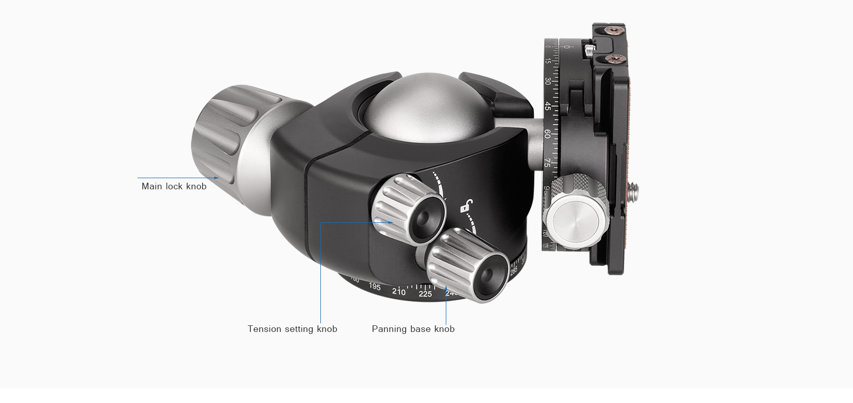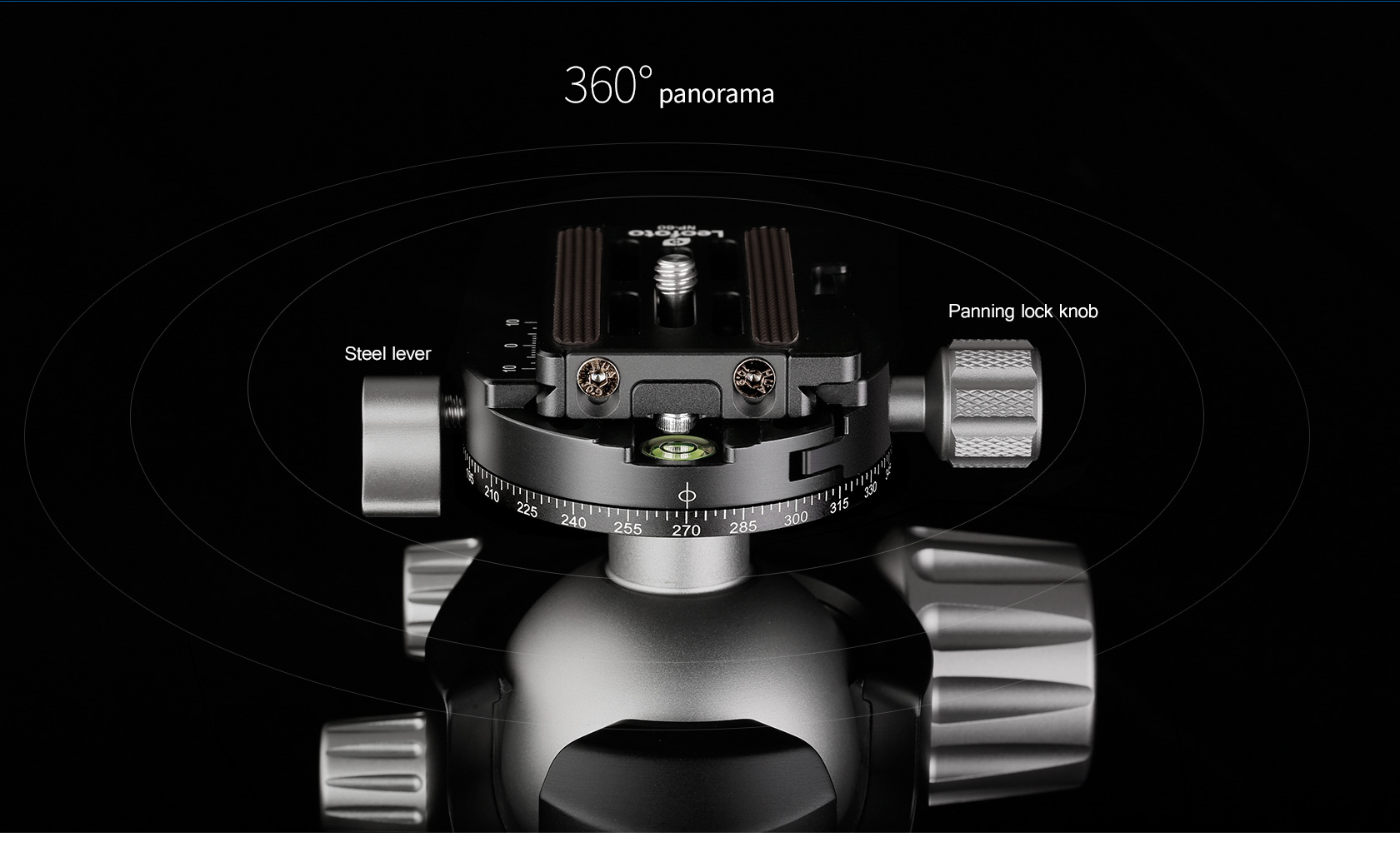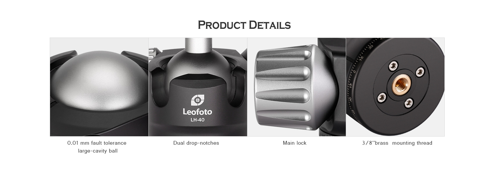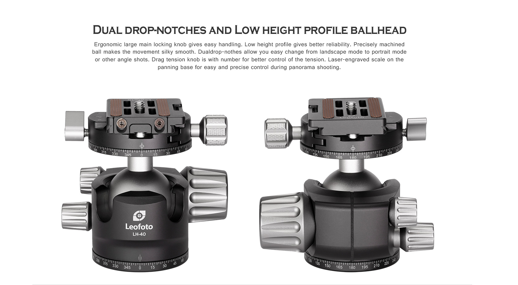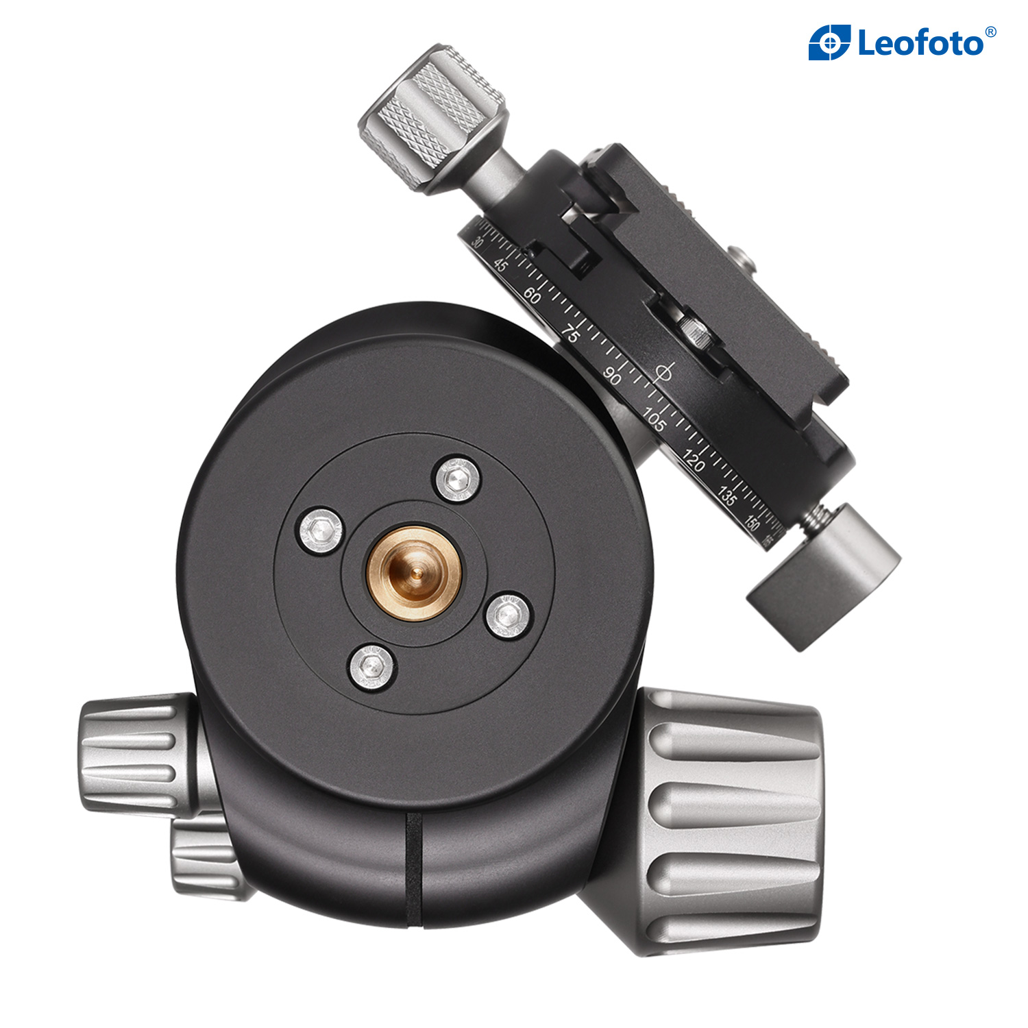 The Leofoto LH Series Ball Head is a great support solution in a small form factor for all general photography, and will give you fast and accurate control and solid support of your camera or lens. Aiming and horizon leveling can be accomplished as one instinctive motion, and rigid lockup takes just a quick twist of one control. Since the ball head profile is smaller and lacks the protruding handles, they are also much easier to carry and pack. These are no-nonsense heads with robust capacity, offering minimal weight and elegant simplicity. They excel as ground-level macro tools, but also as super light heads for backpacking, travel, and table top use. The head features a single ball locking knob while the panning base has a separate lock and is laser-engraved in 2.5-degree increments from 0-360 degrees for accurate repeatability.