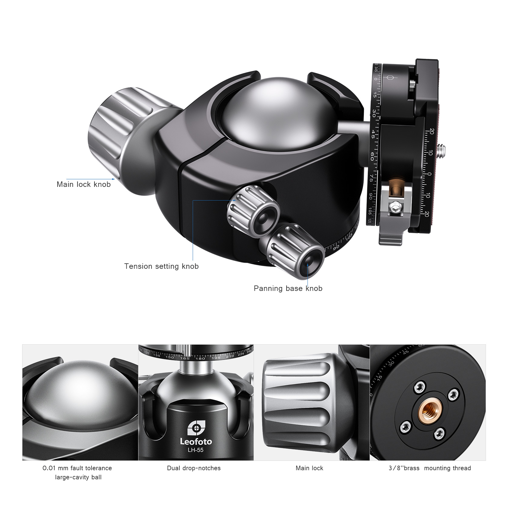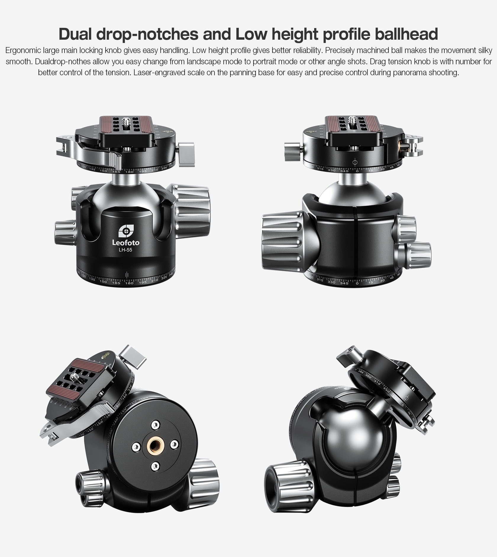 The Leofoto LH Series Ball Head is a great support solution in a small form factor for all general photography, and will give you fast and accurate control and solid support of your camera or lens. Aiming and horizon leveling can be accomplished as one instinctive motion, and rigid lockup takes just a quick twist of one control. Since the ball head profile is smaller and lacks the protruding handles, they are also much easier to carry and pack. These are no-nonsense heads with robust capacity, offering minimal weight and elegant simplicity. They excel as ground-level macro tools, but also as super light heads for backpacking, travel, and table top use. The head features a single ball locking knob while the panning base has a separate lock and is laser-engraved in 2.5-degree increments from 0-360 degrees for accurate repeatability.
