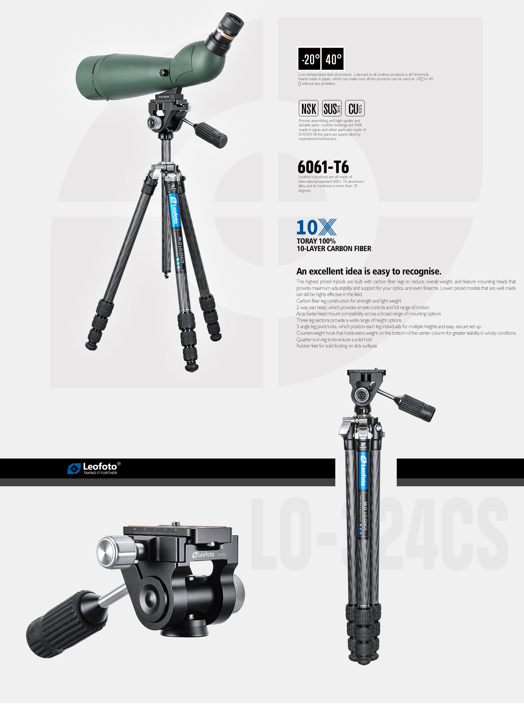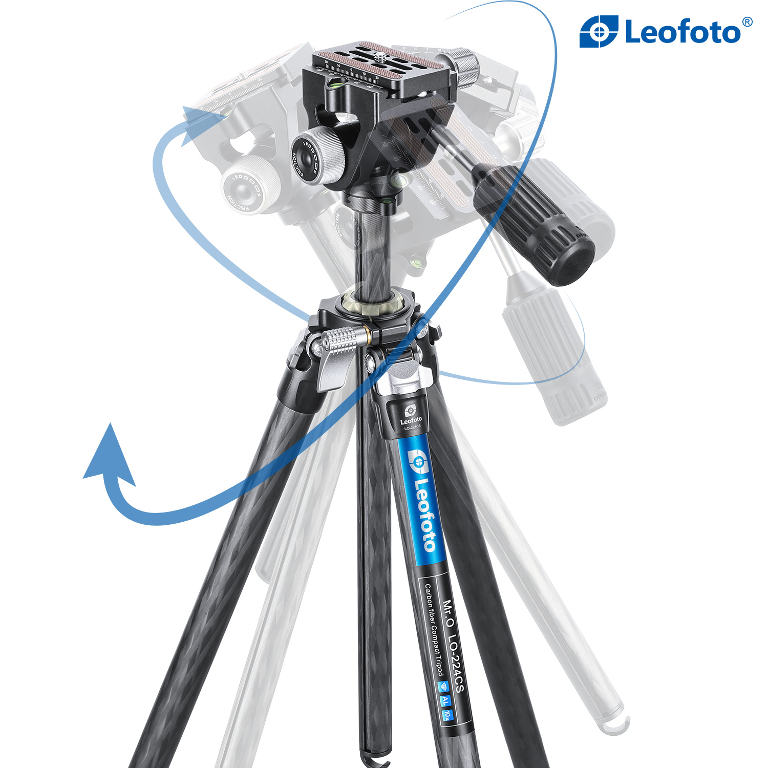 The Leofoto LO Mr. O Series Carbon Fiber Tripod with Built-In Hollow Ball is a lightweight and versatile tripod featuring a hollow ball design that allows the center column to be free of the limitation from linear vertical movement, adjusting its angle freely like a ball head. This adjustable center column positioning works along with the independent leg spread to allow quick leveling of a tripod head when shooting on uneven terrain. In addition to being easily positioned, the center column is removable and reversible for positioning a camera upside down and low to the ground for low-perspective and macro photography. The included short center column provides low positioning with a wide leg spread for added stability.