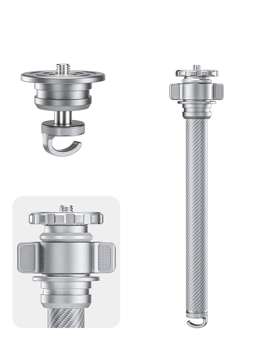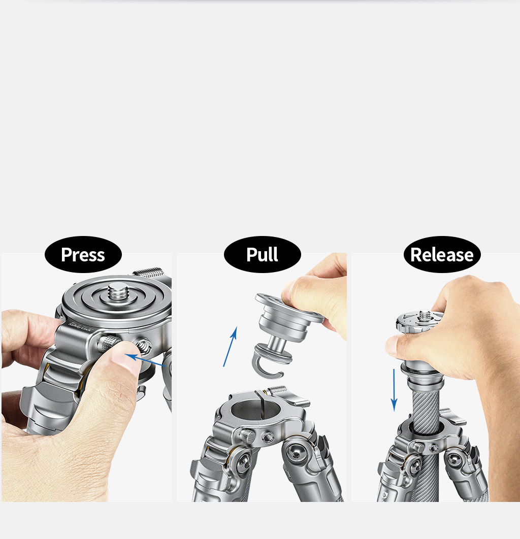 By pressing the safety lock to remove the center column or platform plate. ¼” threaded socket allows AM-1/AM-2 series magic arms to extend the use of mobile phone, or other accessories