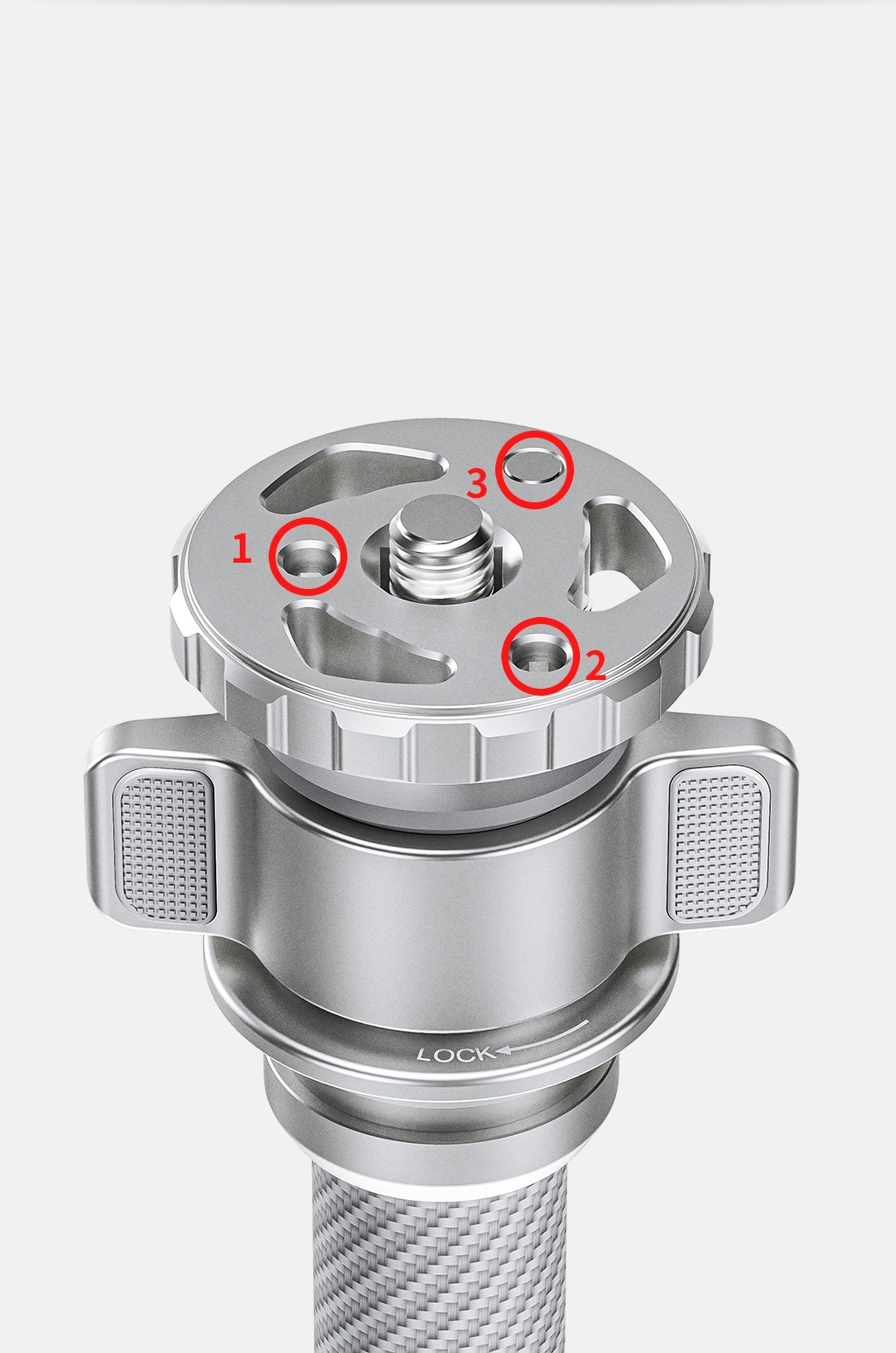 On the center column, there are 2 Allen screws (#1,2) to prevent the mounting base from twisting and 1 Allen screw (#3) to prevent the ballhead from twisting