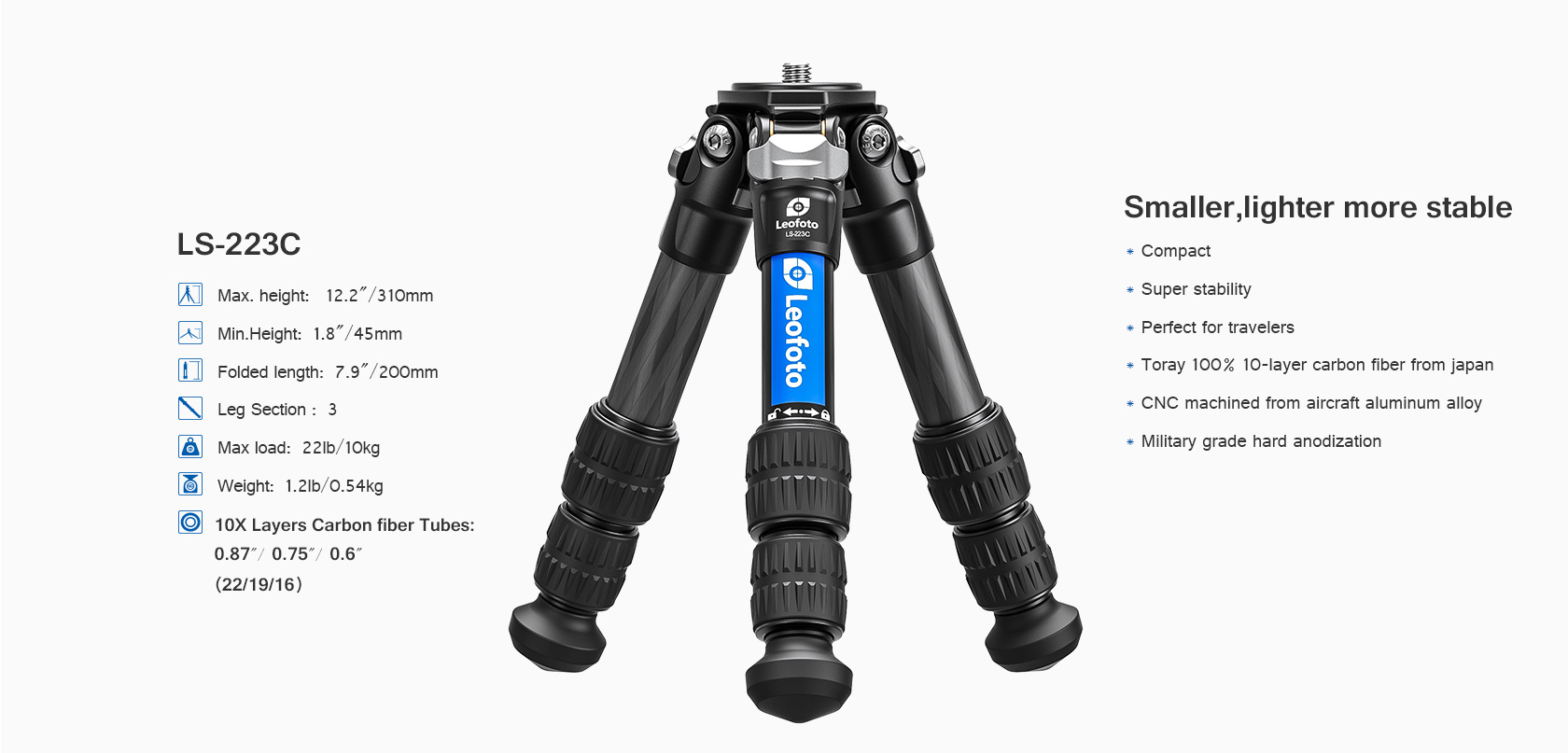 Toray 100% 10-layer carbon fiber leg tubes feature cross rhombus structure for greater strength, stability and less vibration.