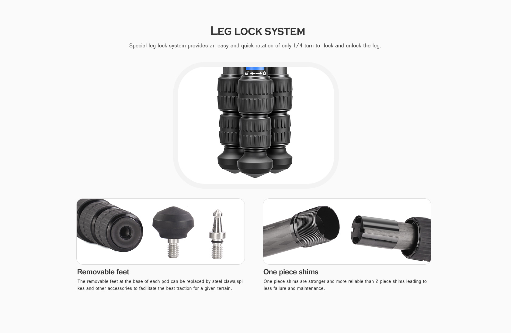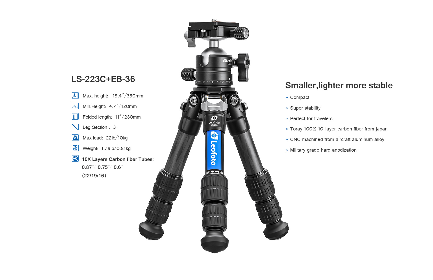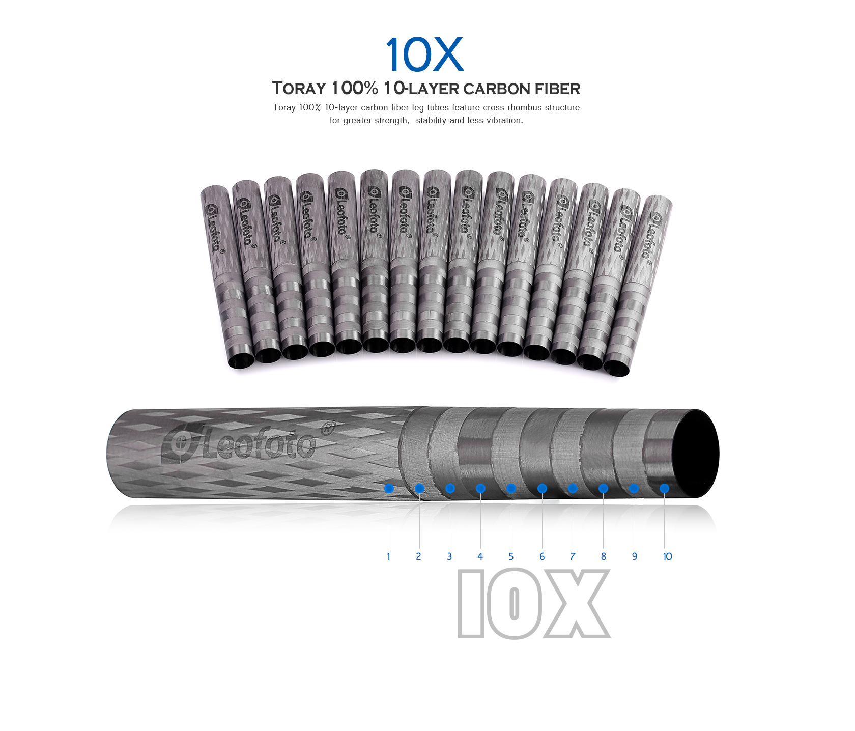 Toray 100% 10-layer carbon fiber leg tubes feature cross rhombus structure for greater strength, stability and less vibration.