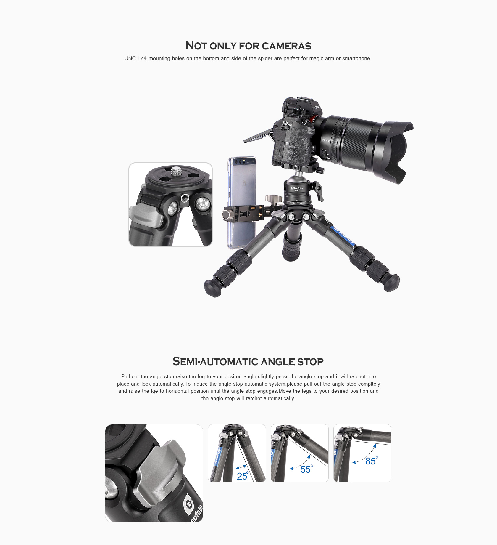 UNC 1/4 mounting holes on the bottom and side of the spider are perfect for magic arm or smartphone.