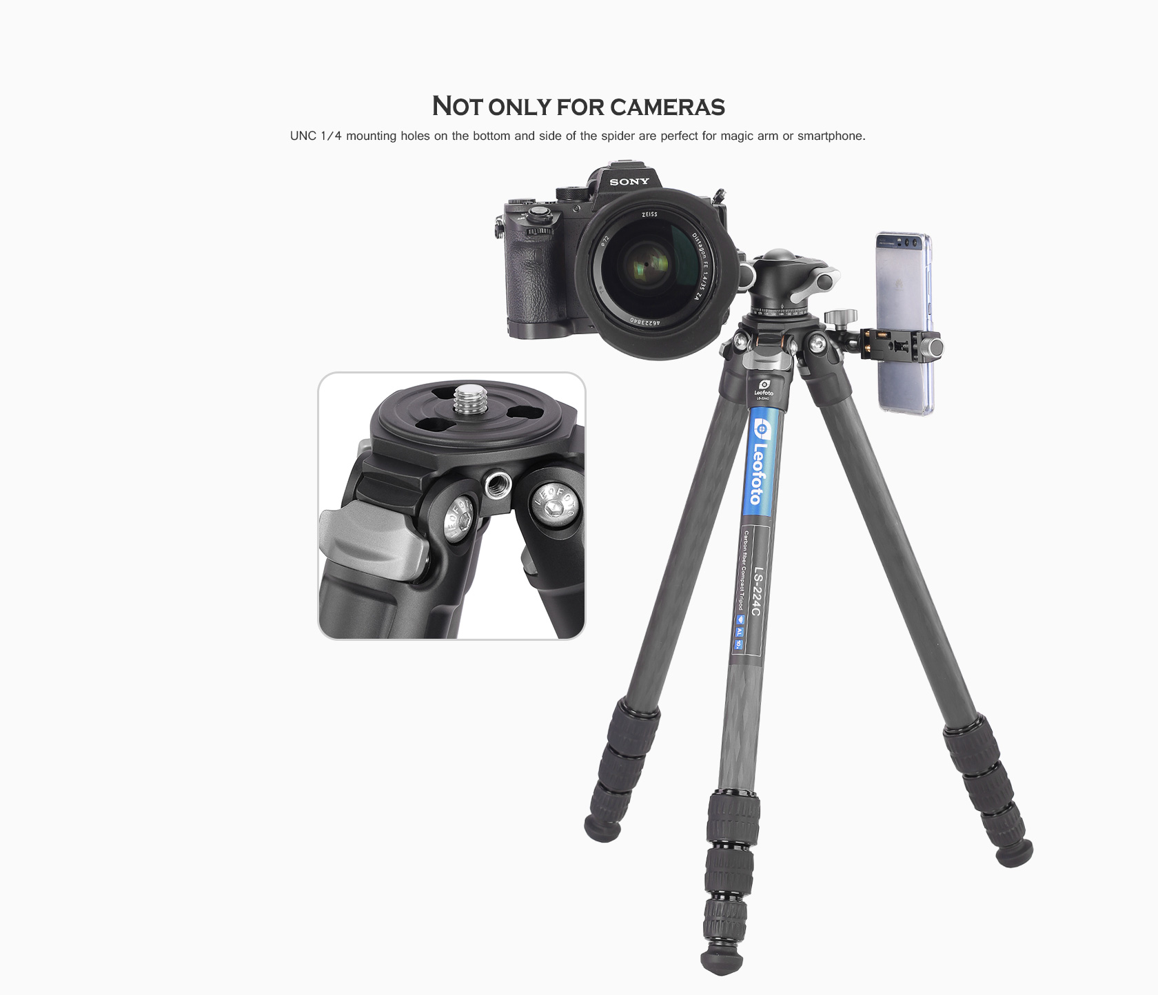 UNC 1/4 mounting holes on the bottom and side of the spider are perfect for magic arm or smartphone.
