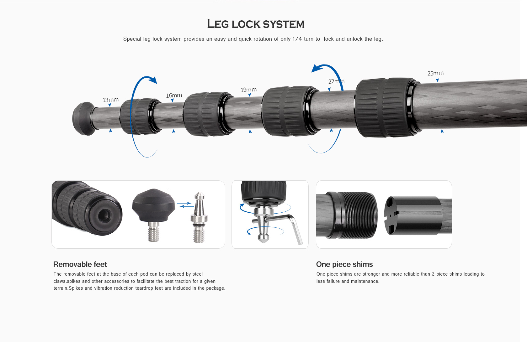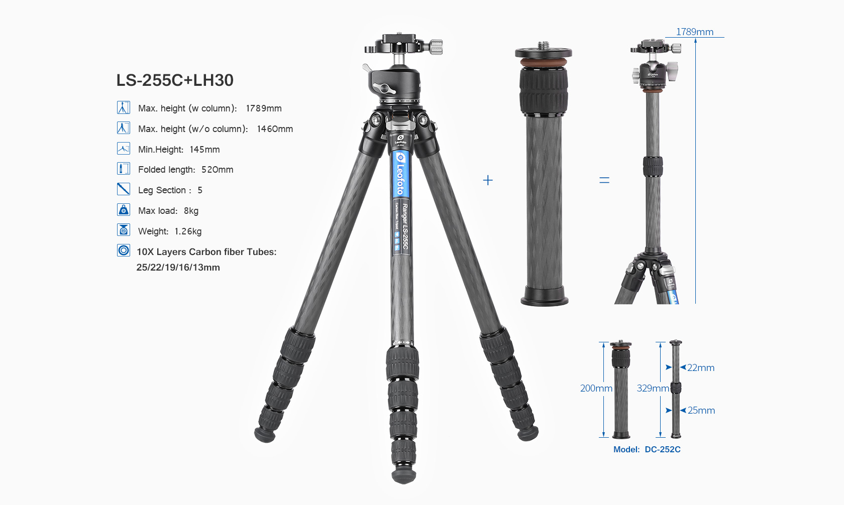 Toray 100% 10-layer carbon fiber leg tubes feature cross rhombus structure for greater strength, stability and less vibration.