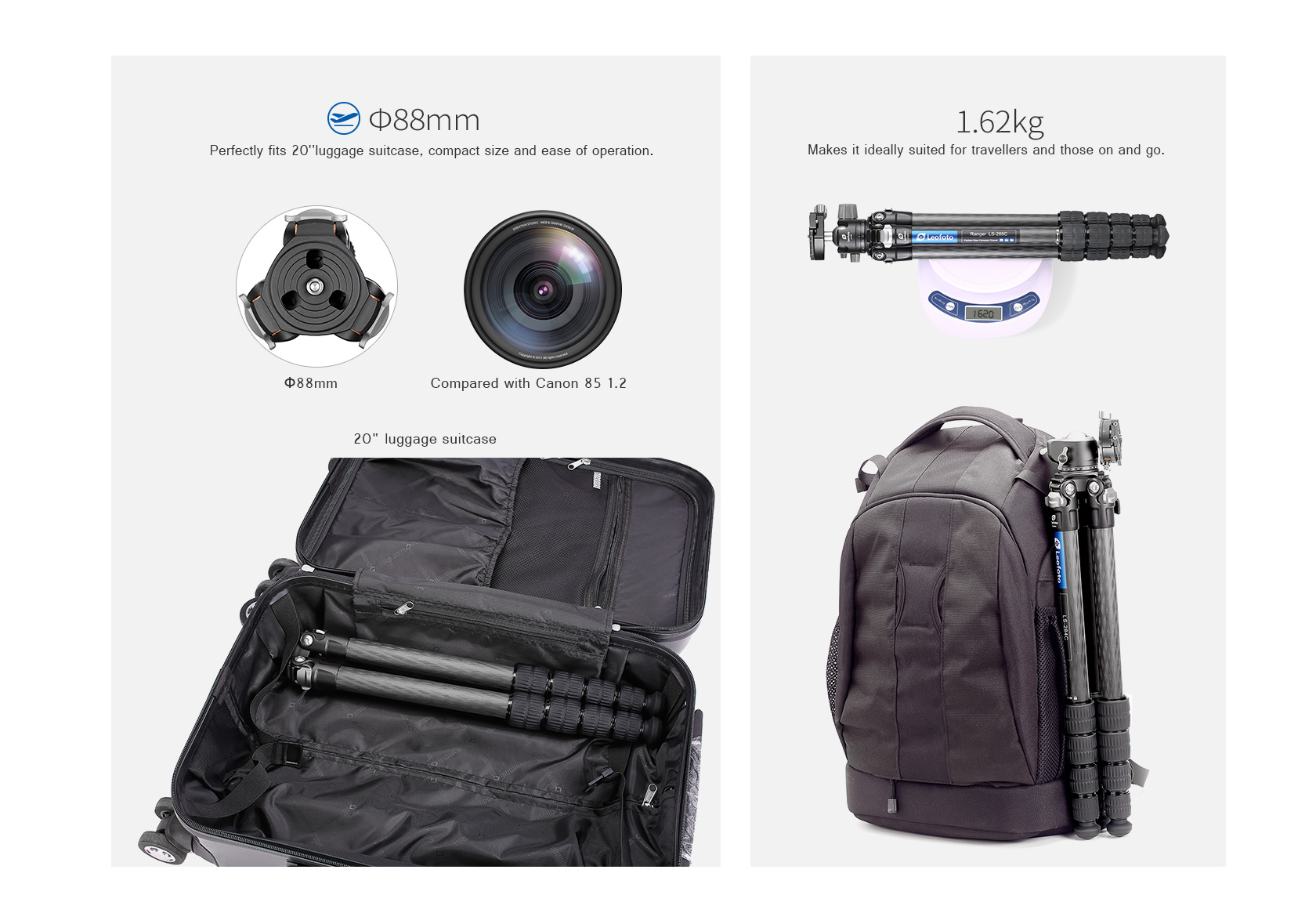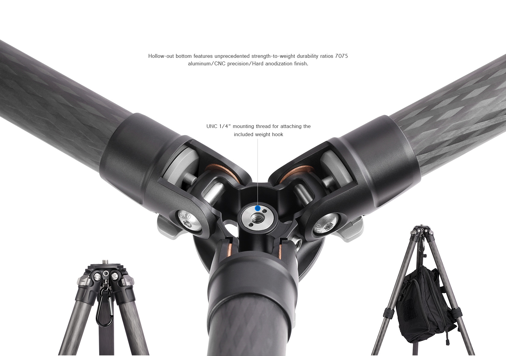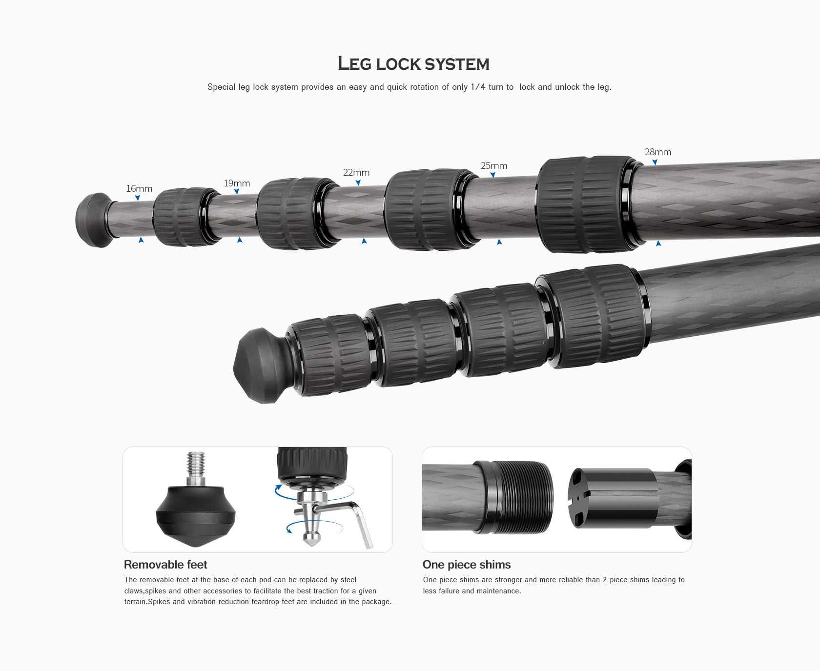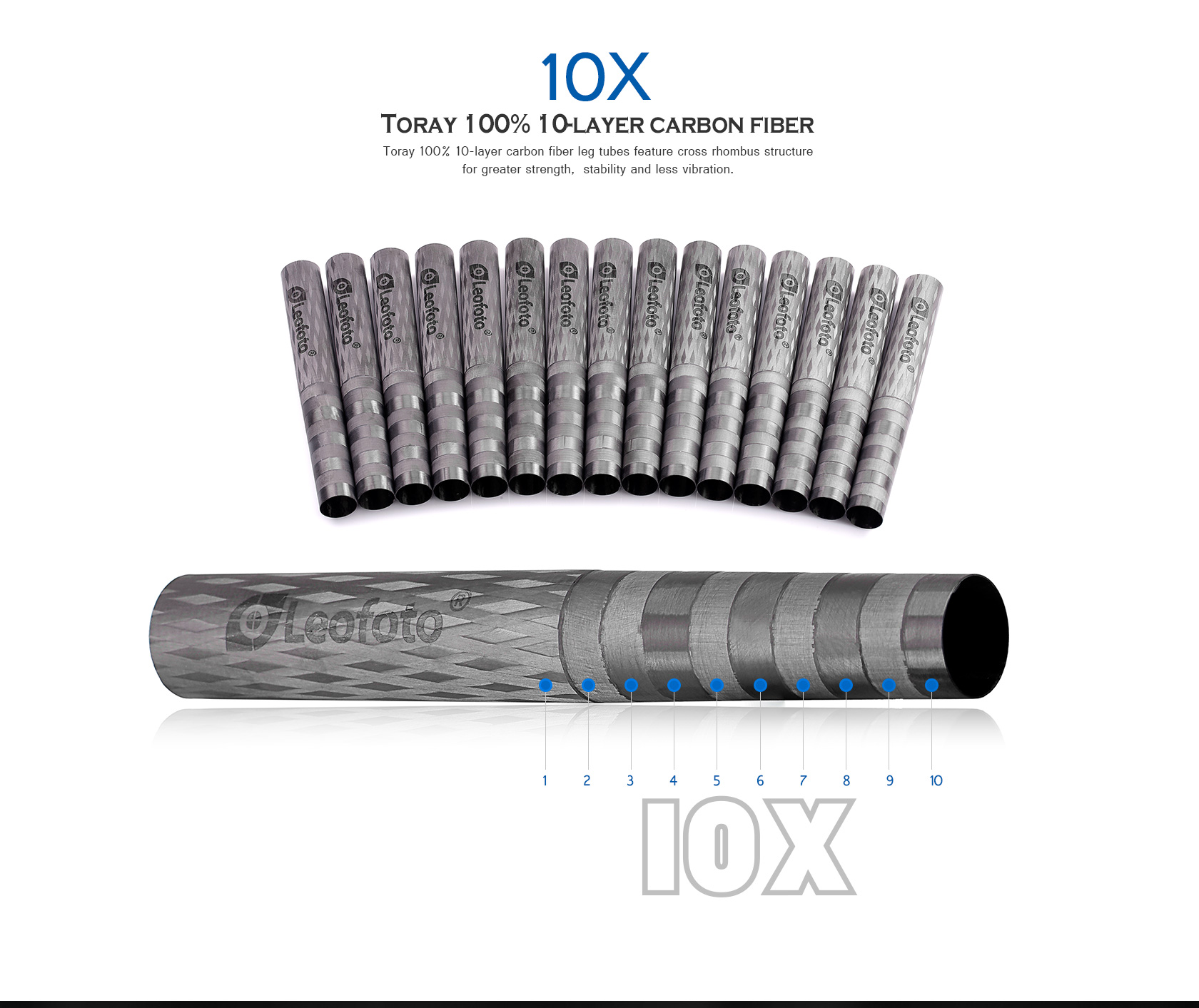 Toray 100% 10-layer carbon fiber leg tubes feature cross rhombus structure for greater strength, stability and less vibration.