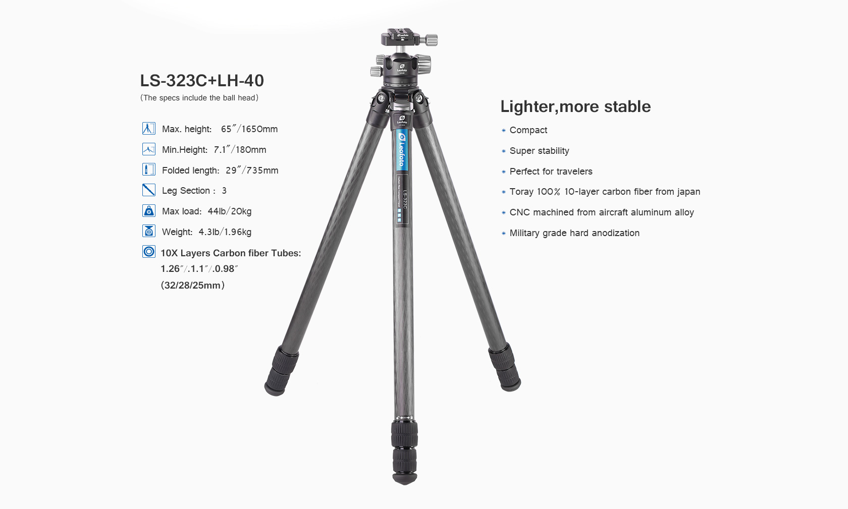 Toray 100% 10-layer carbon fiber leg tubes feature cross rhombus structure for greater strength, stability and less vibration.
