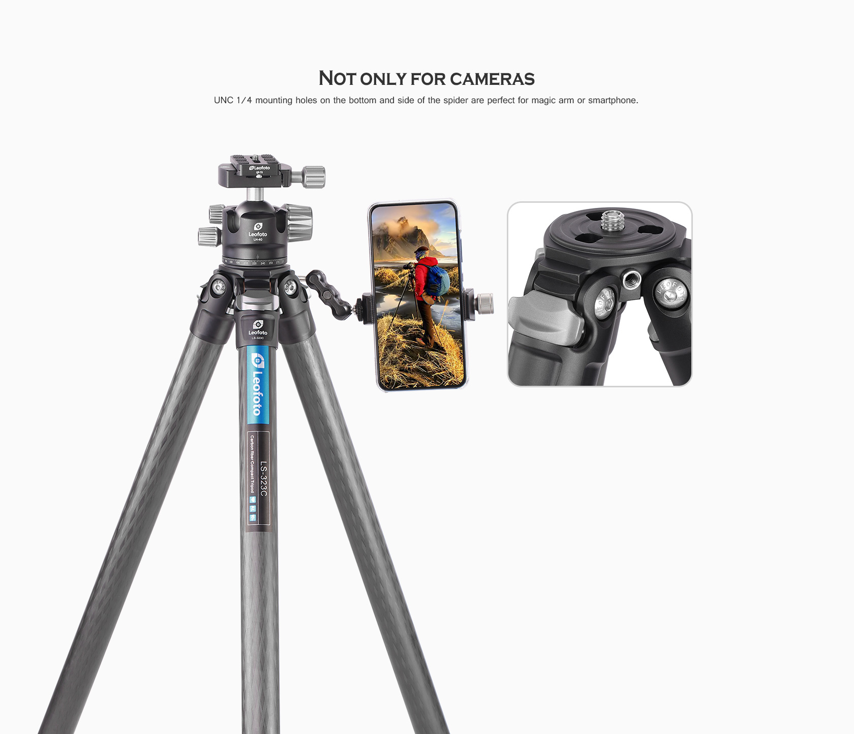 UNC 1/4 mounting holes on the bottom and side of the spider are perfect for magic arm or smartphone.