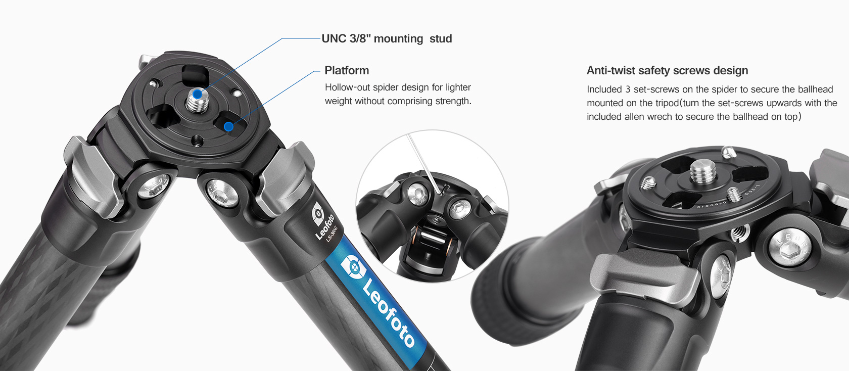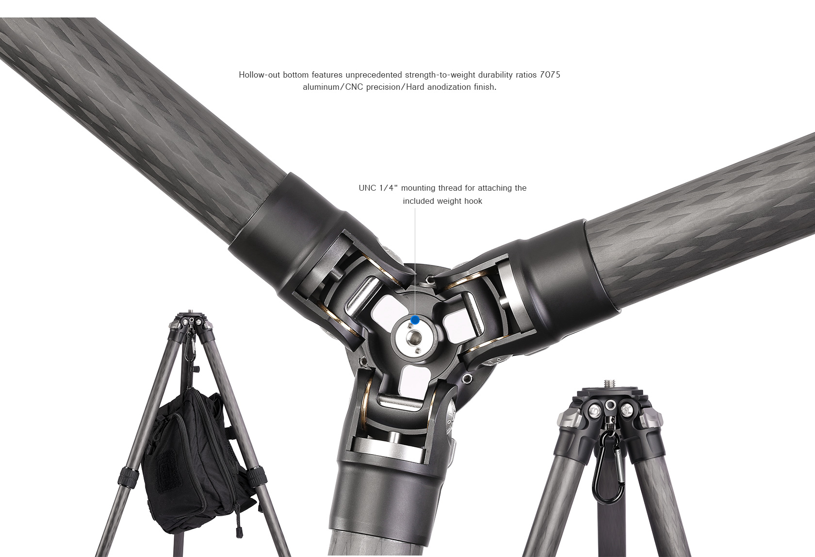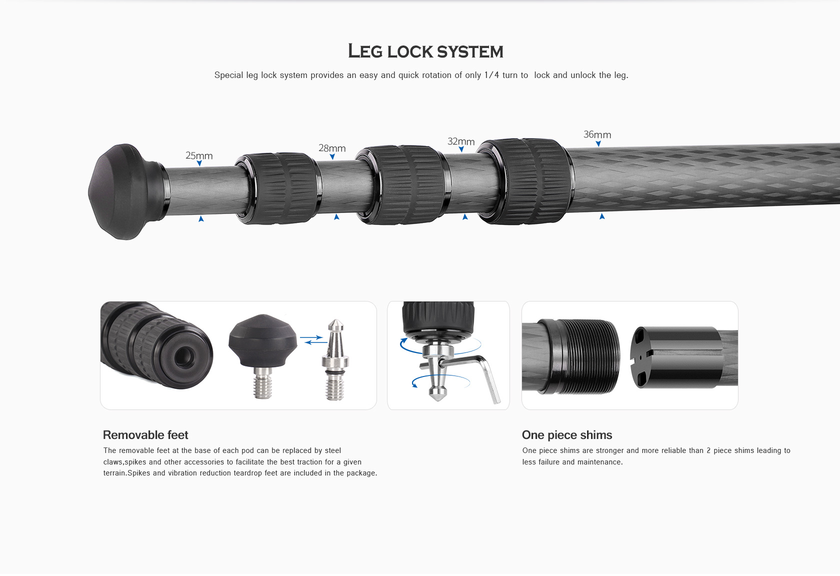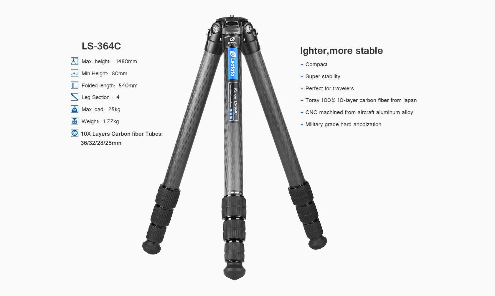 Toray 100% 10-layer carbon fiber leg tubes feature cross rhombus structure for greater strength, stability and less vibration.