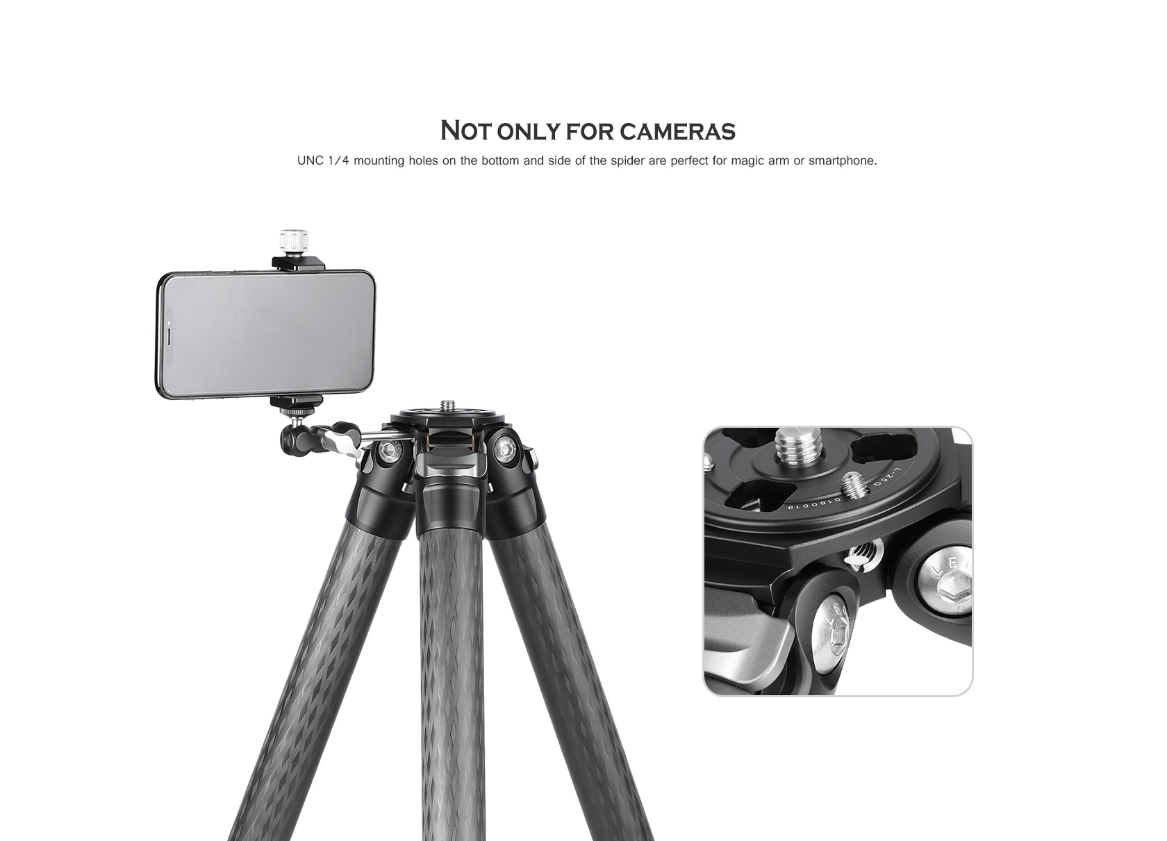 UNC 1/4 mounting holes on the bottom and side of the spider are perfect for magic arm or smartphone.