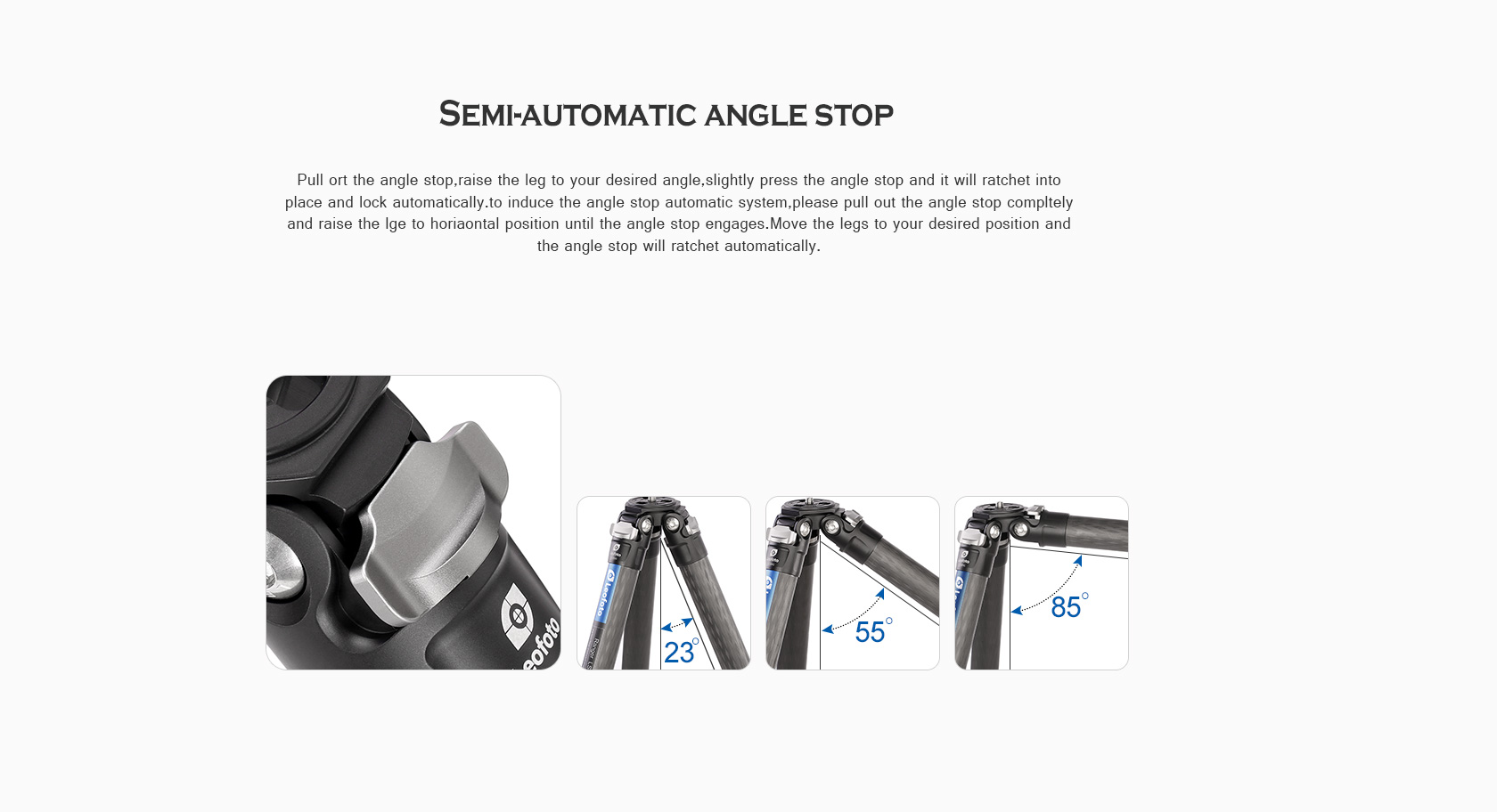 Pull out the angle stop,raise the leg to your desired angle,slightly press the angle stop and it will ratchet into place and lock automatically.To induce the angle stop automatic system,please pull out the angle stop compltely and raise the lge to horiaontal position until the angle stop engages.Move the legs to your desired position and the angle stop will ratchet automatically.
