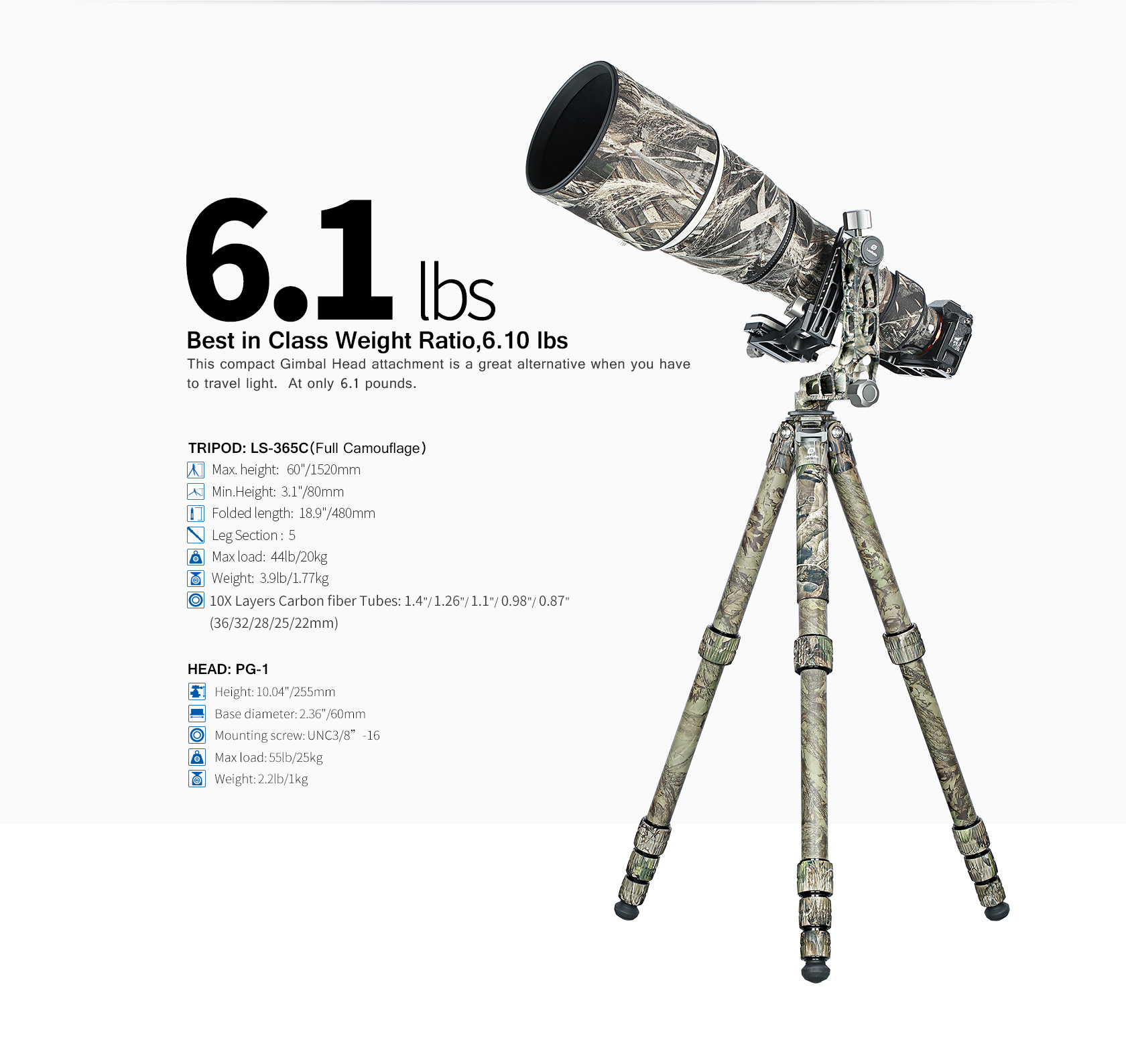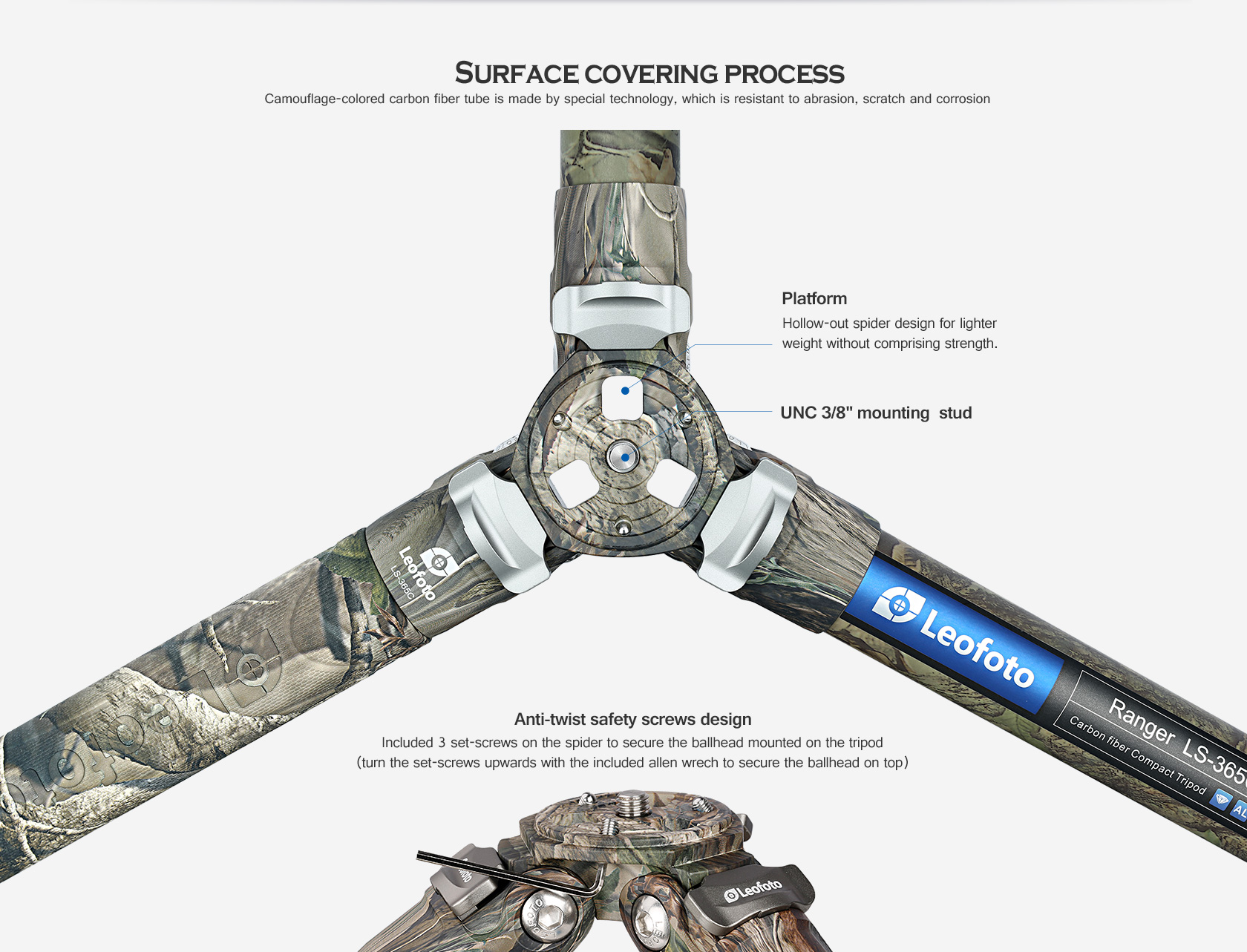 95% of the components including aluminum alloy spider, 10 layers of carbon fiber tube and anti-slip rubber mats are jungle camouflage