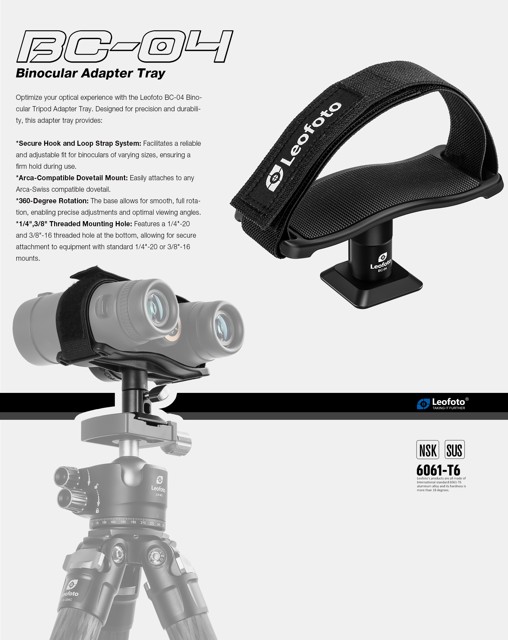 Optimize your optical experience with the Leofoto BC-04 Binocular Tripod Adapter Tray. Designed for precision and durability, this adapter tray provides: