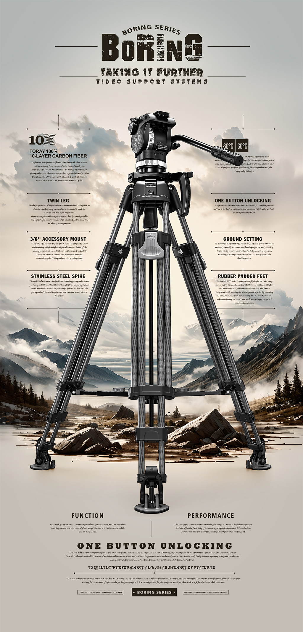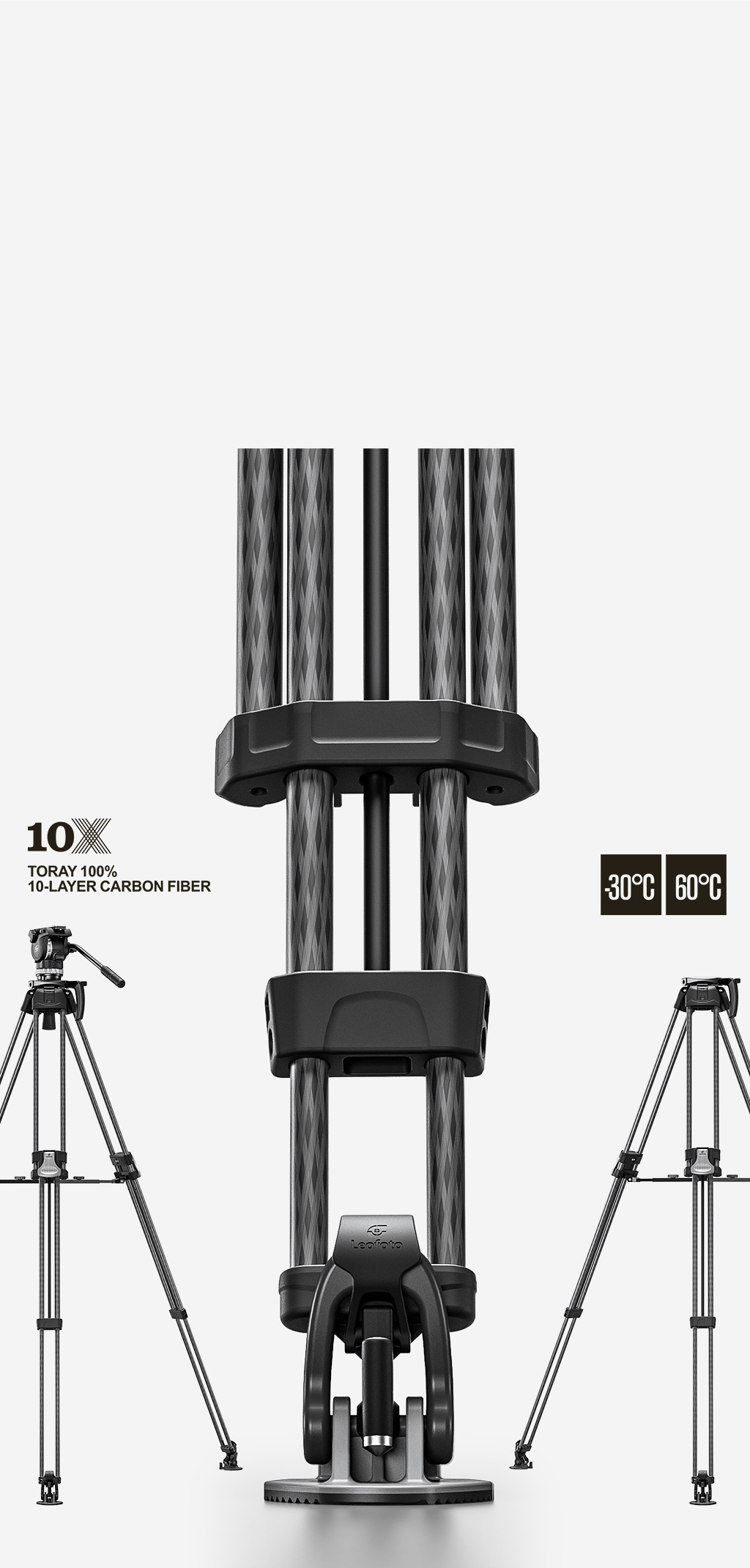 The Leofoto LVF Series tripods feature dual leg tubes which offer greater rigidity and stability with two points of connection to the apex, the perfect choice for high-end cinematography and video. Traditional video tripods only come with a middle spreader system, but the LVF Series comes with an adjustable spreader system which enables the user to switch between a ground and mid-level spreader adding flexibility. These tripods are made of carbon flber for light weight and have the ability to collapse into a compact size for portability.