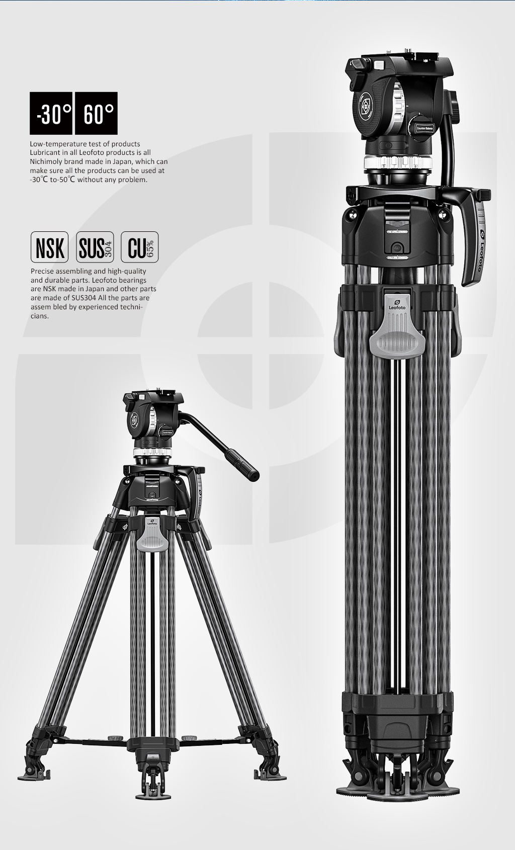 Stainless steel spike feet and hoof-shaped rubber feet make the tripod more flexible in different environments.