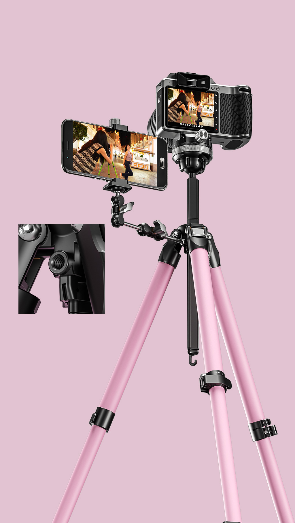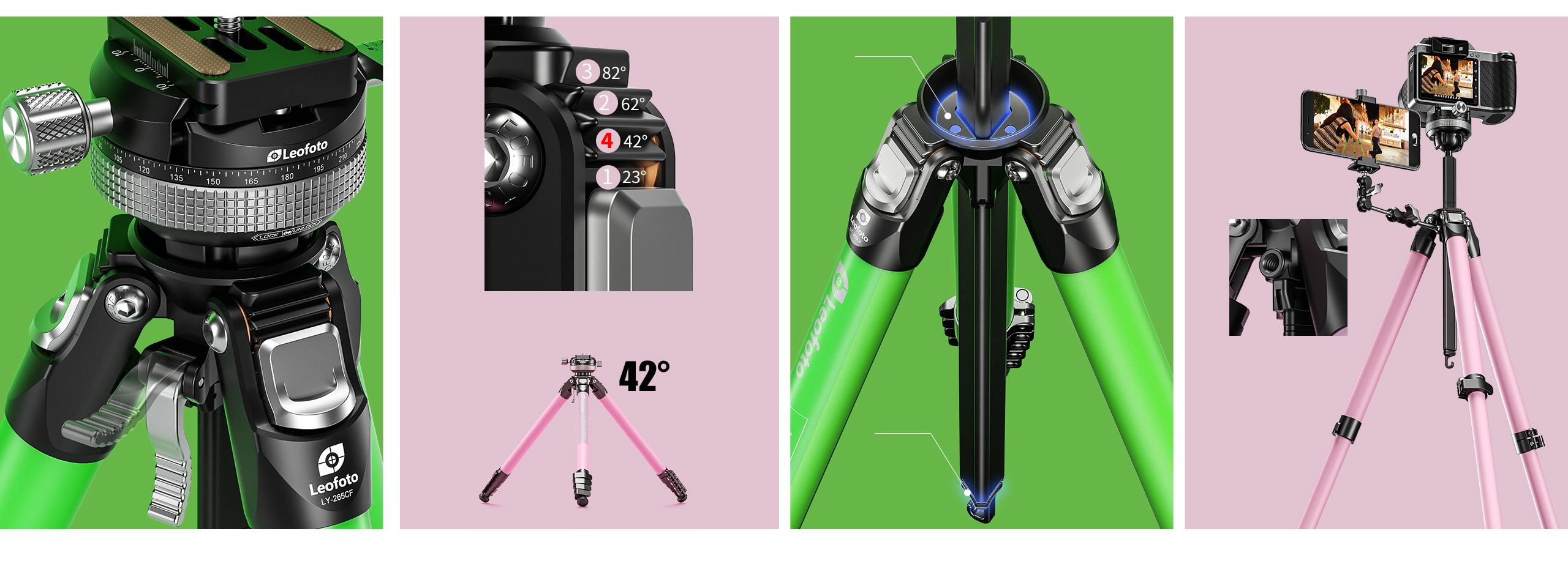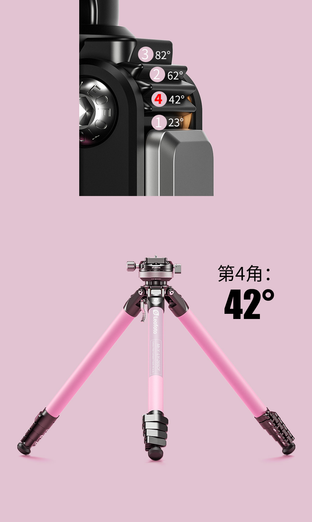 Most of the tripods in the market are with only angles including low, middle and high angles. To help photographers who go windy outdoors for shooting, we add a 42° setting to the tripod to make sure that even in windy outdoors, the shooting can still be stable.