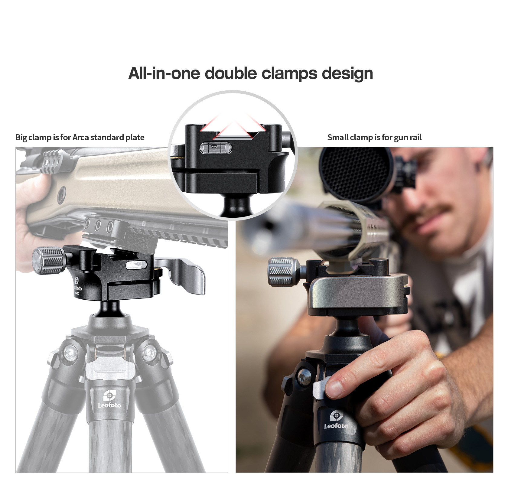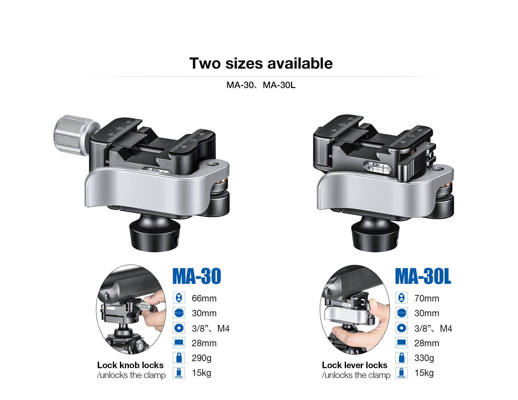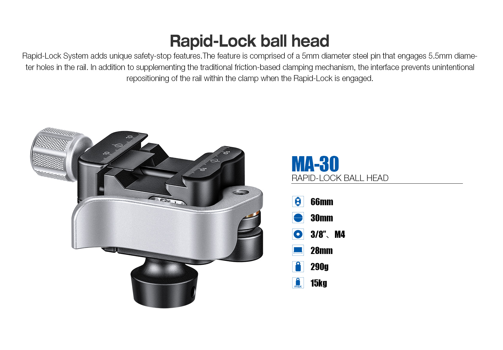 The head has a lever release to lock/unlock the ball and a redesigned lever-release clamp system with an adjustable clamping width.