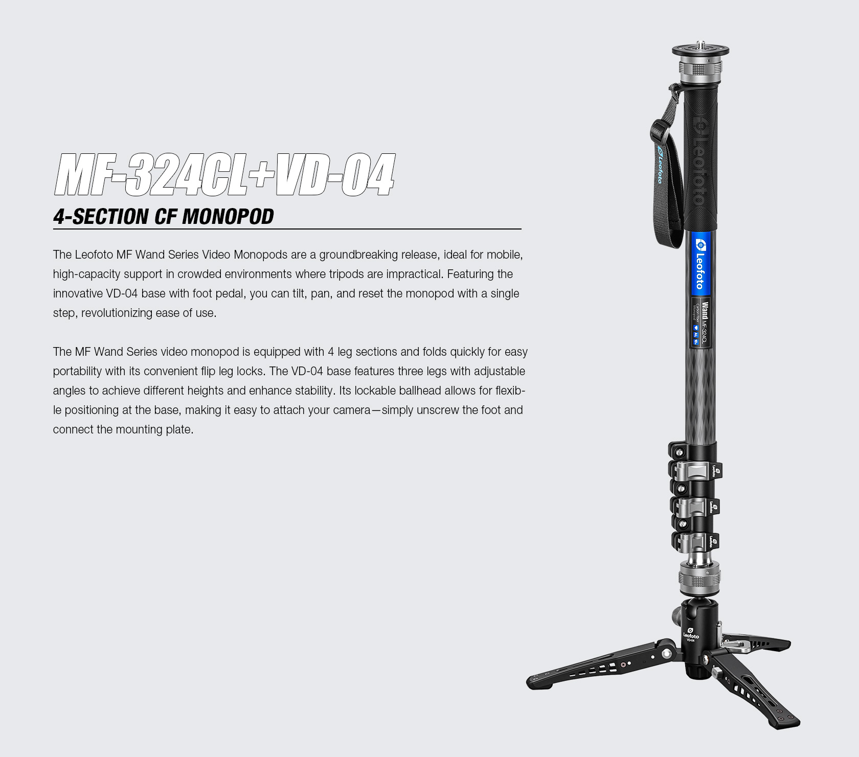 The Leofoto MF Wand Series Video Monopod is a groundbreaking release, ideal for mobile, high-capacity support in crowded environments where tripods are impractical. The monopod features 4 leg sections with convenient flip locks for quick folding and easy portability.