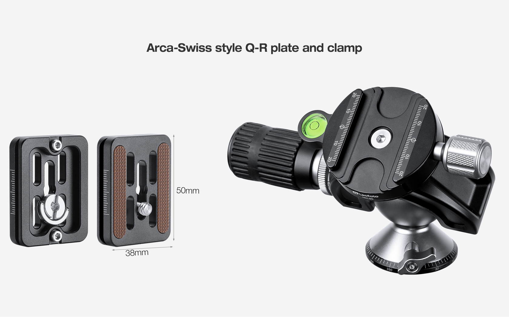 The integrated Arca-type quick release set uses a classic clamping knob and has a precision scale for fast balance and repeatable setups. The included BPL-50N quick release plate has rubberized, non-marring traction pads to prevent movement.