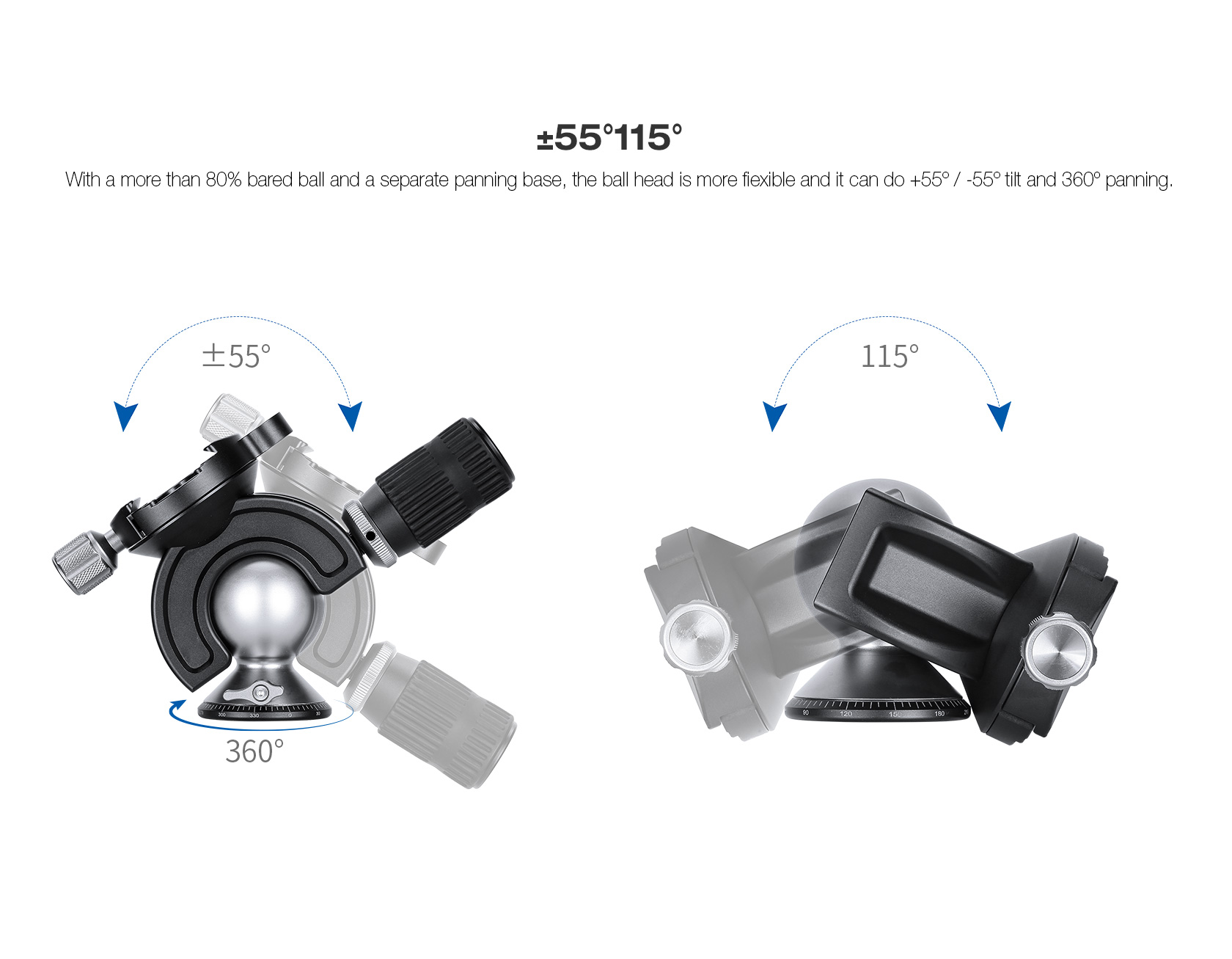Leofoto MH-60 Full Dynamic Ball Head with Handlebar Control is designed for photographers, shooters, hunters. It features a motorcycle throttle-style main knob for rapid adjustment. With a more than 80% bared ball, it can provide a +/-55° tilt range, and the separate panning base features an independent locking knob and full 360° rotation. The friction tension can be adjusted and locked in place on the main control knob, which can extend in length from 70 to 92mm for finer control and improved ease of use when wearing gloves in cold conditions. The precision-machined 2.4″-diameter ball makes movement silky smooth, while providing a robust load capacity of 66 pounds.